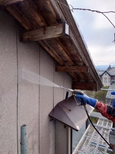 M様邸、外壁 高圧洗浄の様子です。 古い塗膜や汚れをよく落として綺麗にする作業になります。