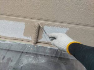 写真を見ると、下塗り材(白い塗料)と中塗り材の色の違いが分かりますね✨ 中塗り材は、外壁の仕上がりのお色になります。