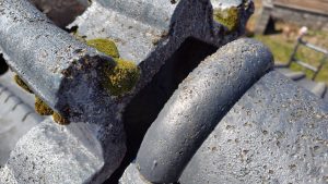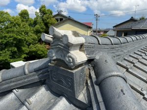 鬼瓦と土台のモルタル部分が経年劣化の影響で、 セメントが崩れてしまい、固定されていない状態でした。