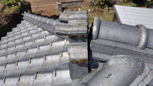 T様邸の屋根の現状を見させていただいた所… 鬼瓦と棟瓦をつないでいる金具が錆びていて、 金具がなくなっていました。