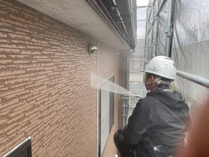 高圧の水で外壁に付いている汚れや痛んでいる塗膜を綺麗に洗い流します!!