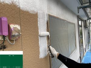 塗らない部分はしっかりと養生作業を行い、下塗り塗装を行います。 下塗り材が白いので、元々の色がどんどん隠れていく様子が分かりますね♪ ※透明な色の下塗り材もあります?