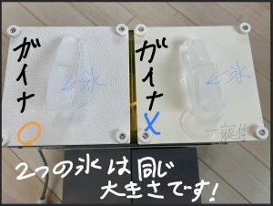 実際に実験台を使ってガイナを塗った板と塗ってない板に熱をとおしてその上に氷をのせて、氷の解け方を調べてみたので紹介します