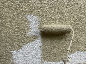 中塗り材は、アステックペイントのシリコンREVO1000を使用して塗装していきます!! 「耐候性」・「低汚染性」の特徴のある塗料になります? 柔らかい印象のカラーで仕上がりが楽しみですね?