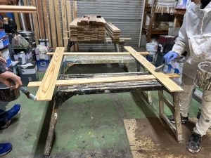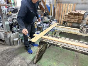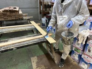 本日は、腰壁を設置する前に腰壁の板に塗装を行っている様子です❕❕
