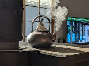 常に薪ストーブの上でシュッシュ言っていますが、実はこのやかんご縁があってお知り合いから頂いた年代物です。古民具が好きな私としてはそのフォルムがとってもお気に入りです(^^)