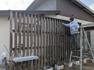 さて、この陽気に誘われて弊社の玄関前の木塀も