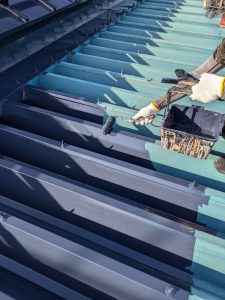 もともとの屋根(水色)から錆止め兼用塗料を使いつつ、最終的にはシックな色味のグレーに衣替えするのでシッモダンな印象に生まれ変わります。