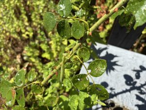 まだ子供の様な薄い色味のカマキリでしたが、暑い中水まきを喜んでいるようにも見えました?