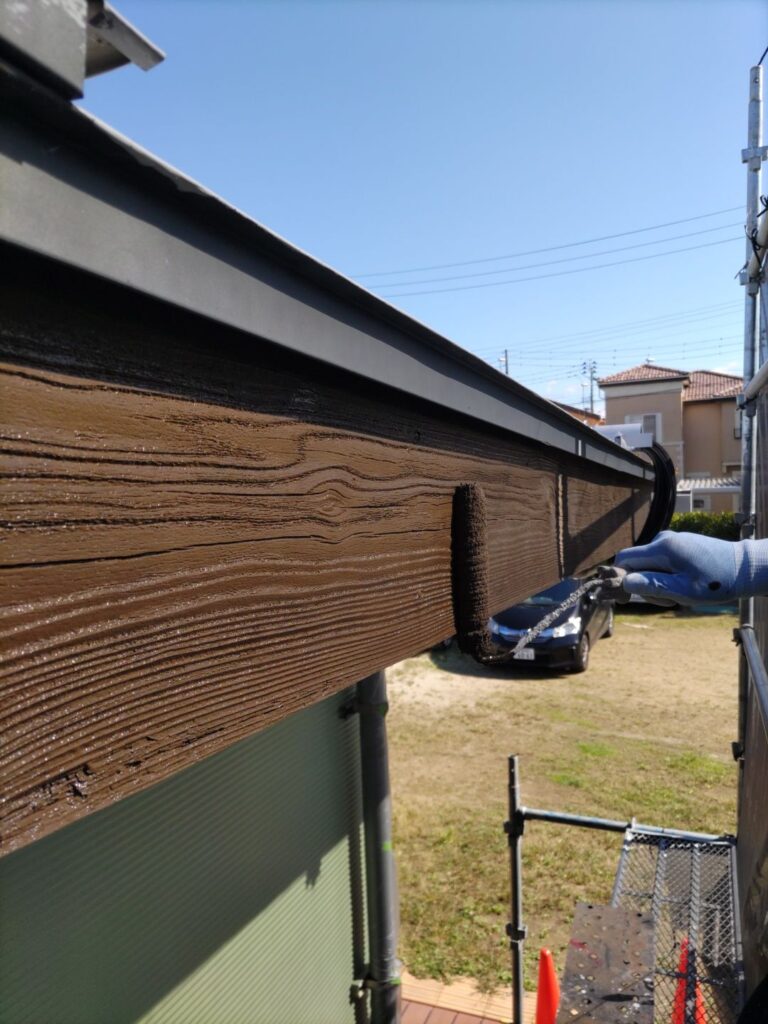 新発田市のI様邸の屋根塗装において、耐久性を高めるための「上塗り」作業を行いました。屋根は常に紫外線や雨風に晒されるため、上塗りは建物を保護する上で非常に重要な工程です。職人たちは、塗料の性能を最大限に引き出すため、均一に、そして丁寧に塗膜を形成していきました。また、建物の細部を彩る付帯部(軒天や破風、雨樋など)の塗装にも力を入れました。まず、付帯部の塗装では、下地の状態をしっかりと確認し、「軒天さび止め」と「下地調整」を丁寧に行いました。これにより、塗料の密着性を高め、剥がれにくい丈夫な塗膜を作ることができます。