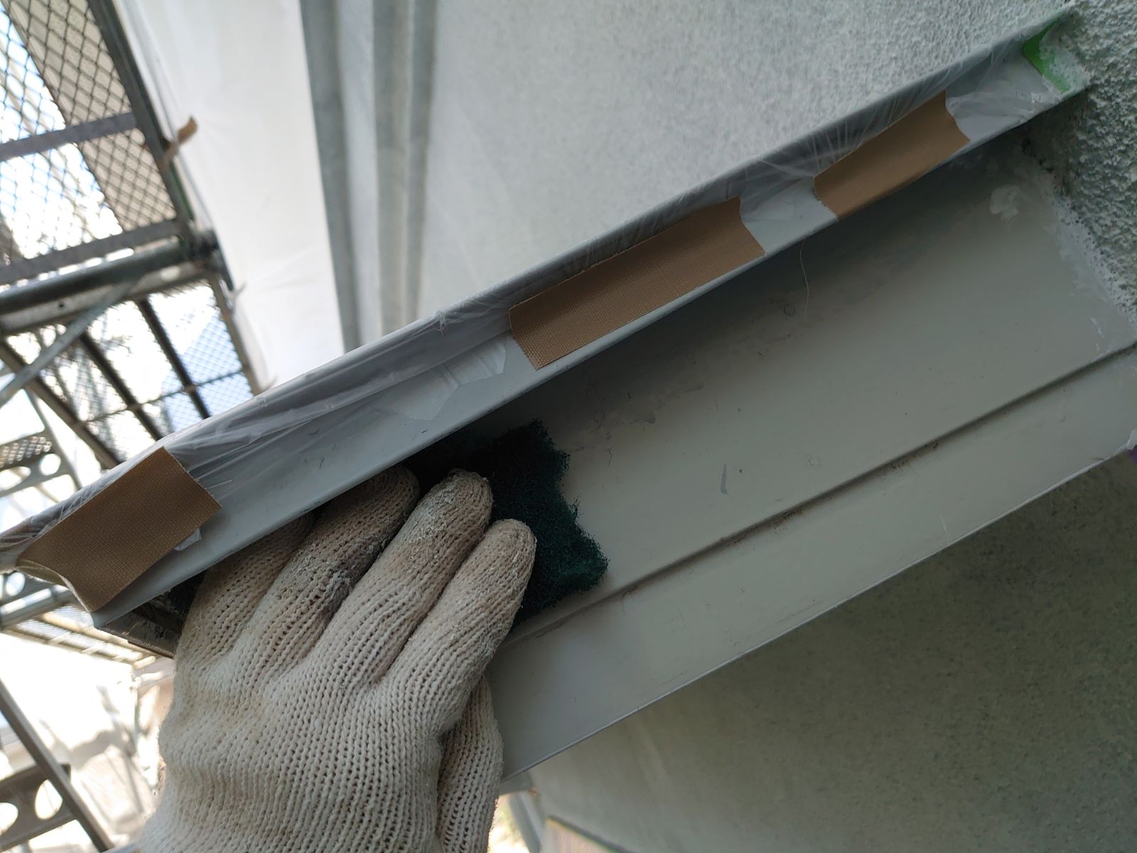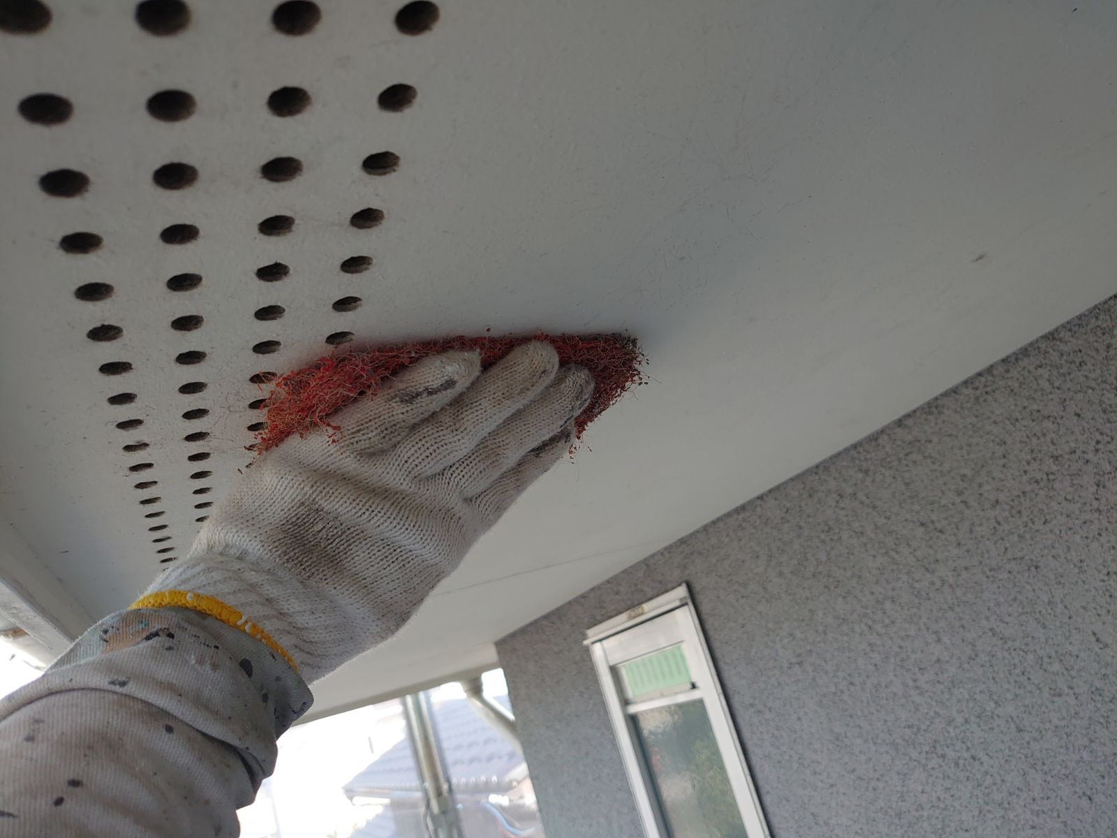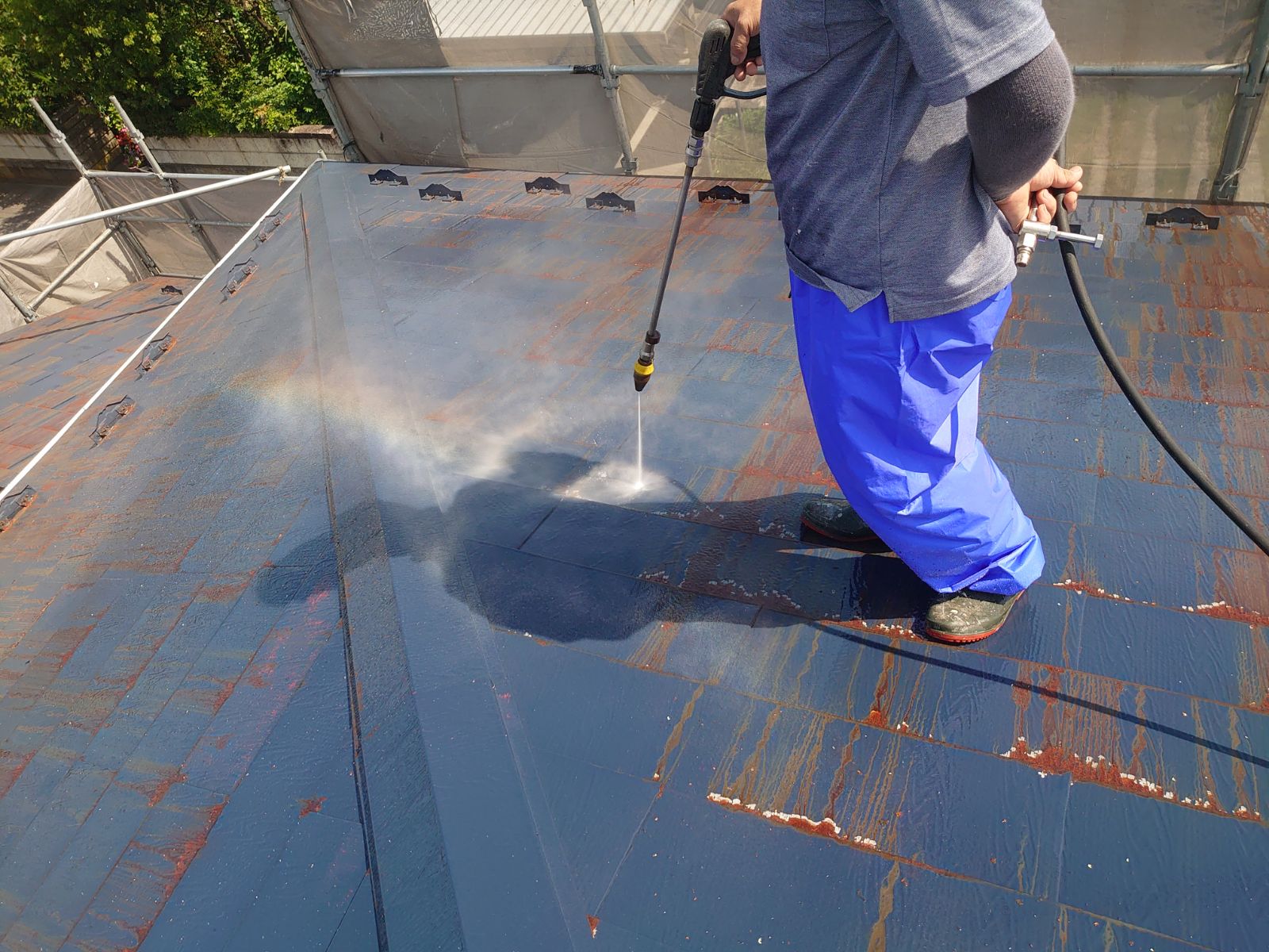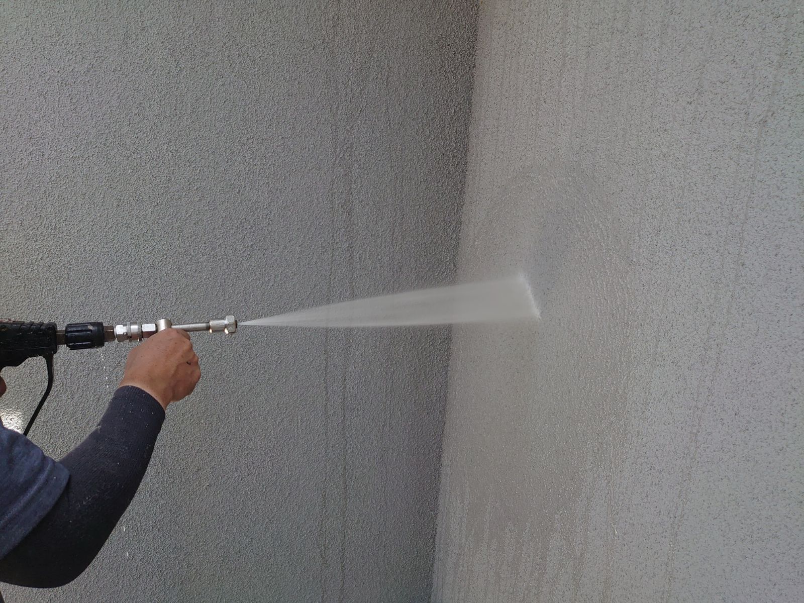 高圧洗浄作業中:古い塗膜や汚れなどを綺麗に洗います。