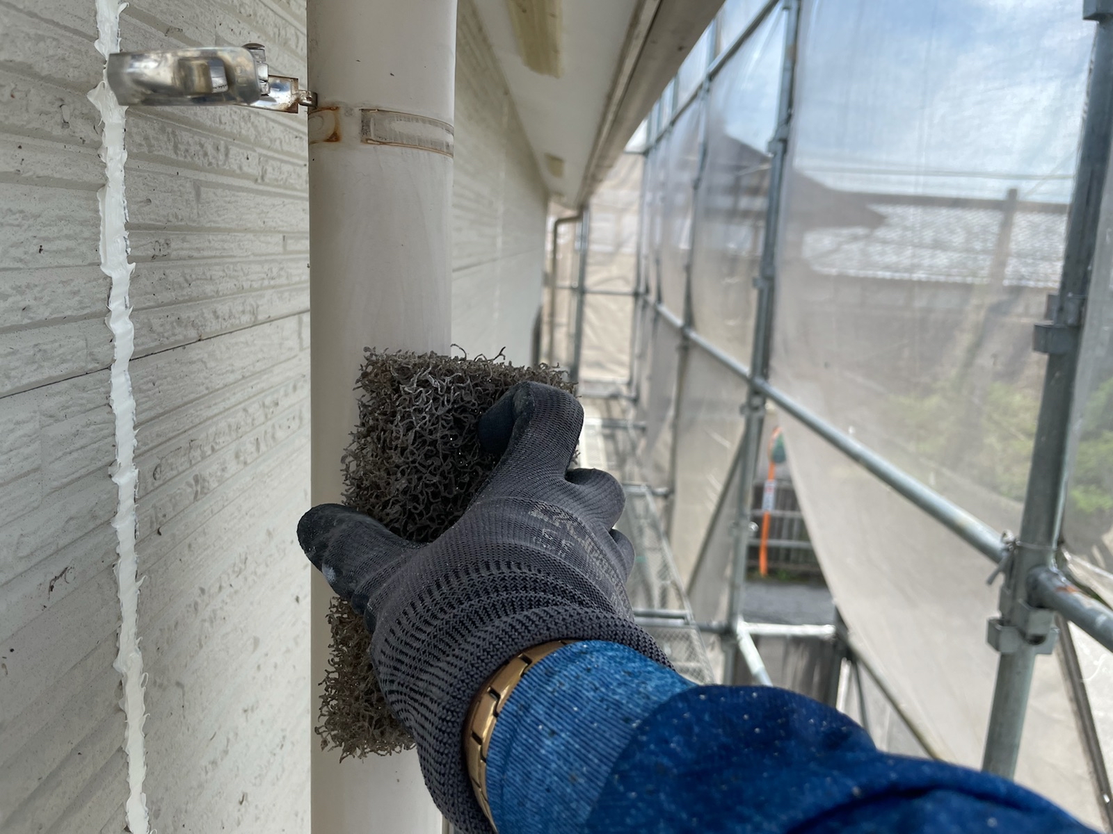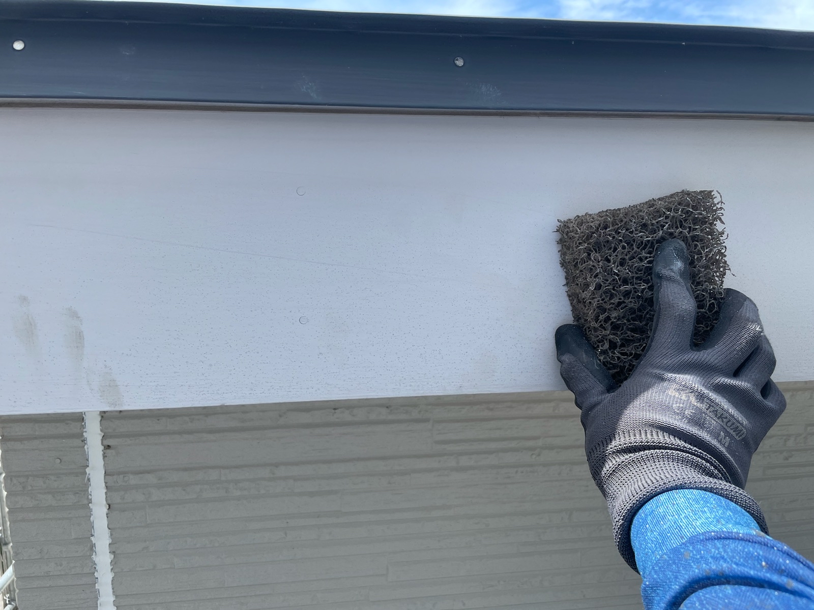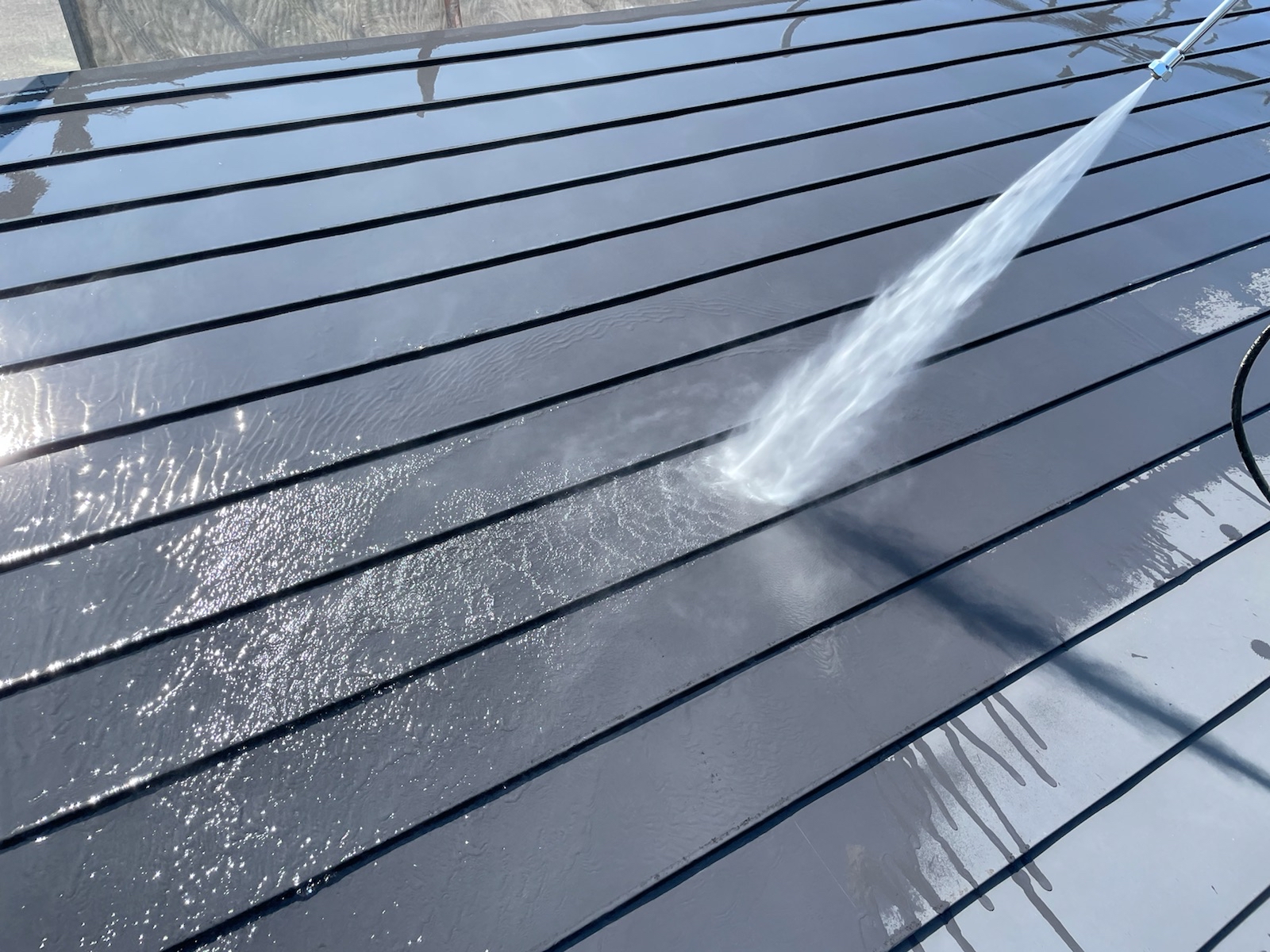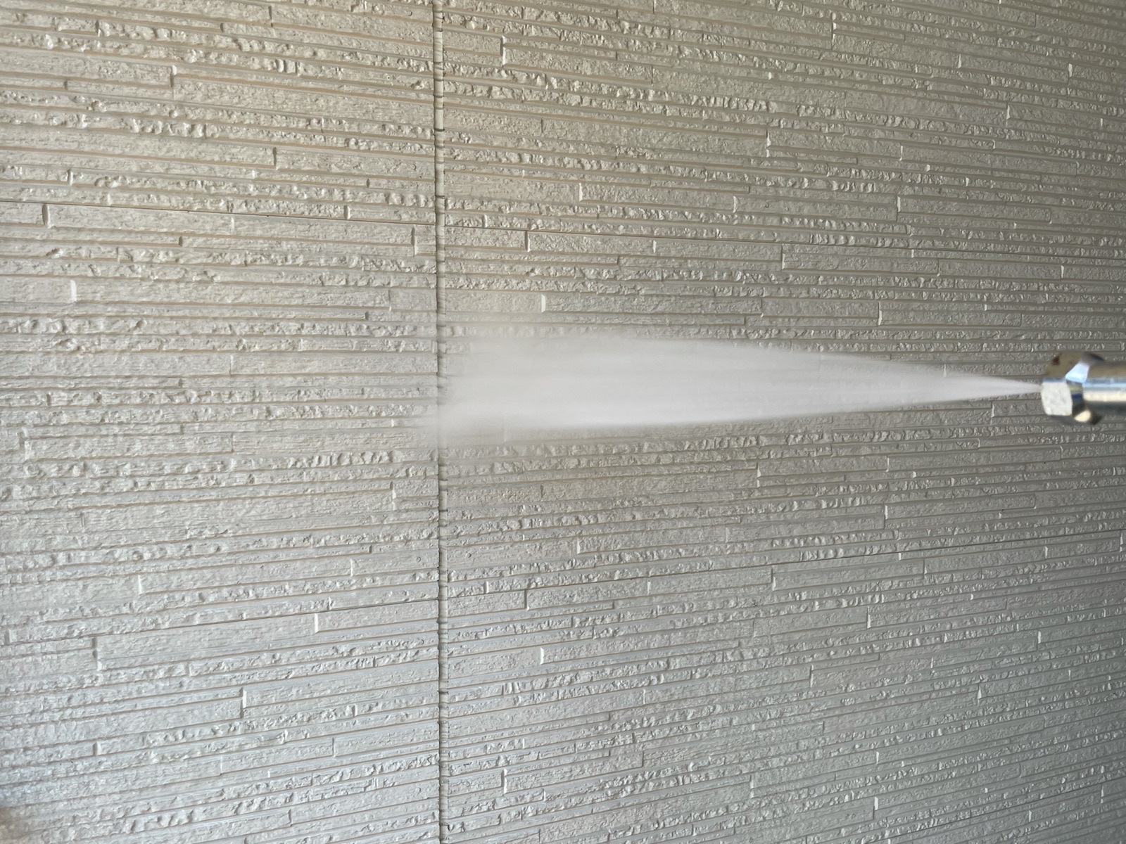 高圧洗浄作業中:古い塗膜や汚れなどを綺麗に洗います。