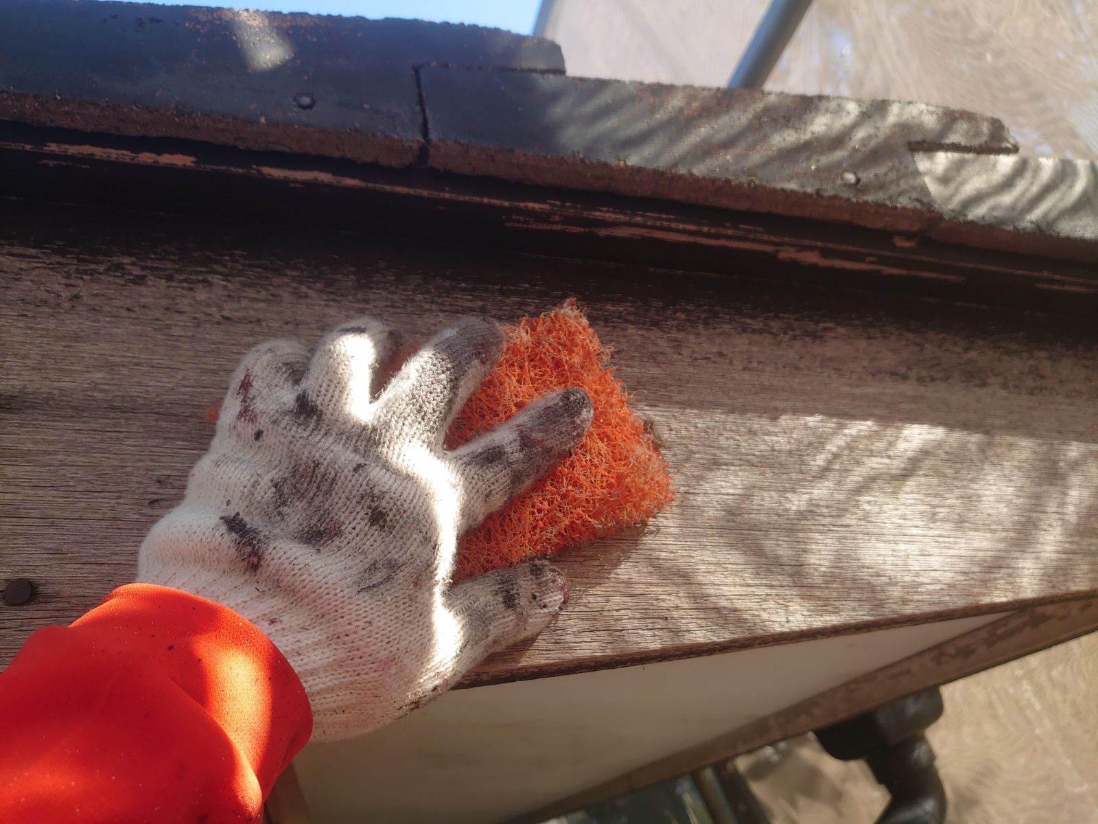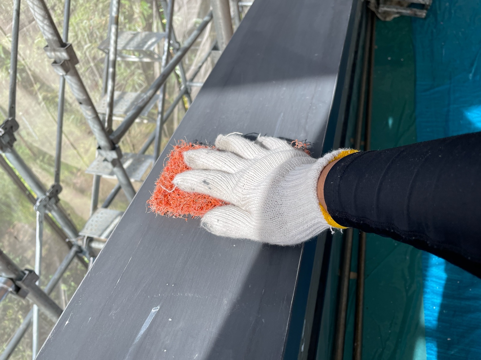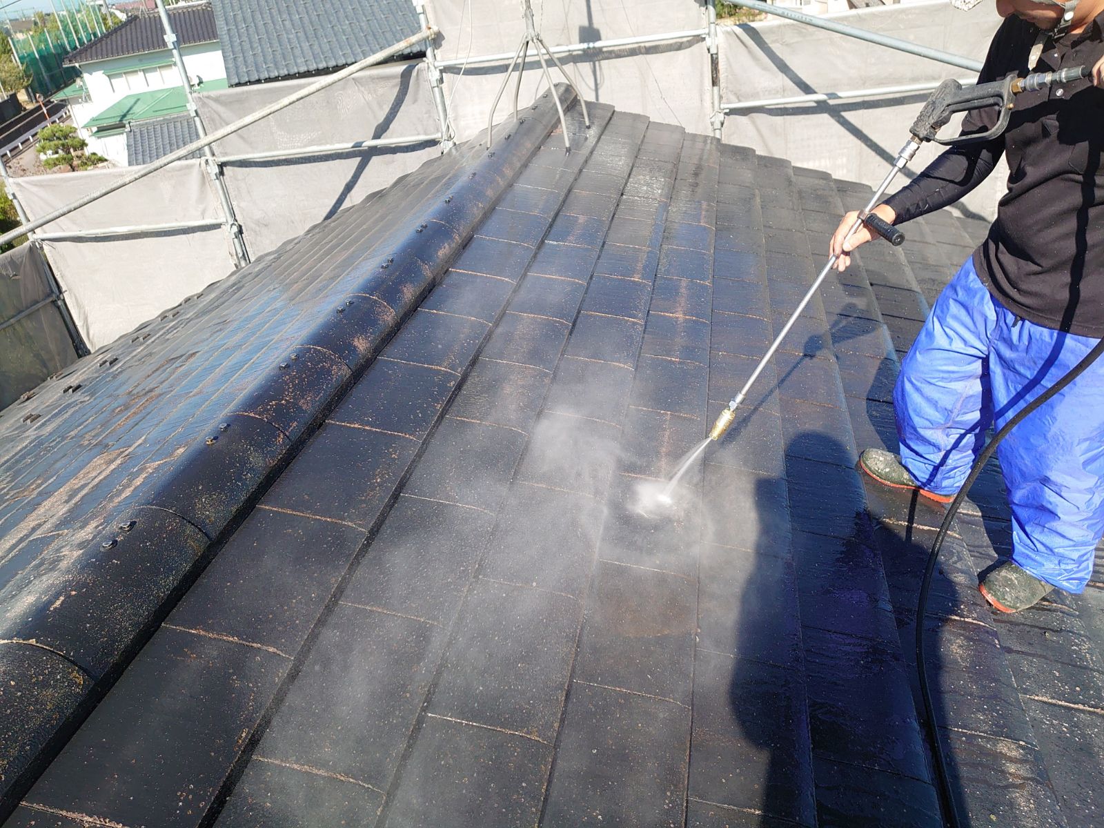 高圧洗浄作業中:古い塗膜や汚れなどを綺麗に洗います。