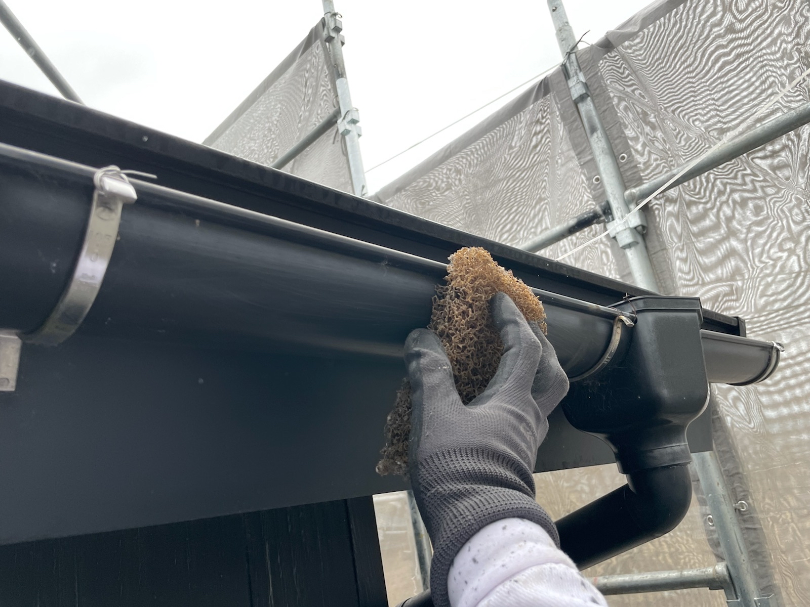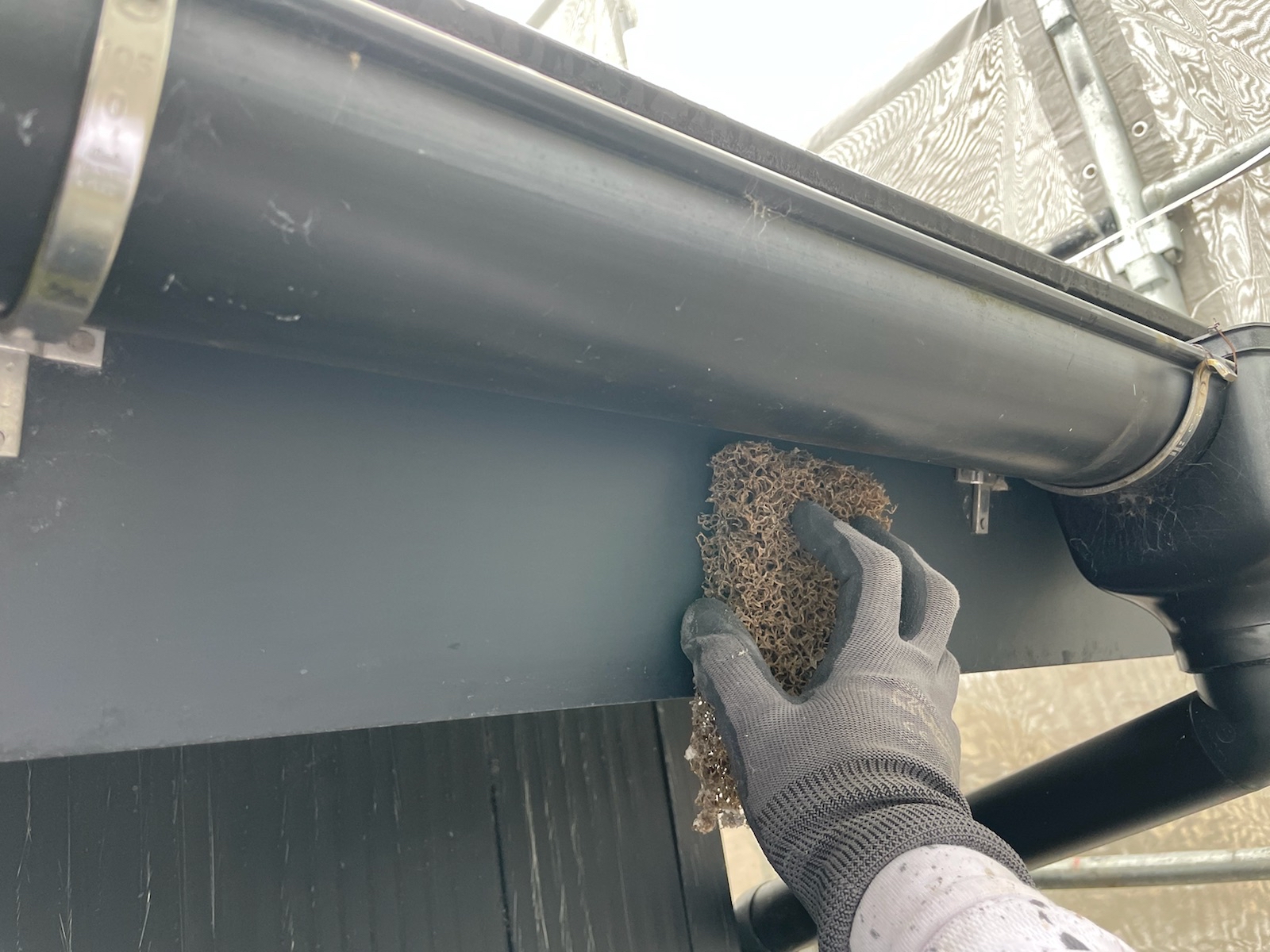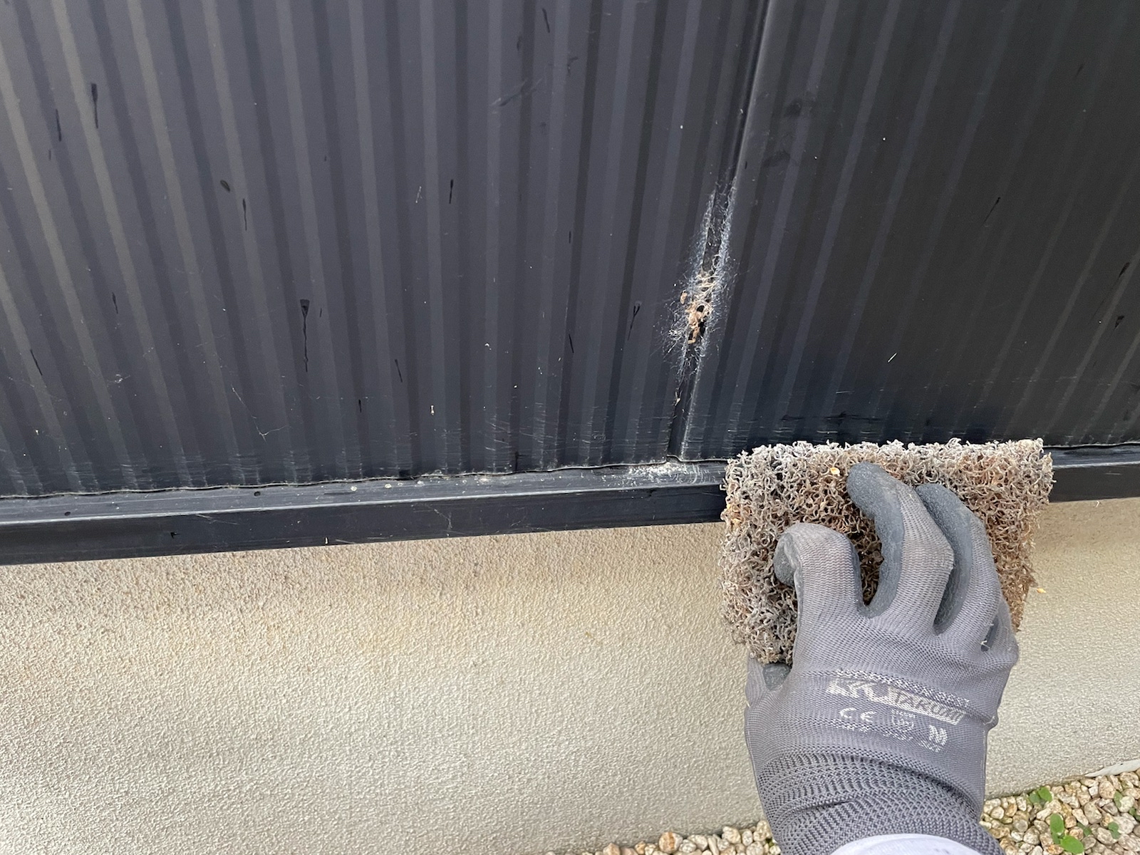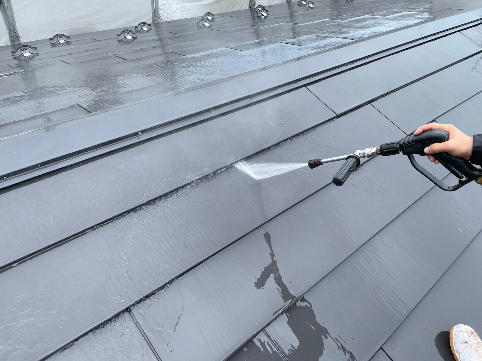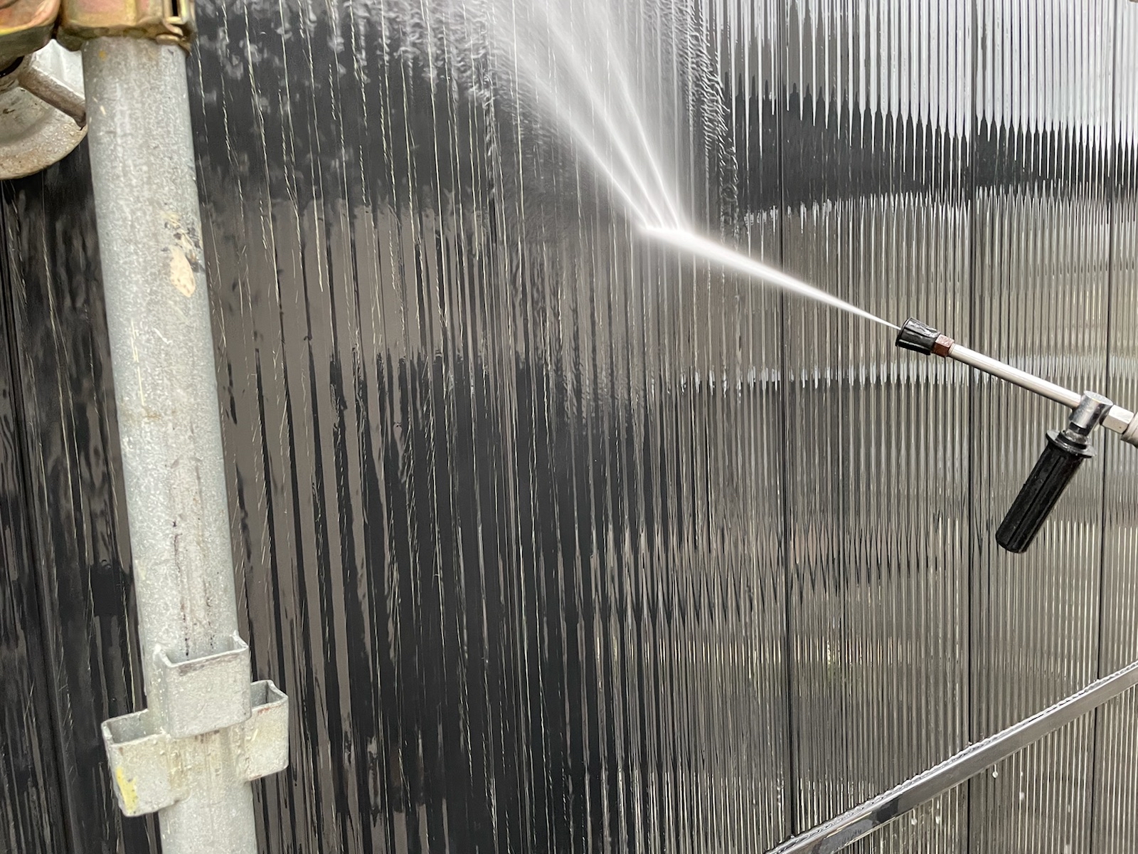 高圧洗浄作業中:古い塗膜や汚れなどを綺麗に洗います。