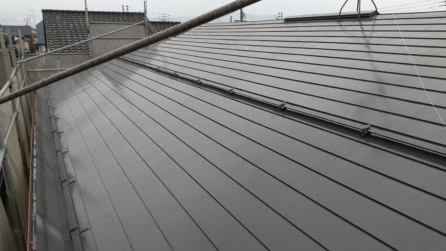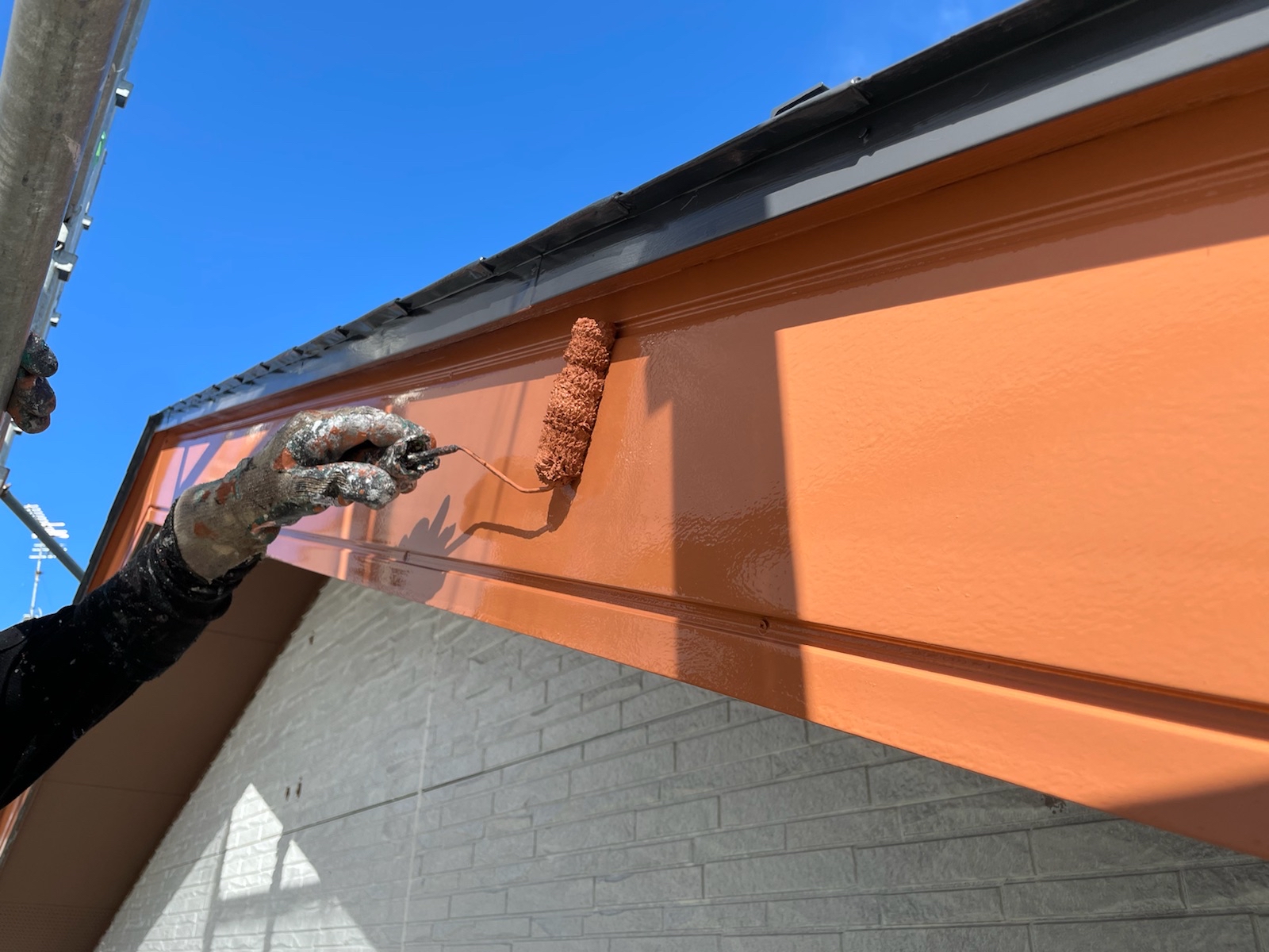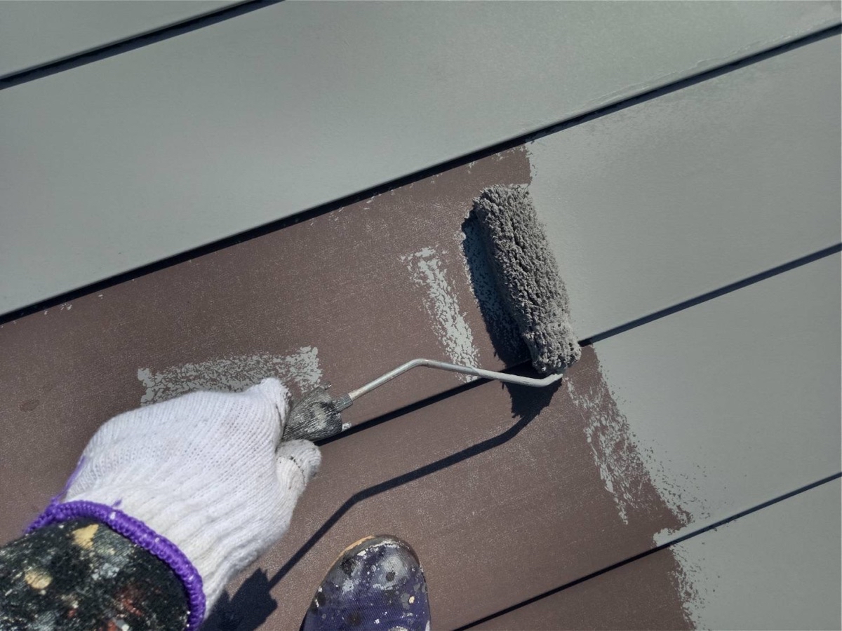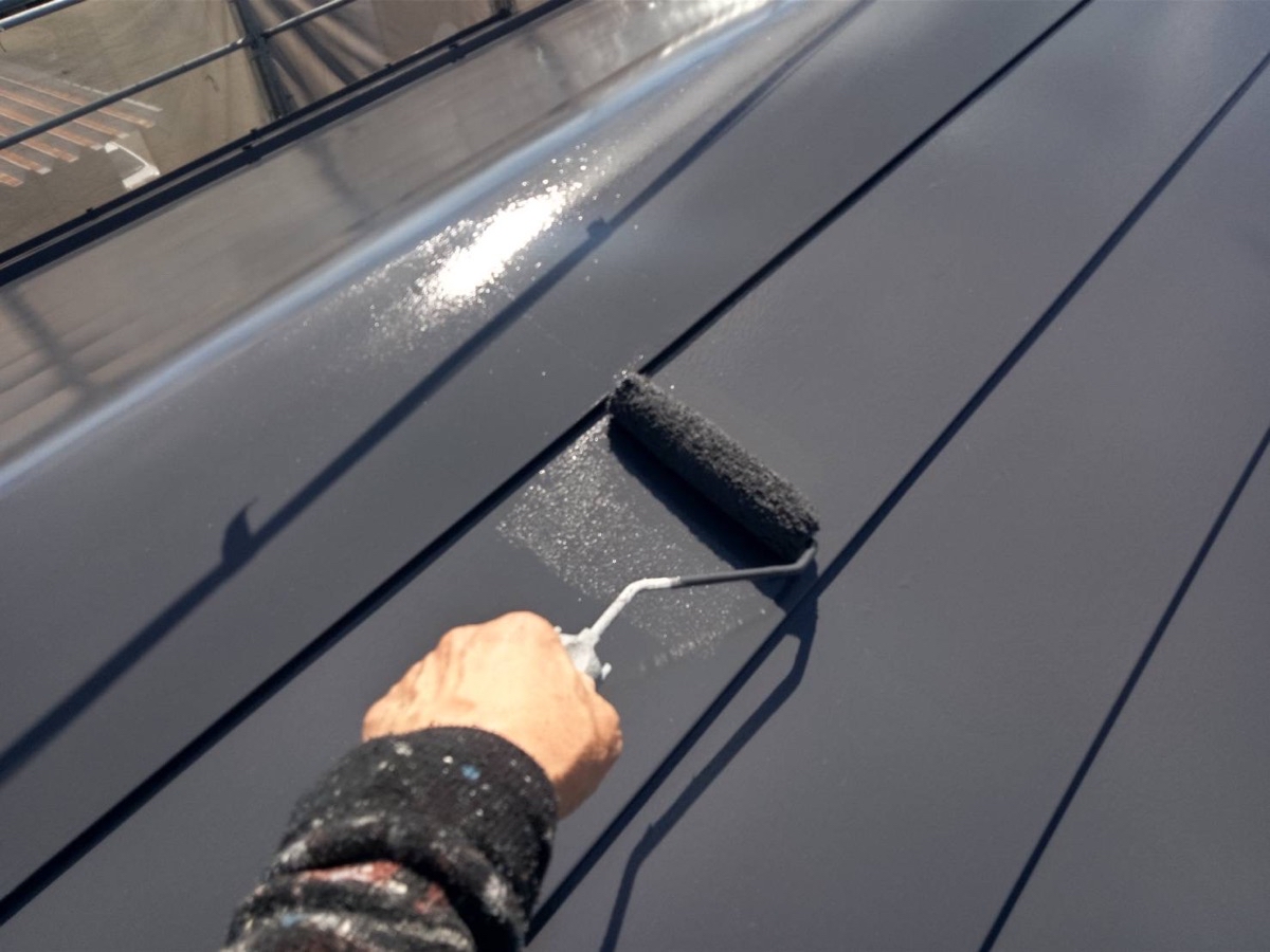 屋根:中・上塗り作業中 上塗り材は、アステックペイントのスーパーシャネツサーモSiを使用しました。