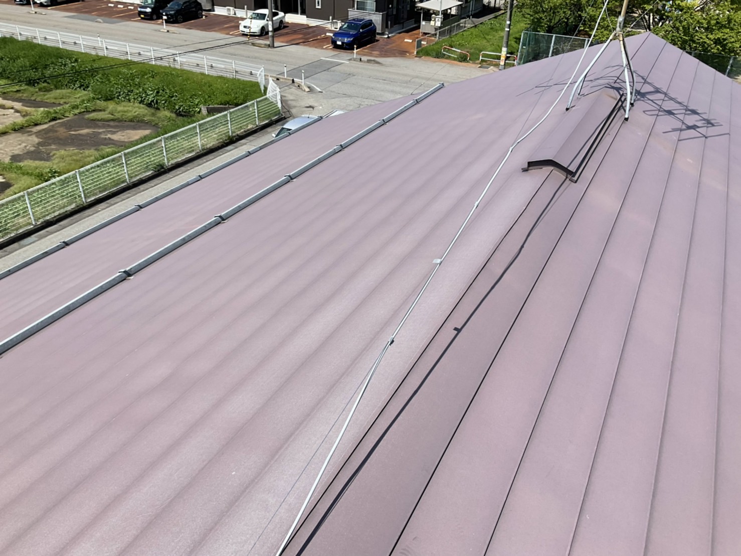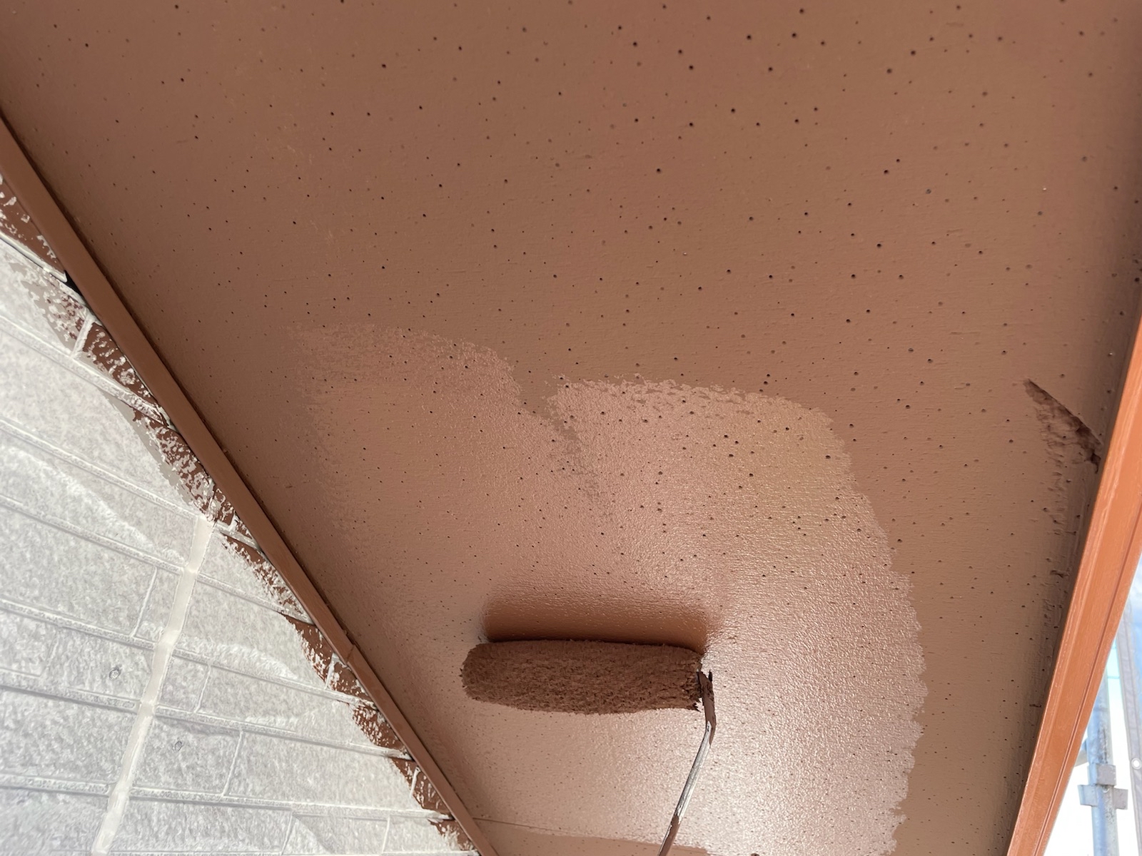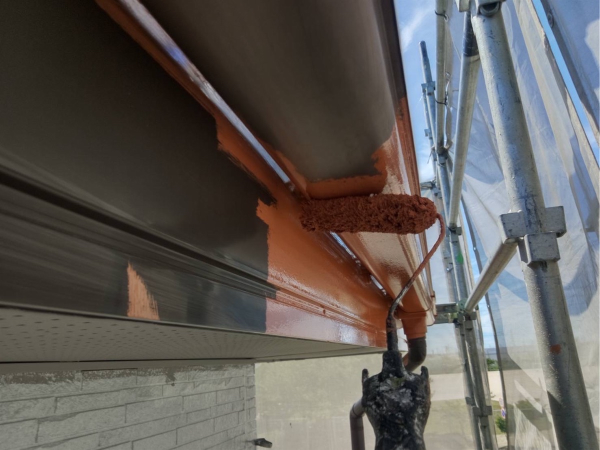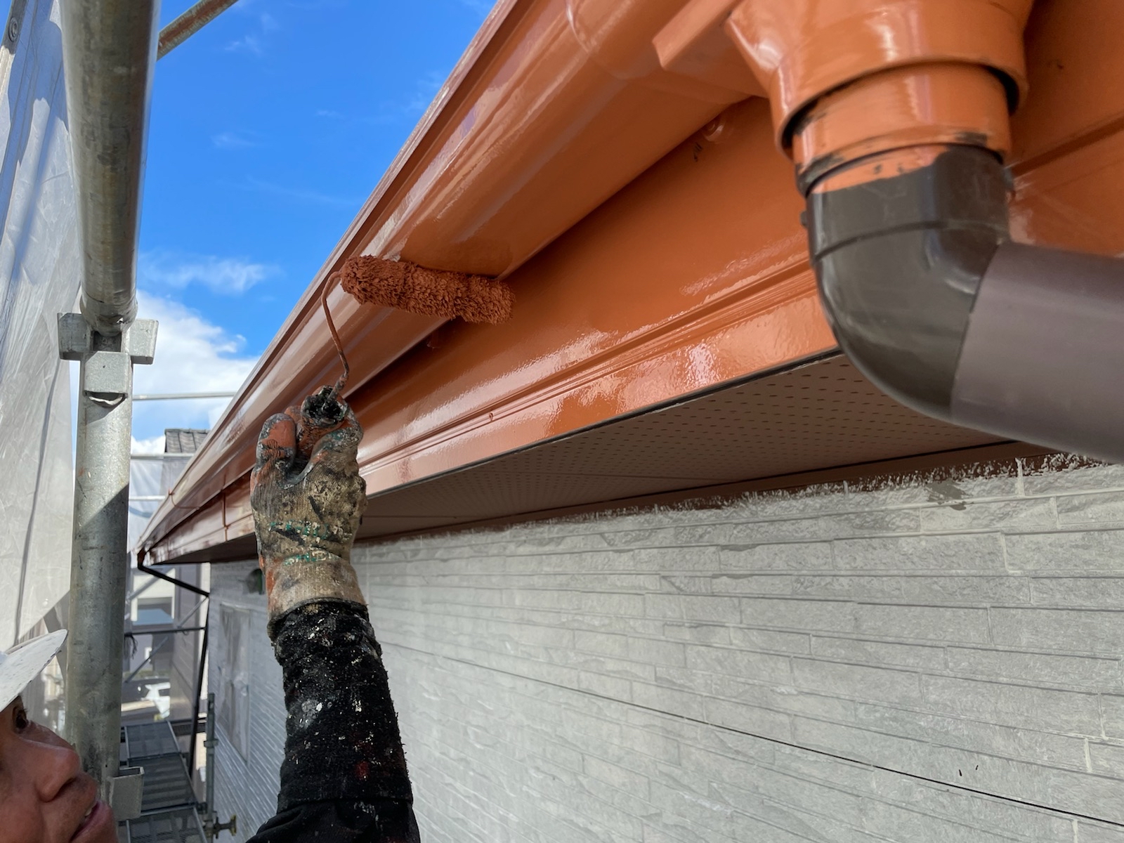 屋根:中・上塗り作業中 上塗り材は、アステックペイントのスーパーシャネツサーモSiを使用しました。