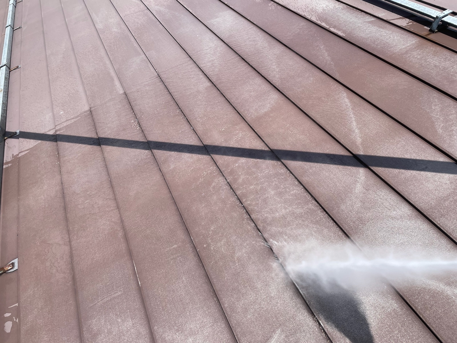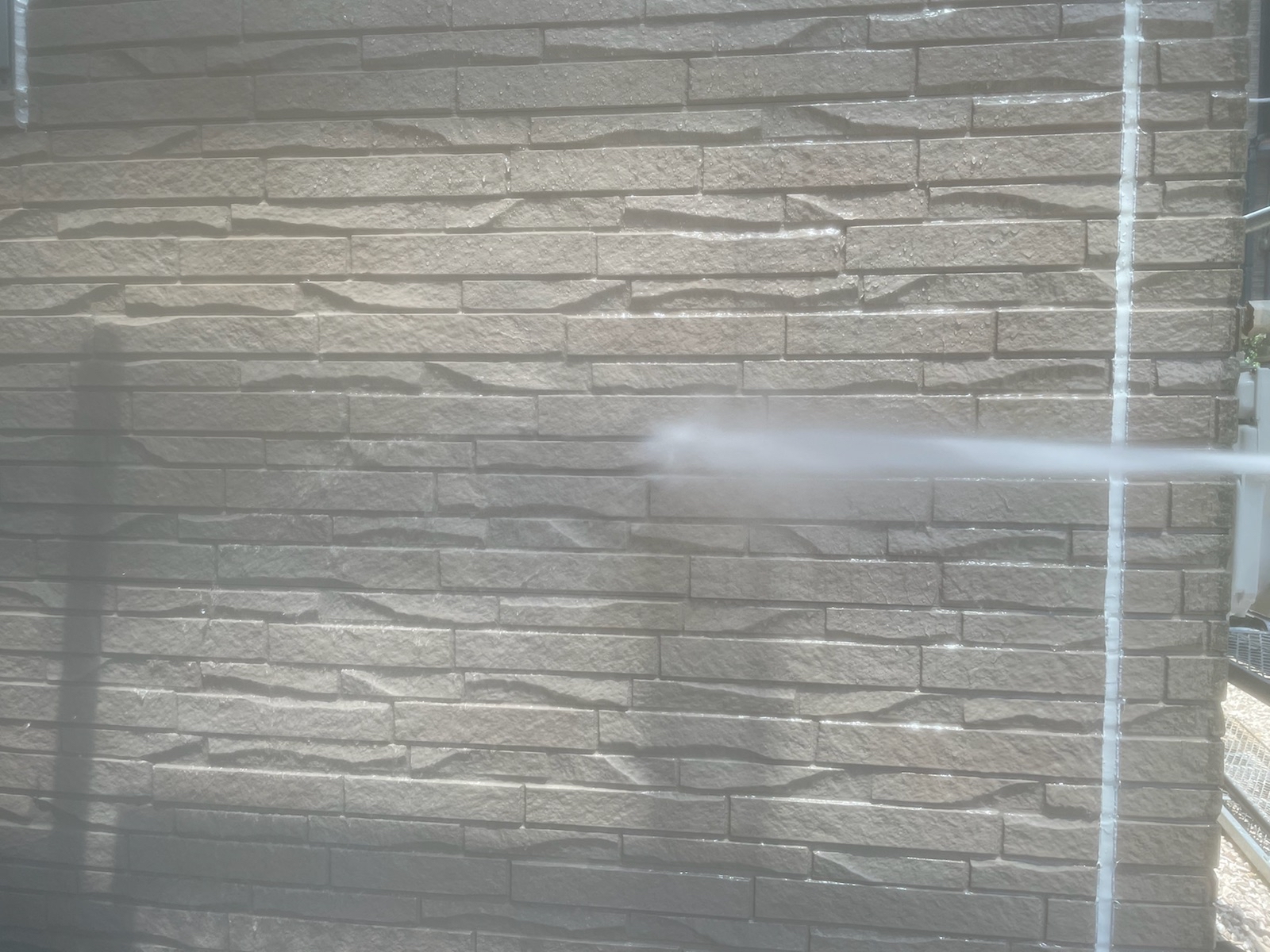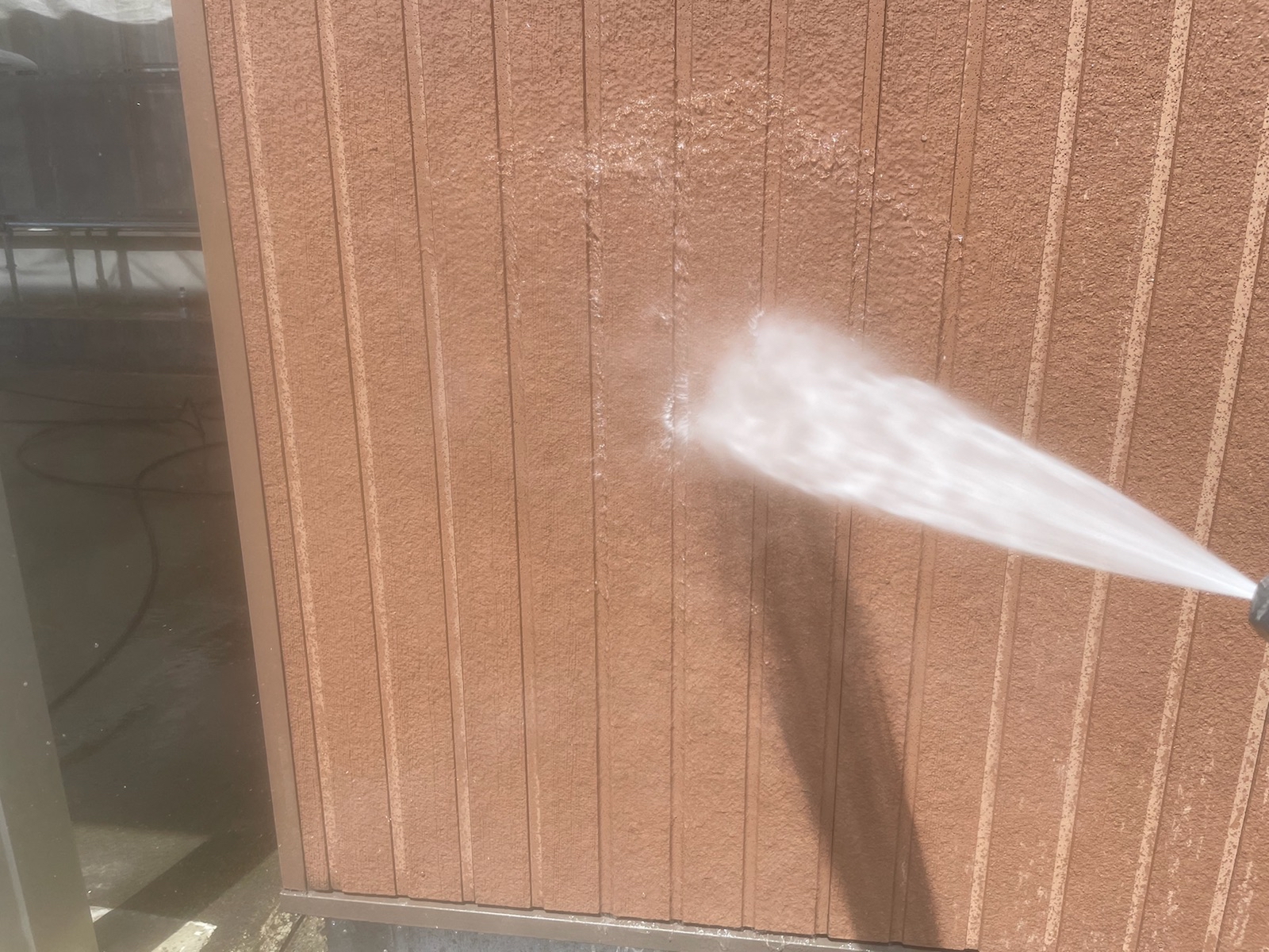 高圧洗浄作業中:古い塗膜や汚れなどを綺麗に洗います。