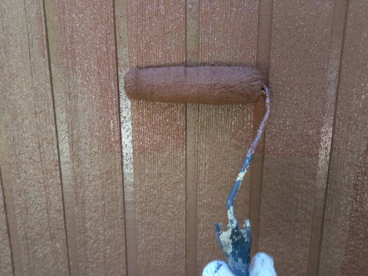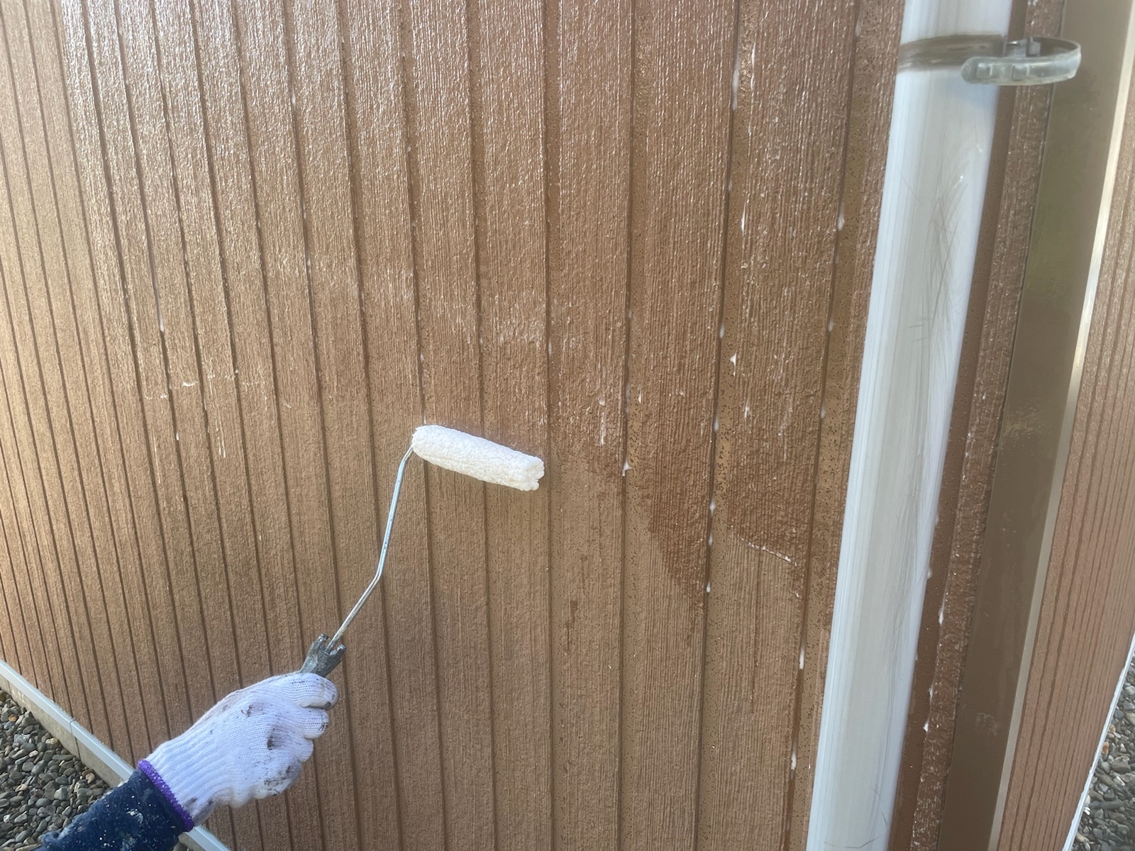 車庫外壁:中・上塗り作業中 上塗り材を2回塗りました。