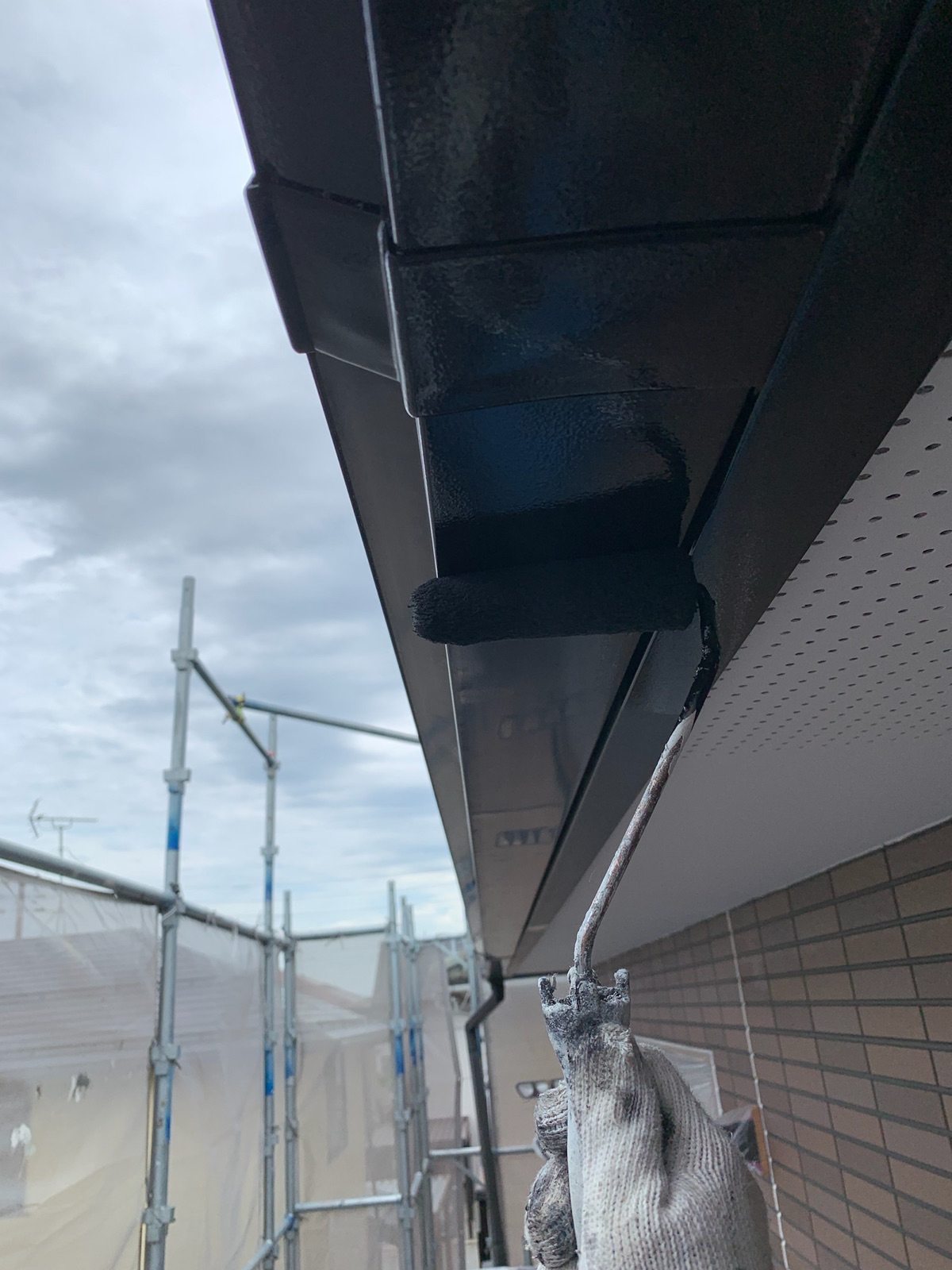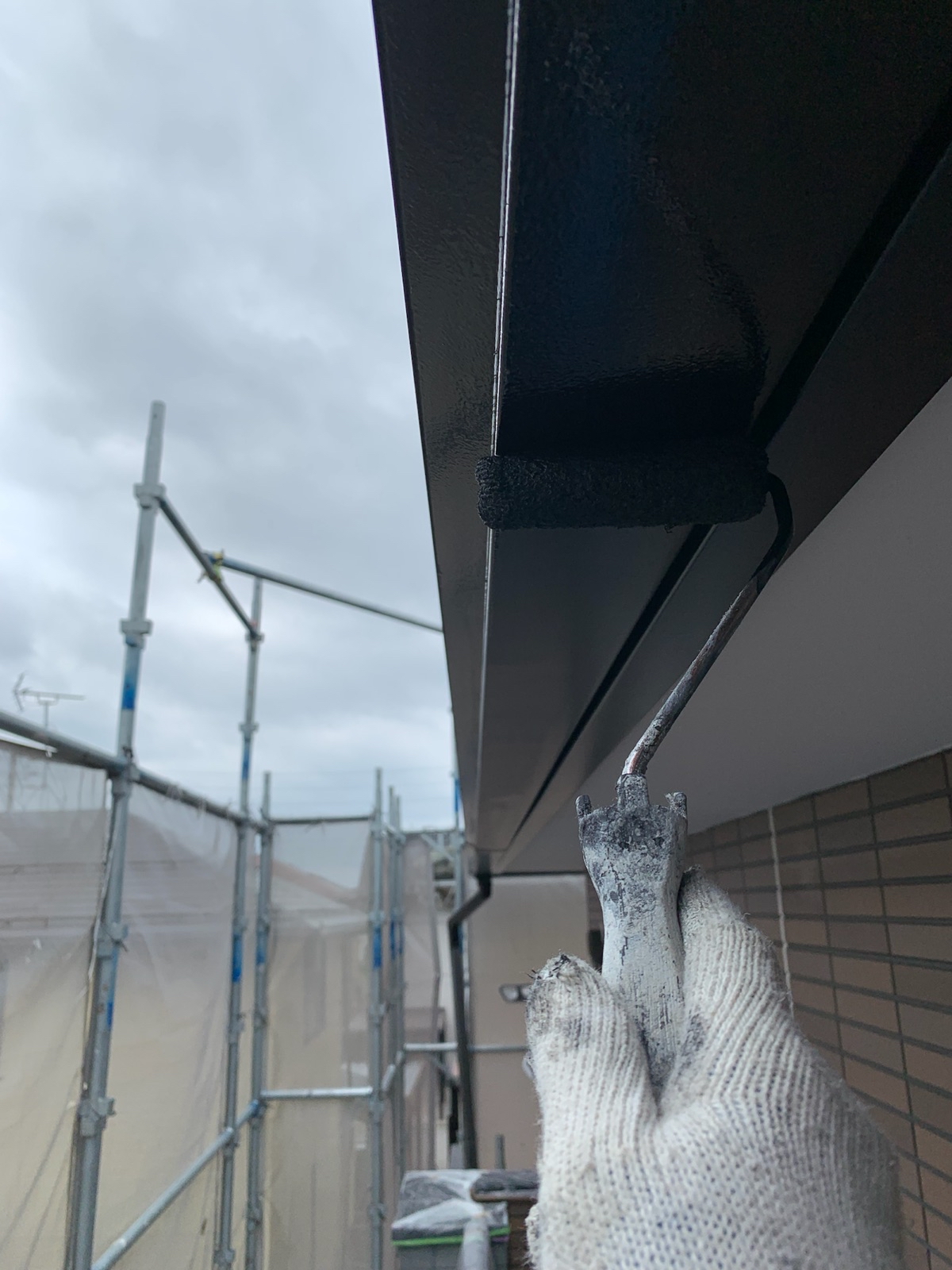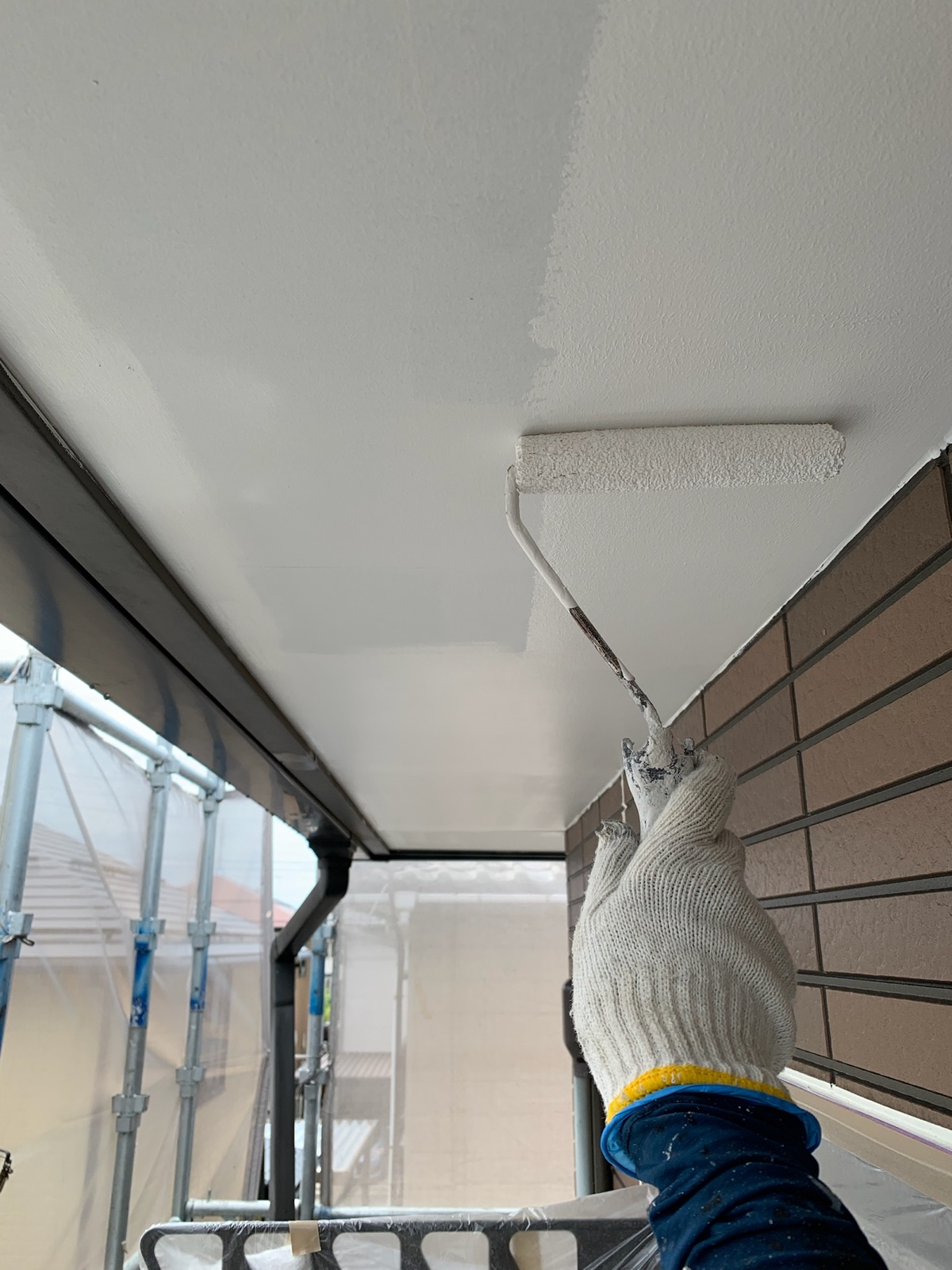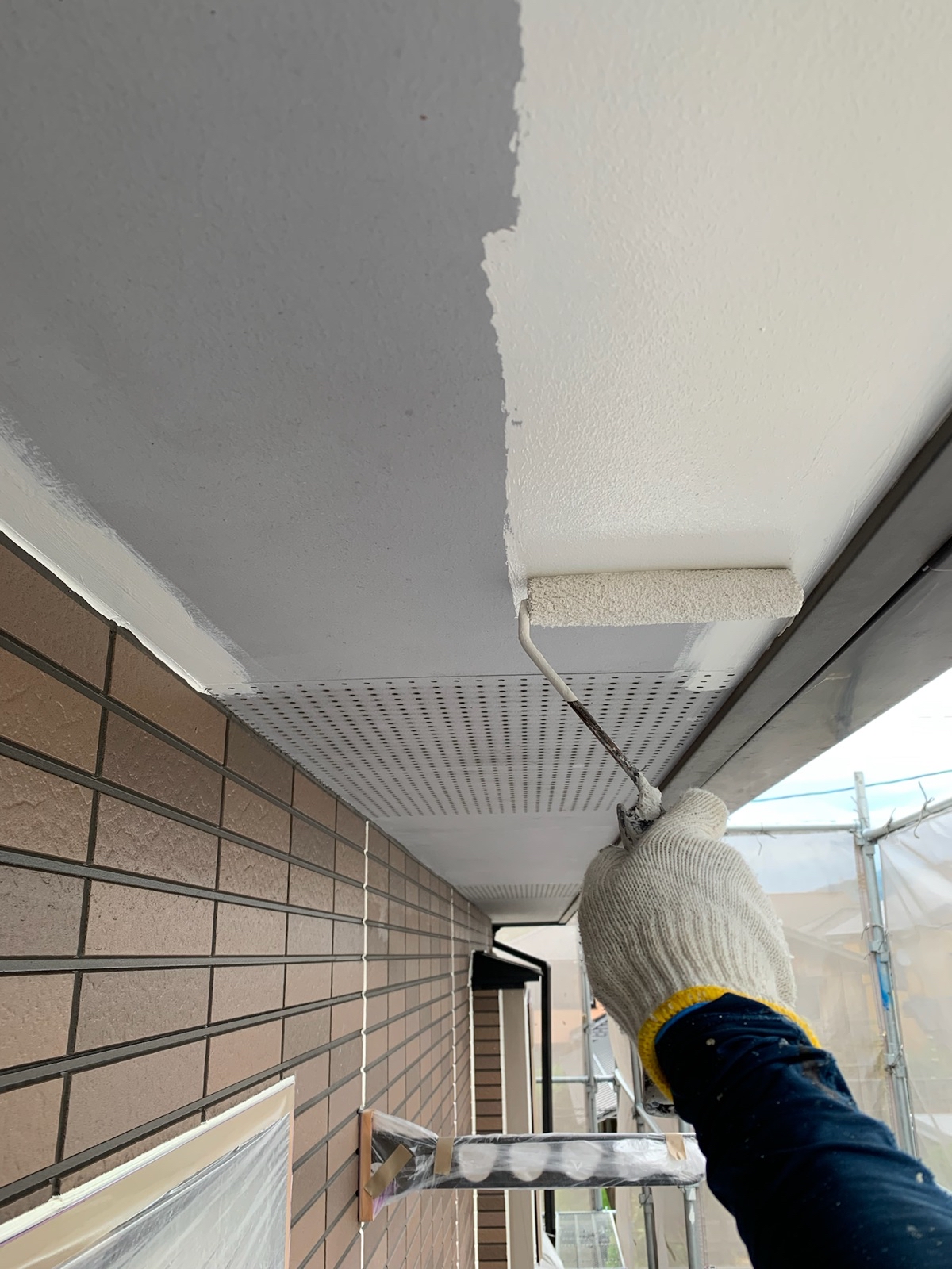 軒天:上塗り作業中