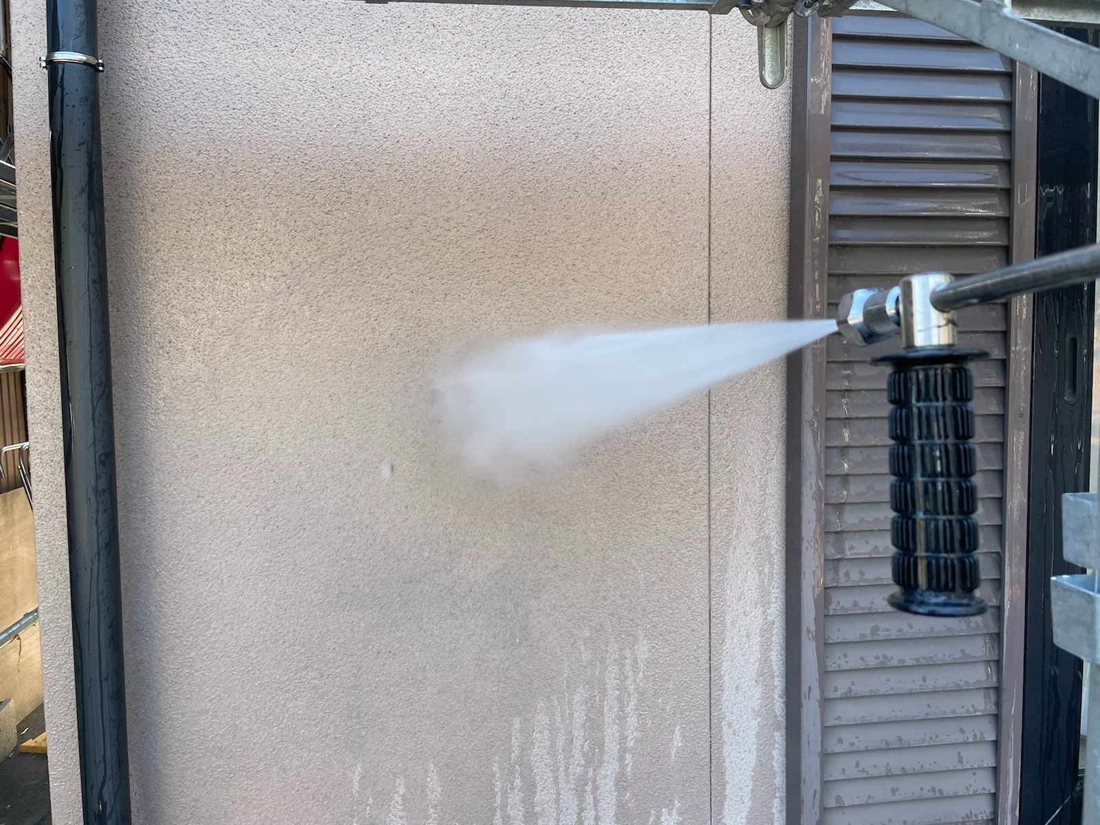高圧洗浄作業中:古い塗膜や汚れなどを綺麗に洗います。