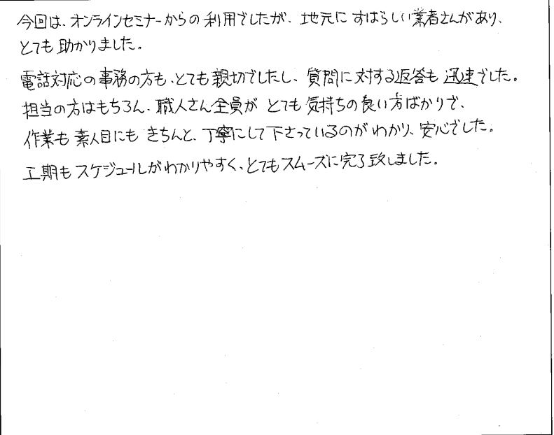 工期のスケジュールがわかりやすく、とてもスムーズに完了致しました。