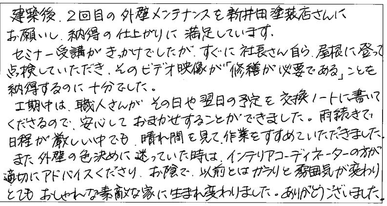 建築後、2回目の外壁メンテナンスを新井田塗装店さんにお願いし、                                                                   納得の仕上がりに満足しています。