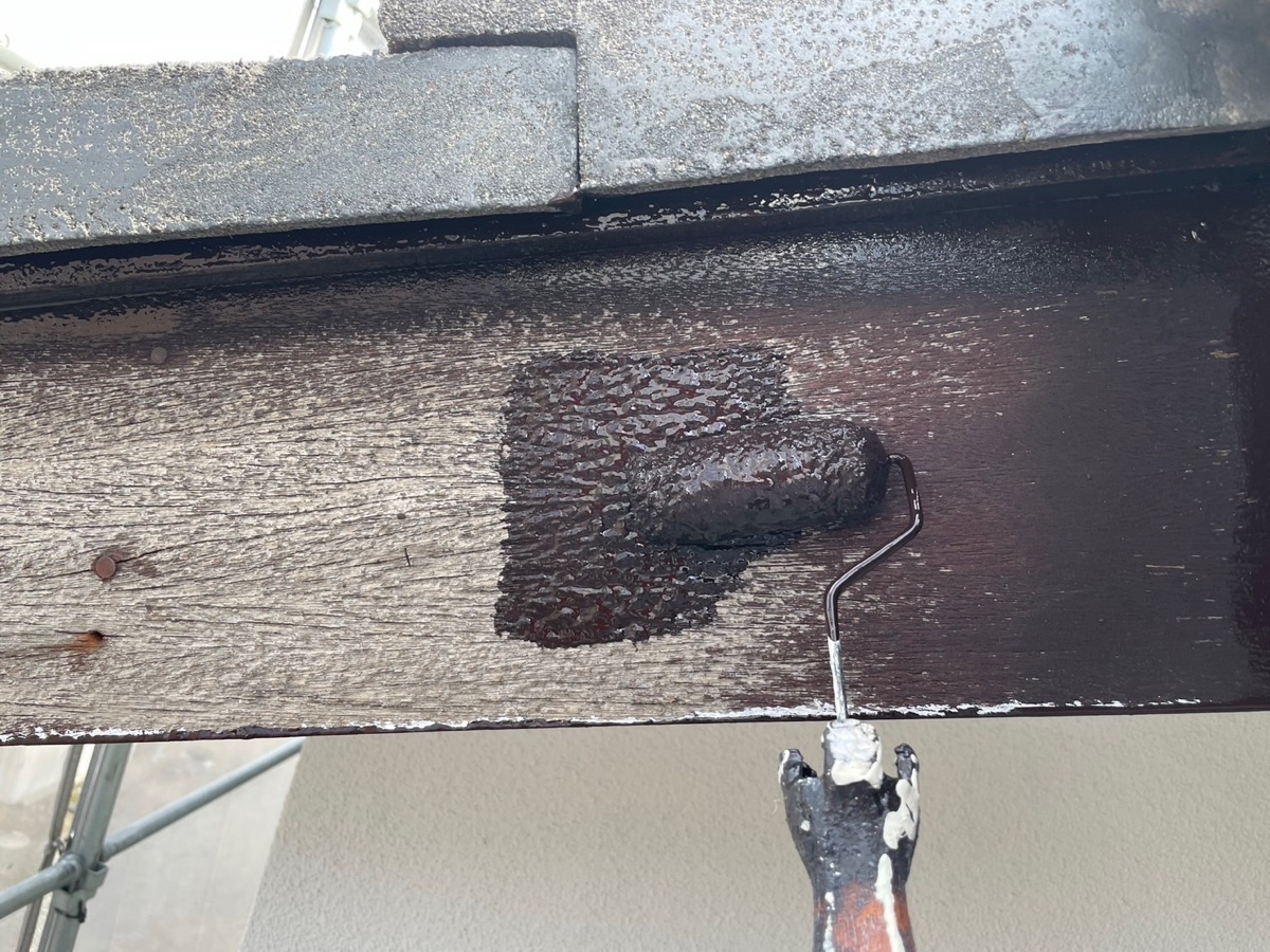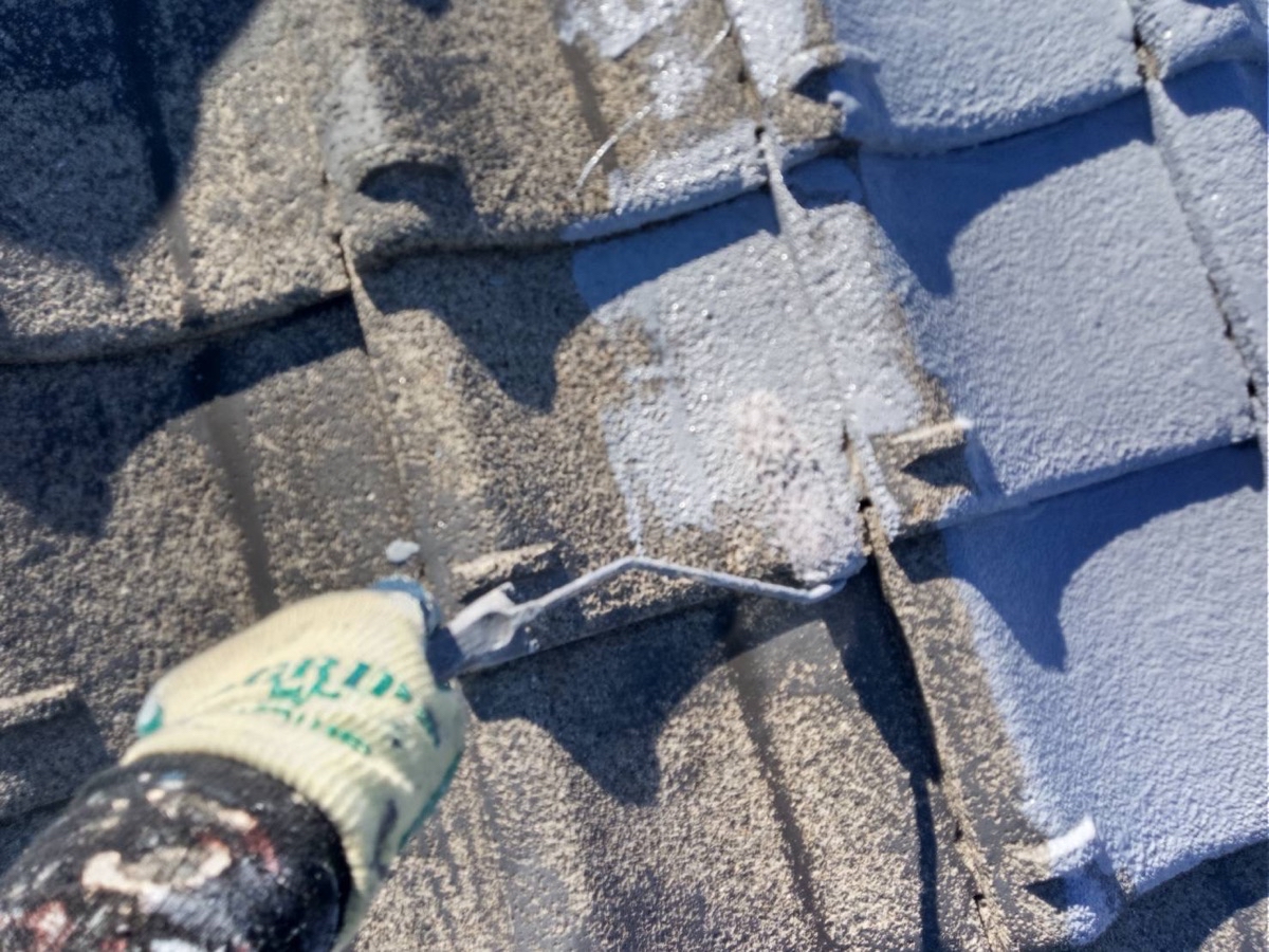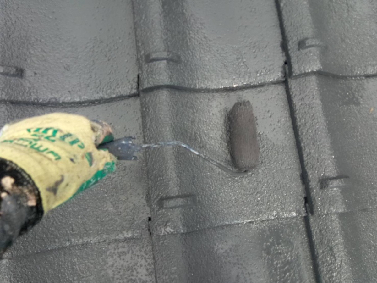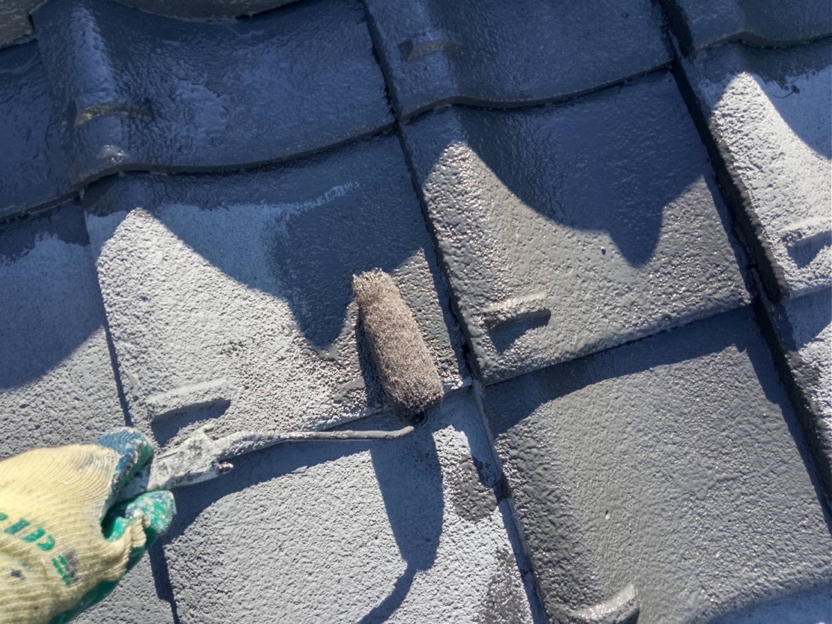 下塗り作業中:エーエスペイントのsun瓦エクセルガードを使用しました。