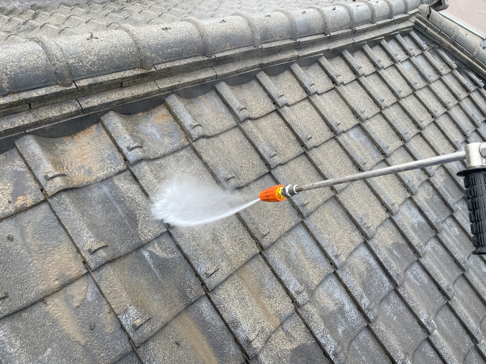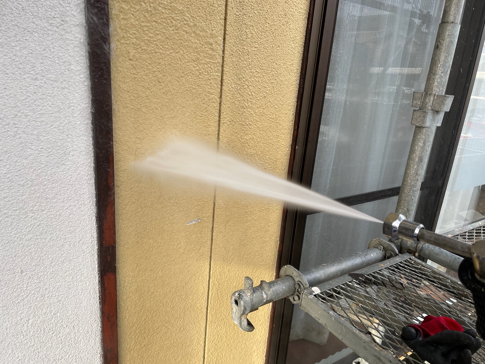 高圧洗浄作業中:古い塗膜や汚れ等を丁寧に落としていきます。