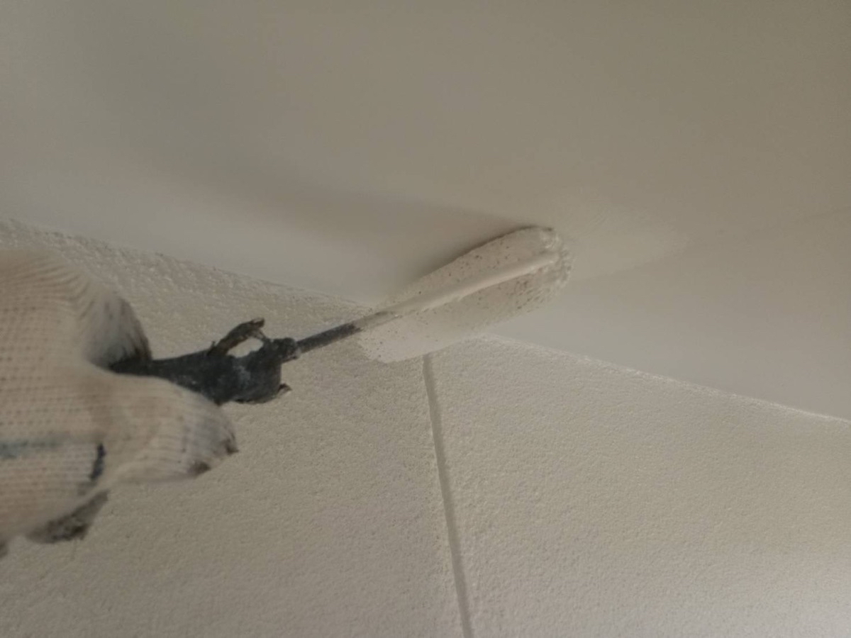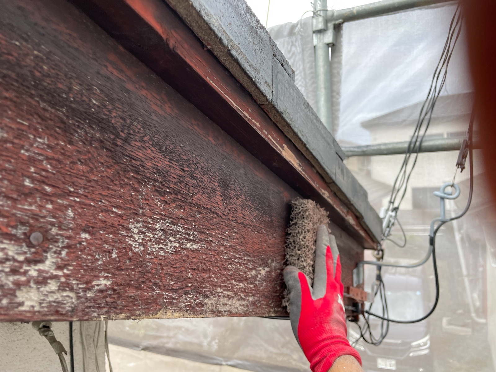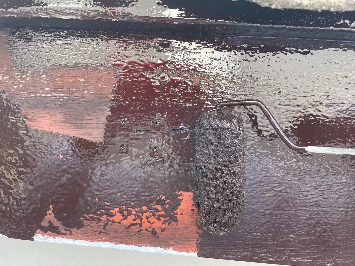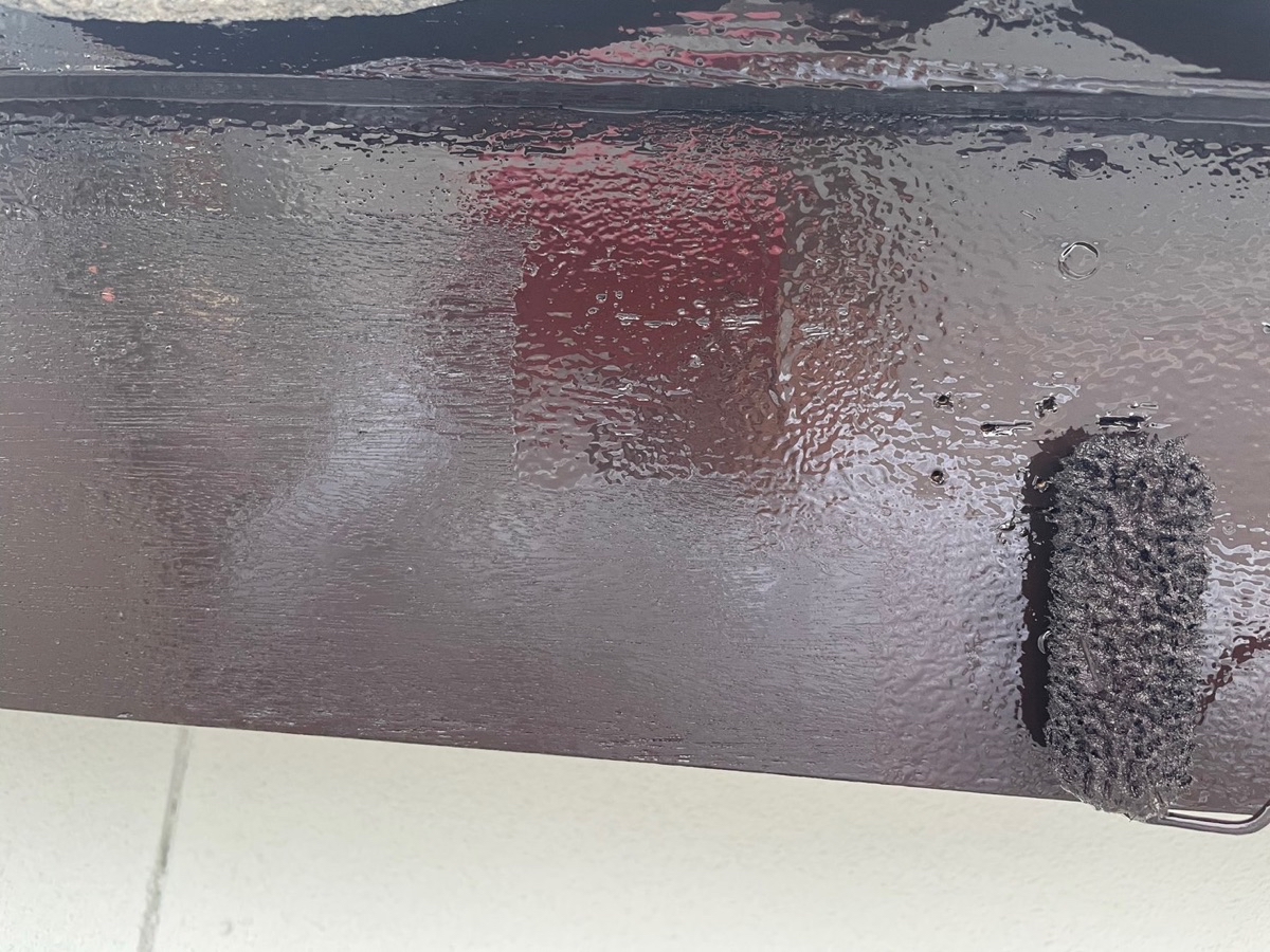 中塗り作業中:アステックペイントのスーパーシャネツサーモFの1回目を塗装中です。