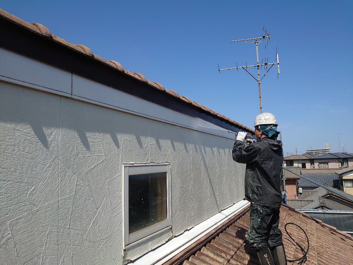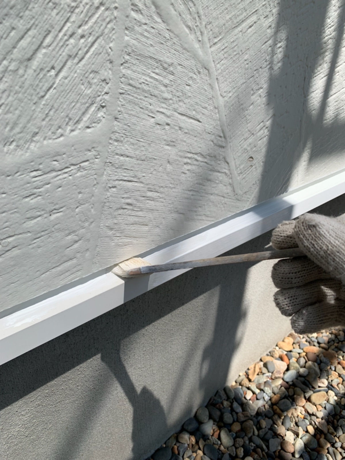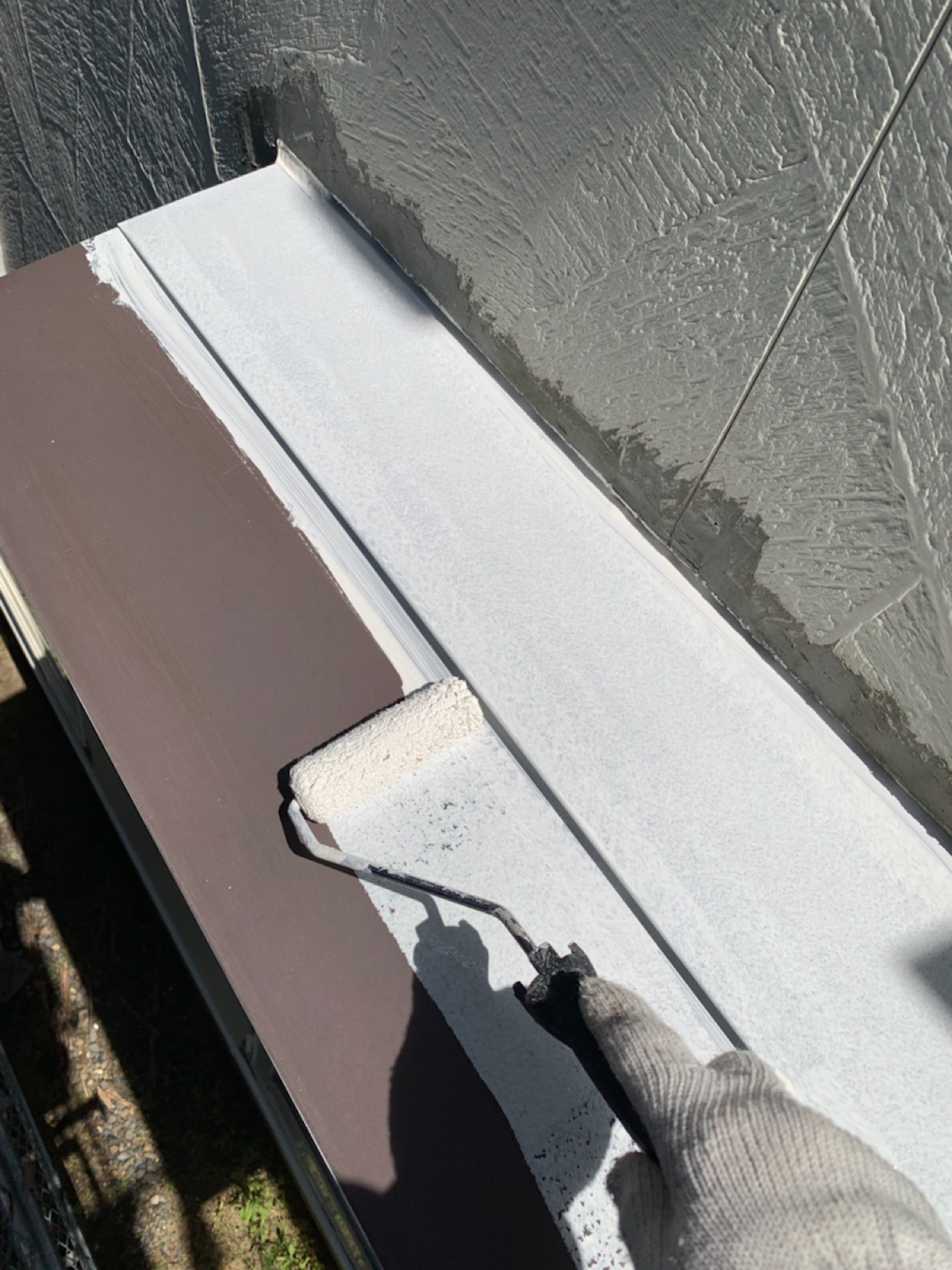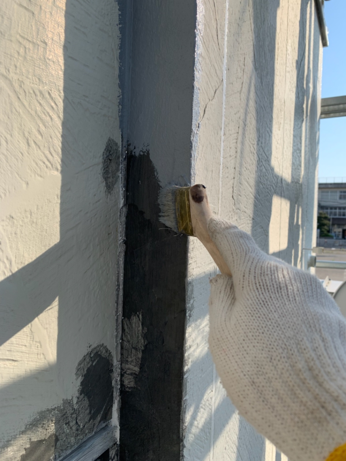 外壁:下塗り作業中。下塗り材はアステックペイントのエポパワーシーラーを使用しました。