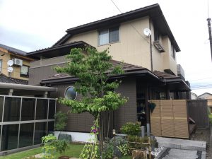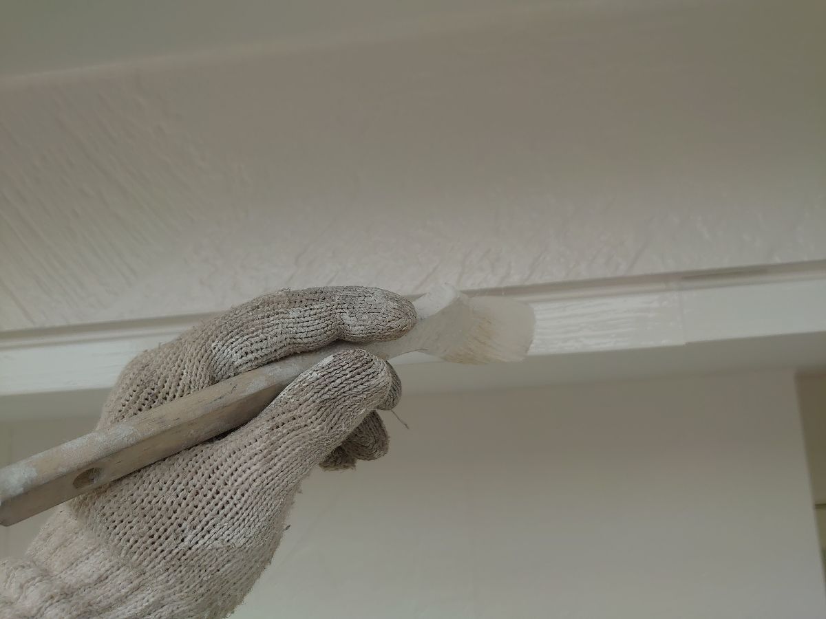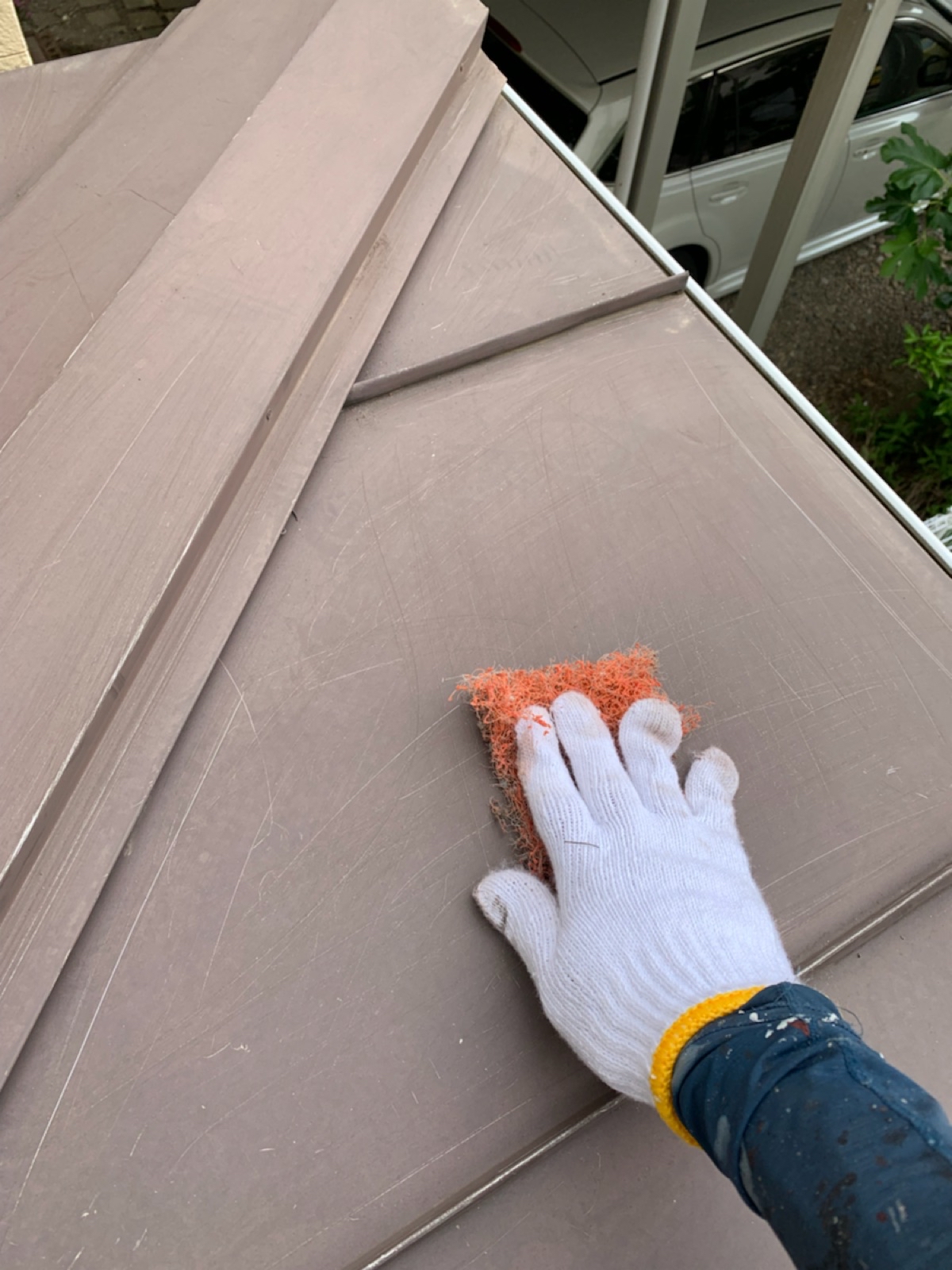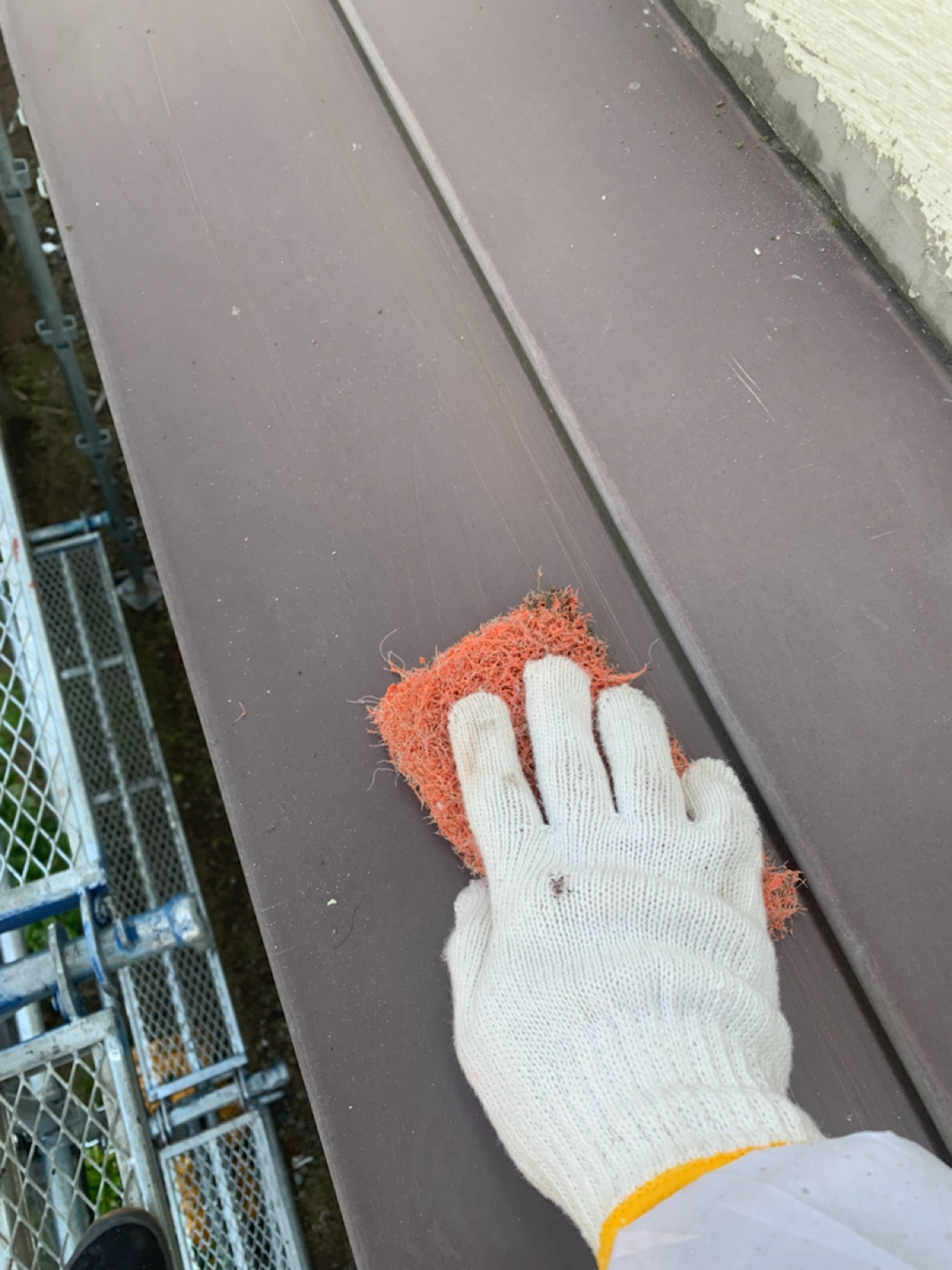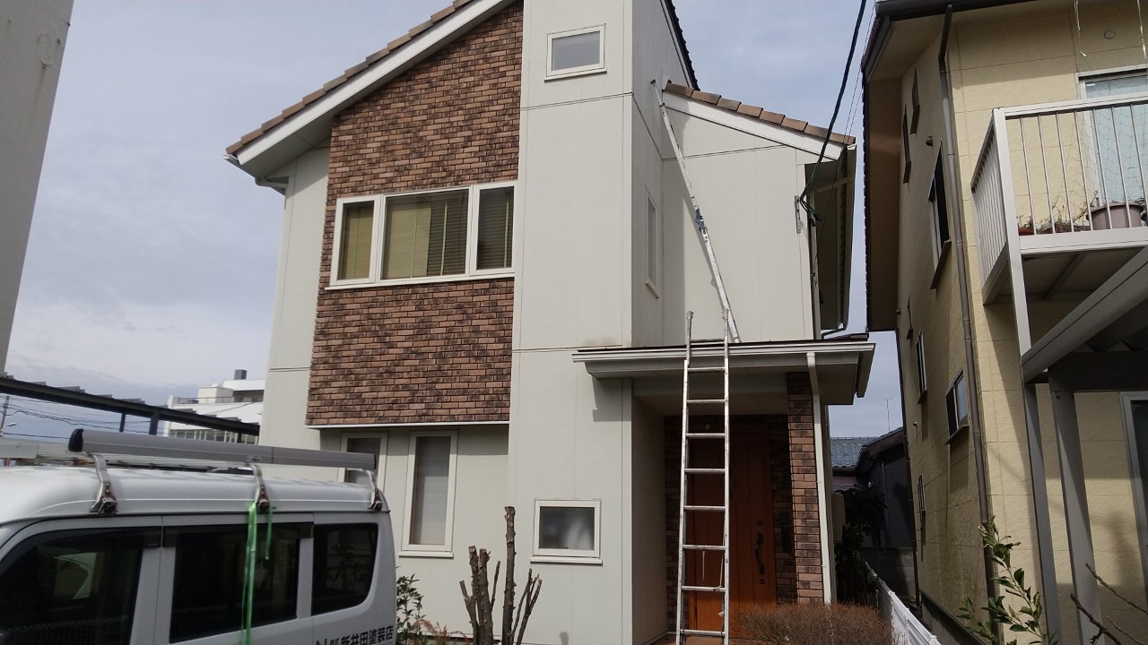 外壁:下塗り作業中。下塗り材はアステックペイントのエポパワーシーラーを使用しました。