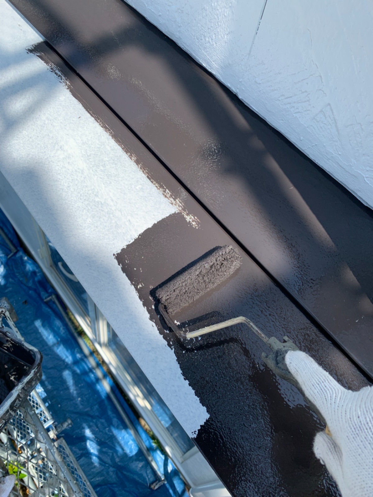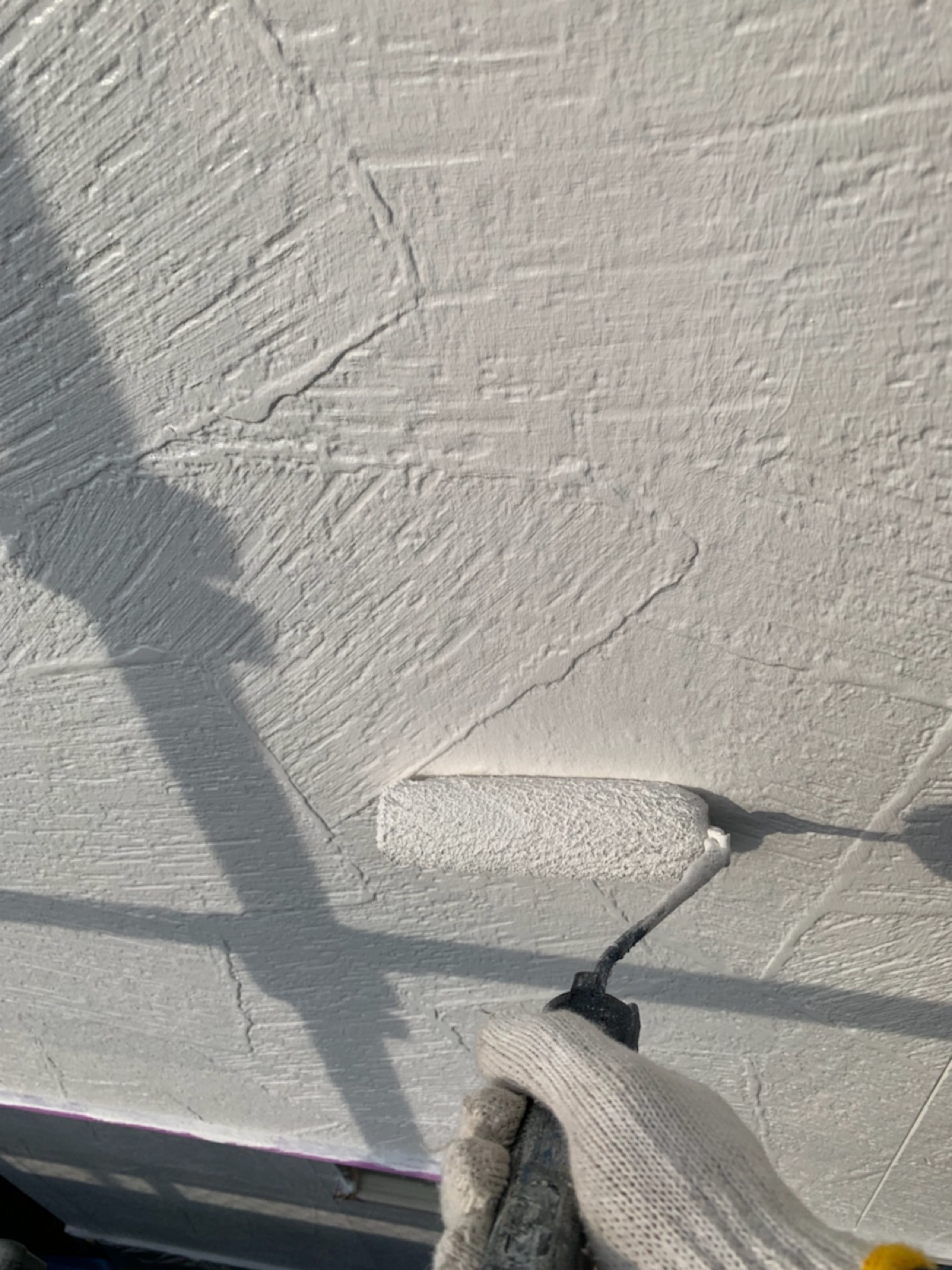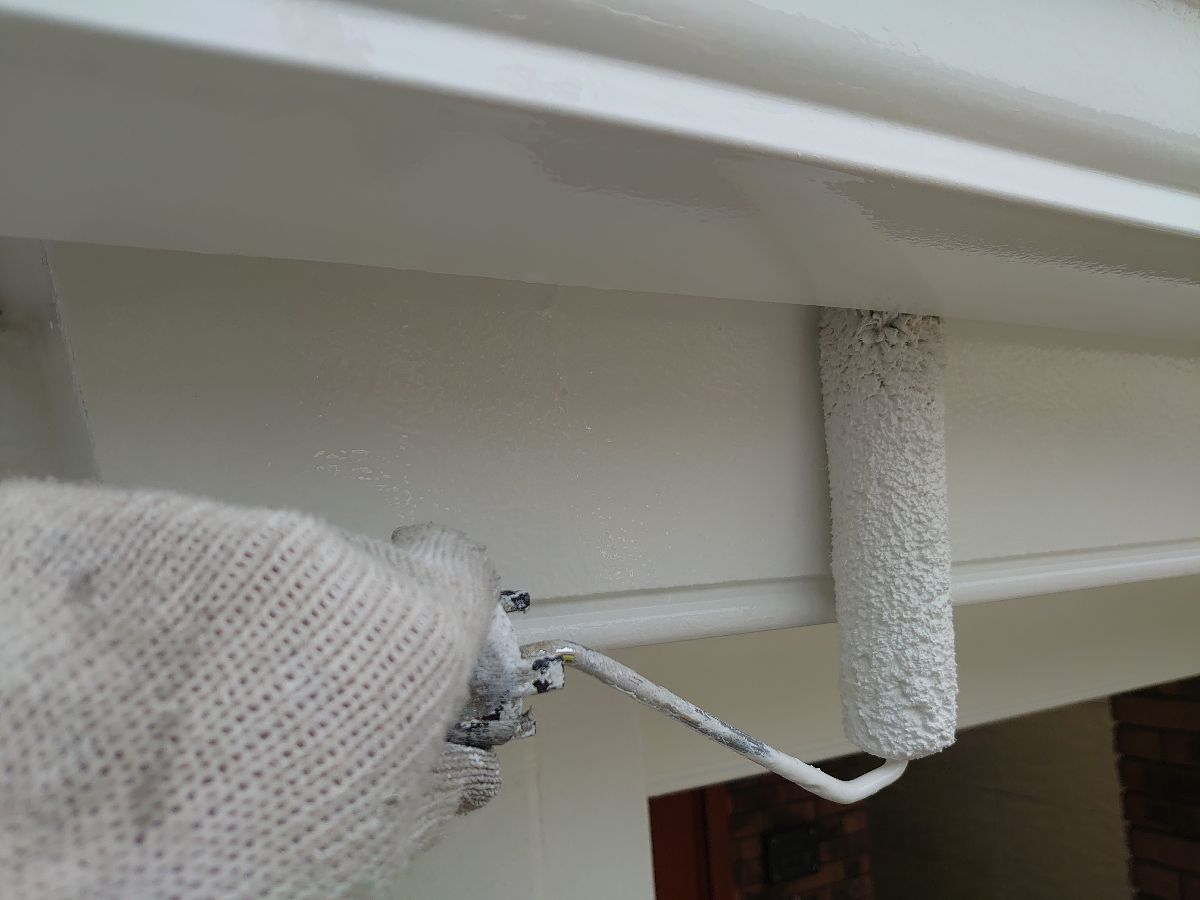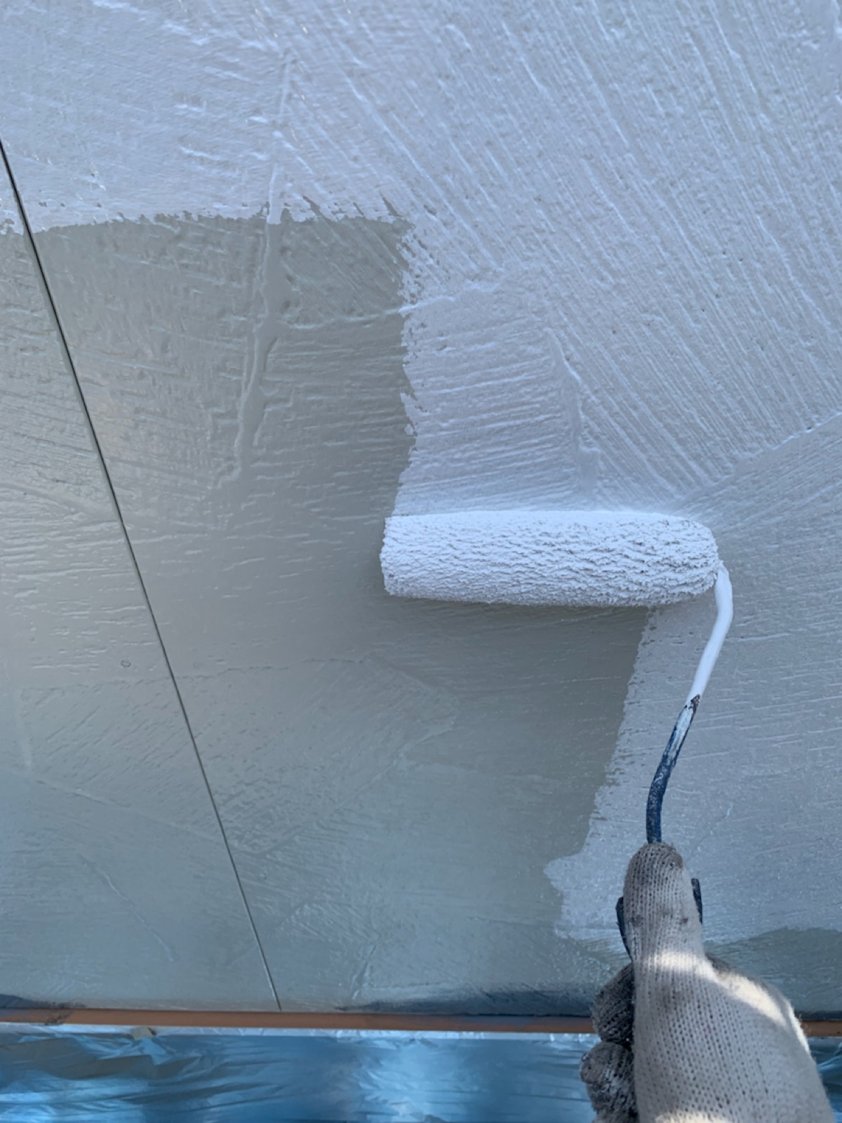 外壁:上塗り作業中。上塗り材2回目を塗装中です。