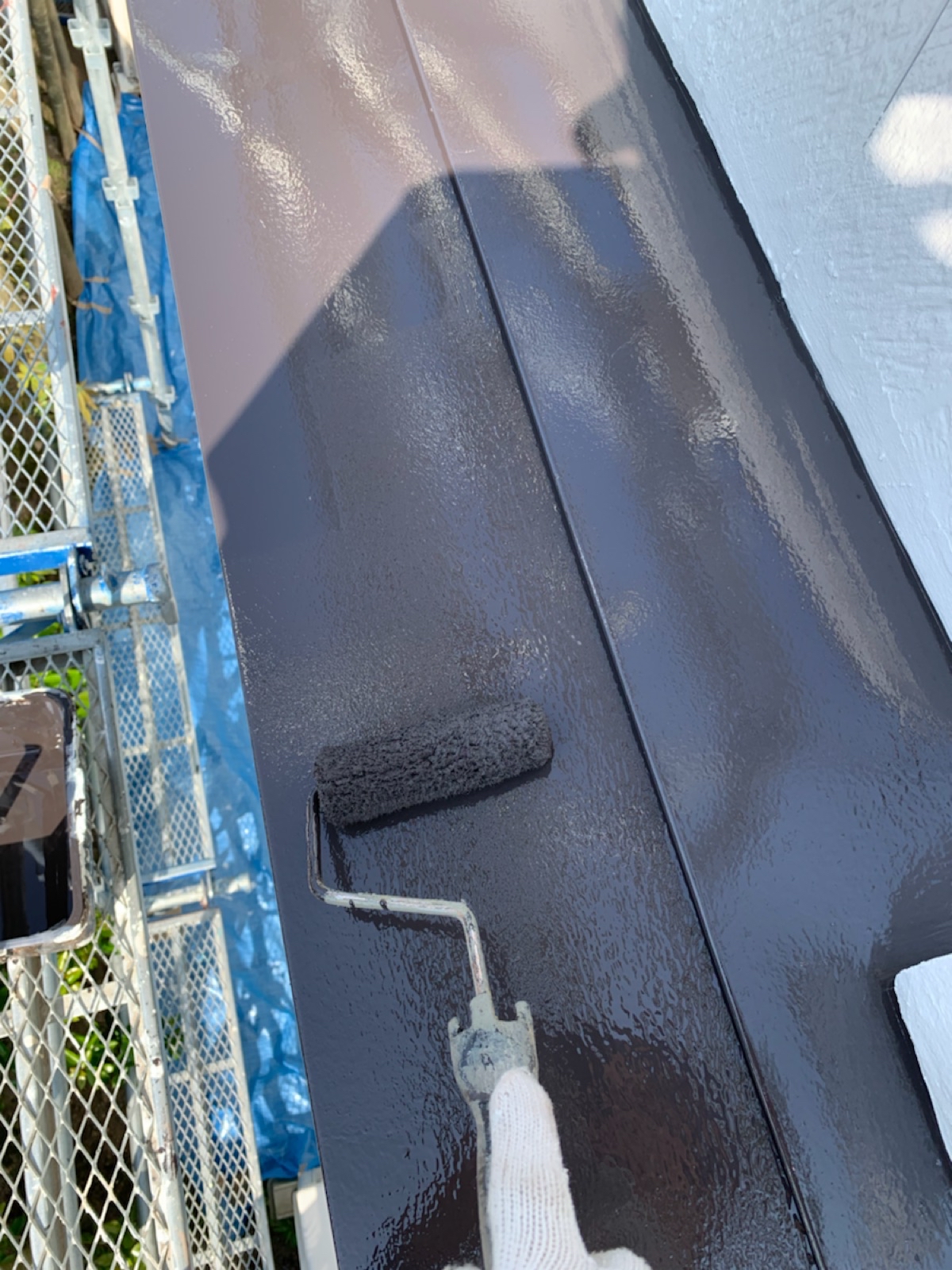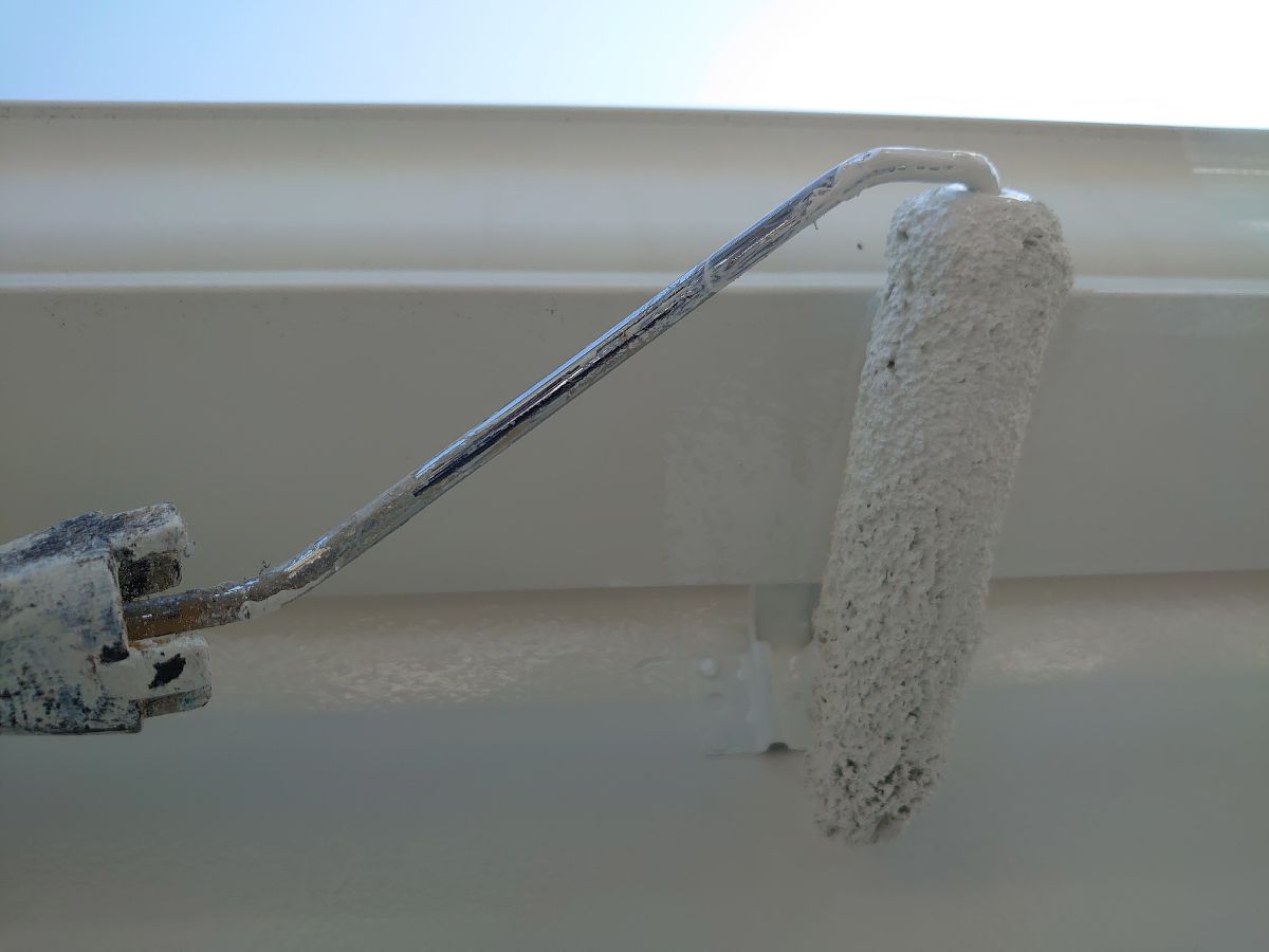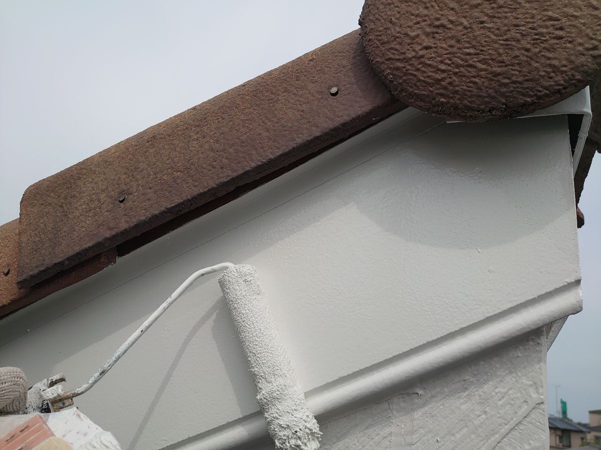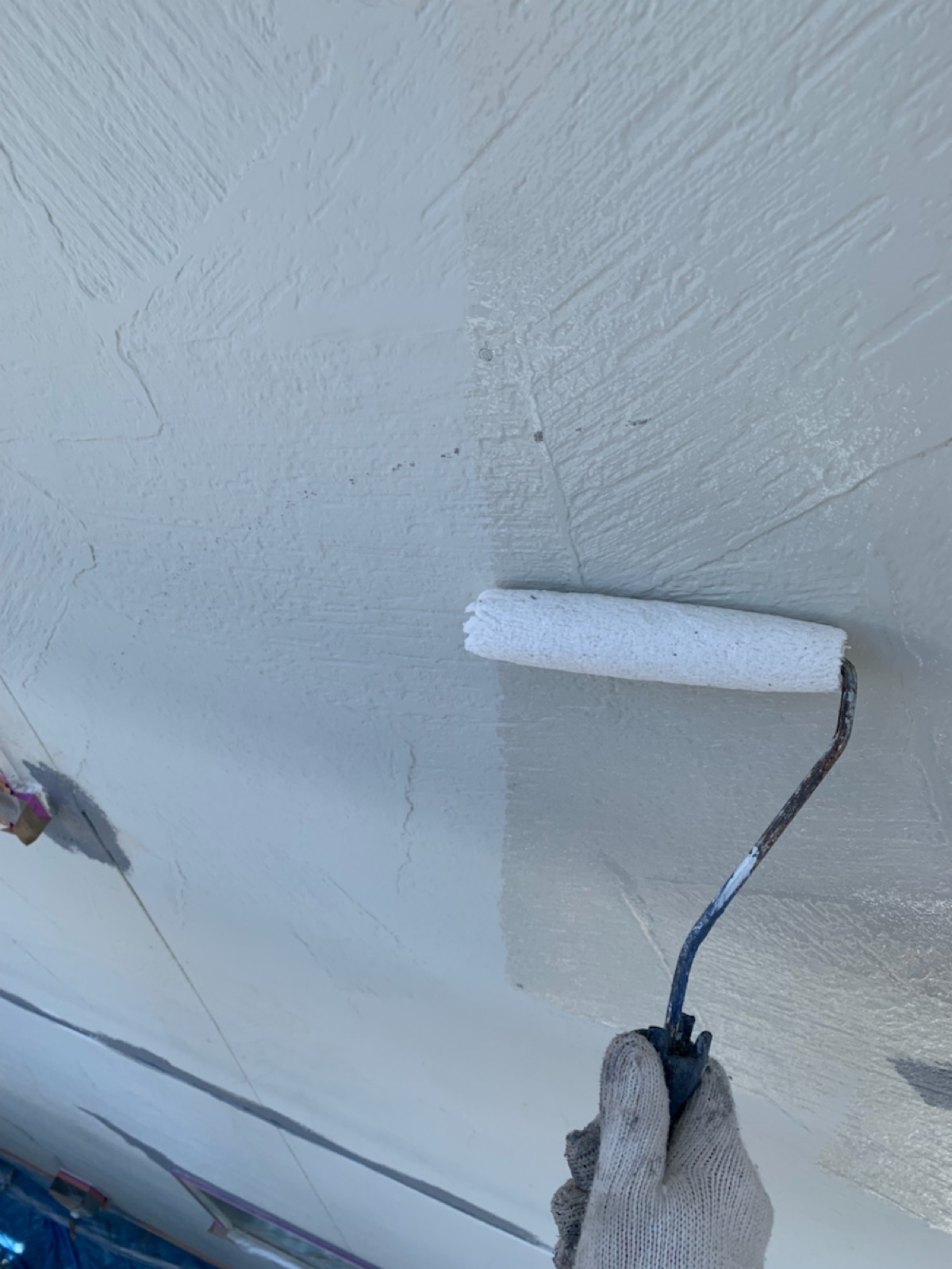外壁:上塗り作業中。上塗り材2回目を塗装中です。