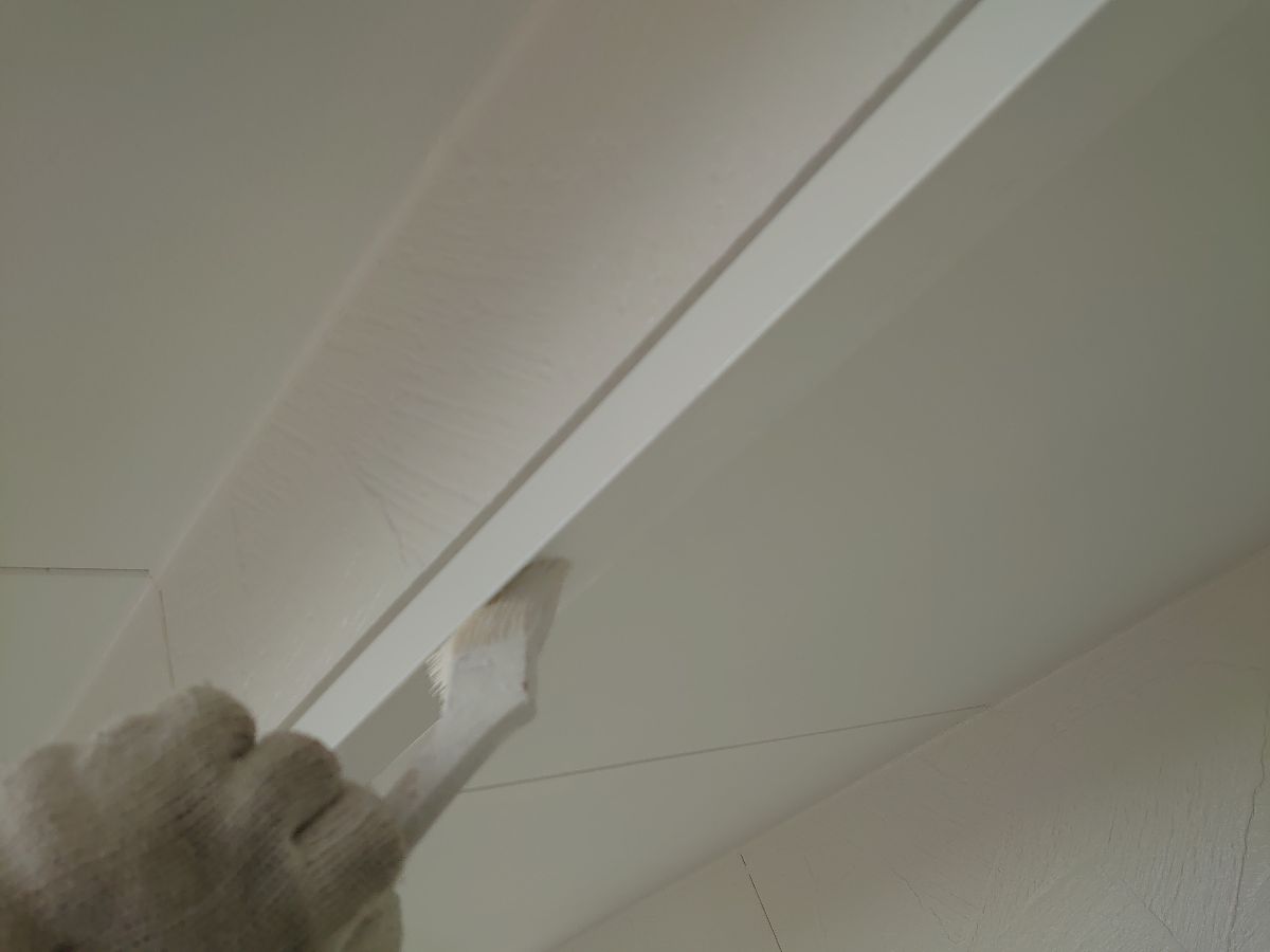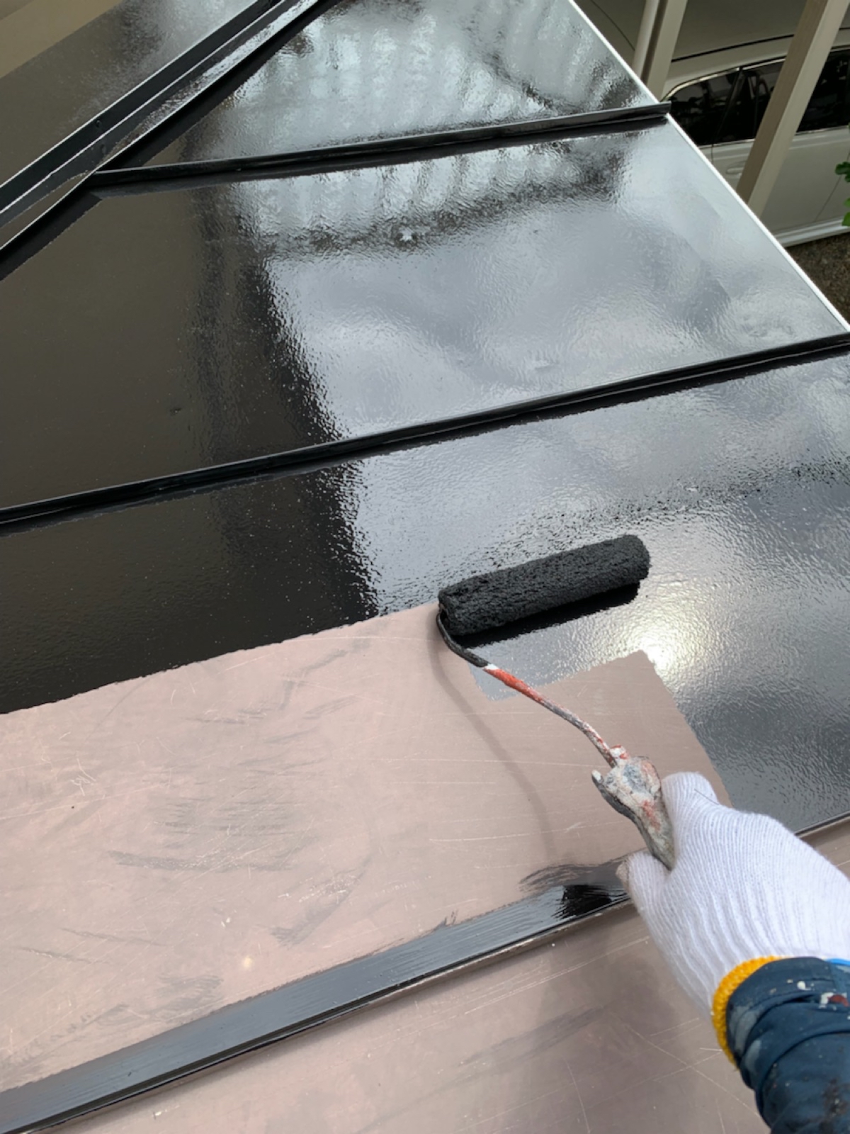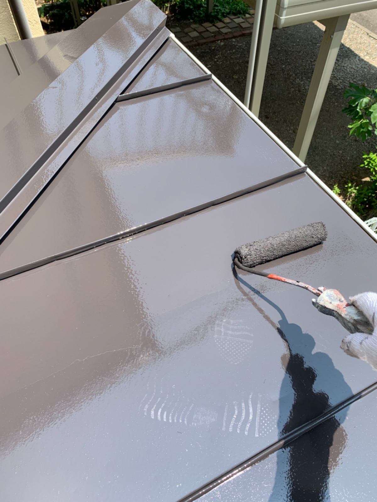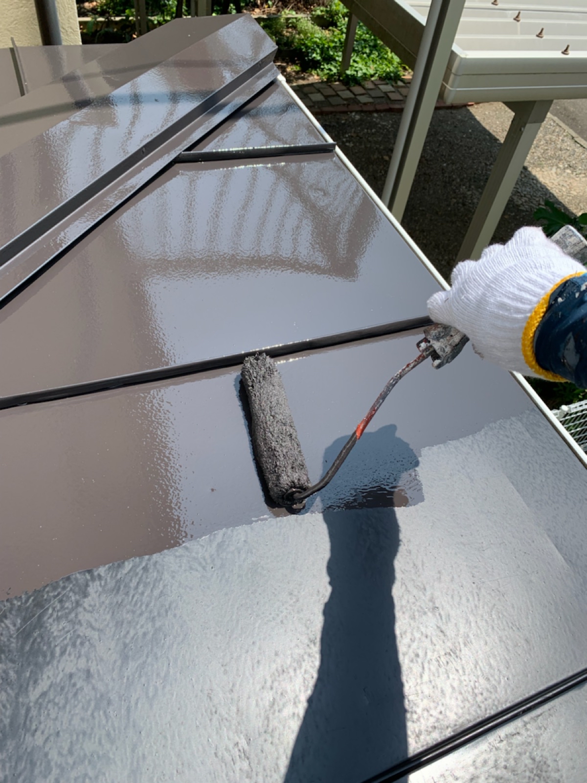 外壁:上塗り作業中。上塗り材2回目を塗装中です。
