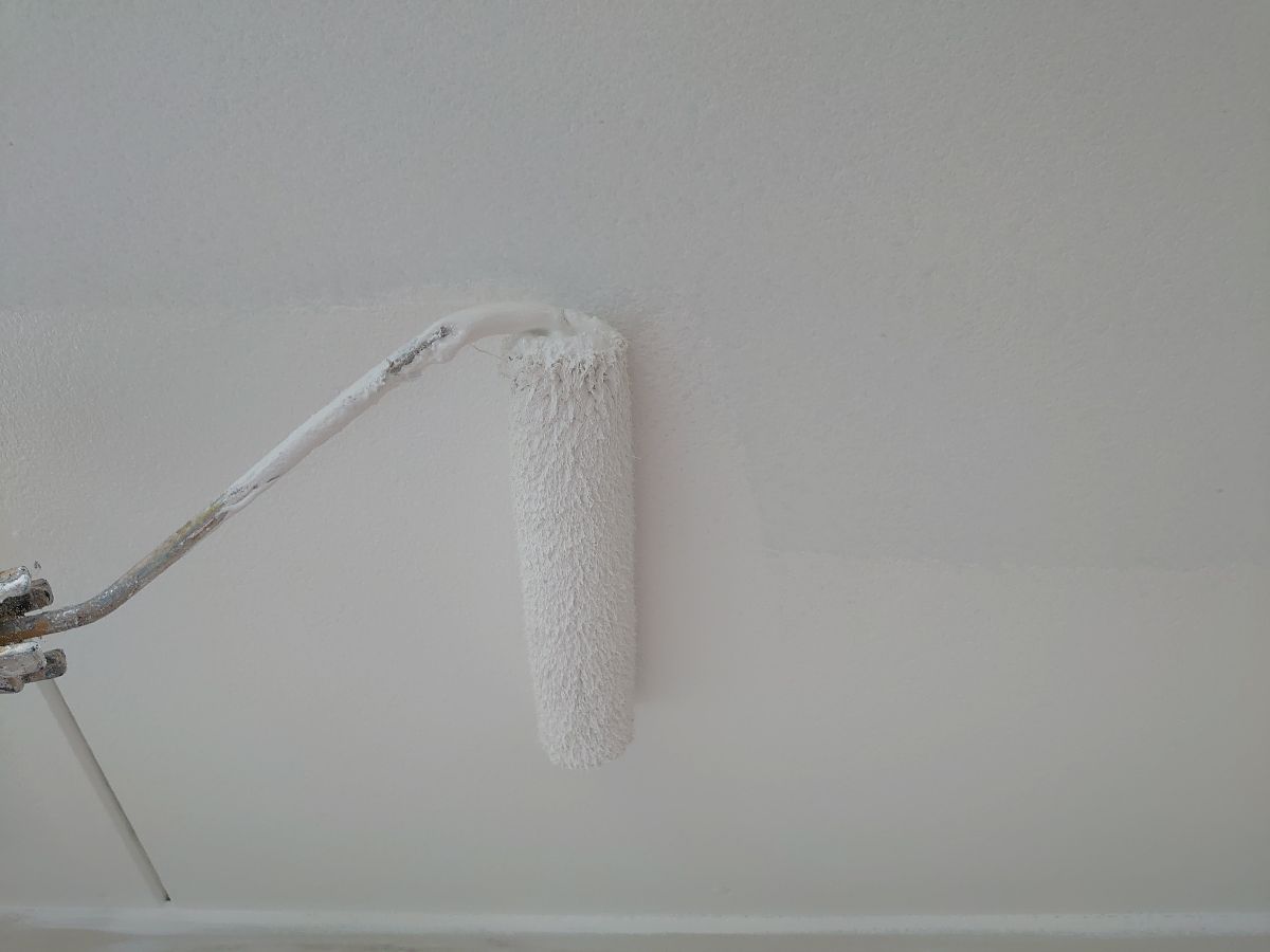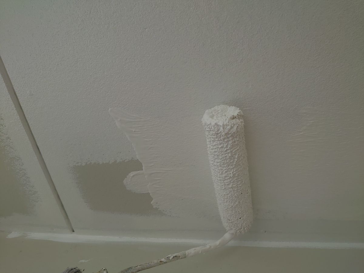 外壁:中塗り作業中。アステックペイントの超低汚染リファイン1000Si-IRの1回目を塗装中です。