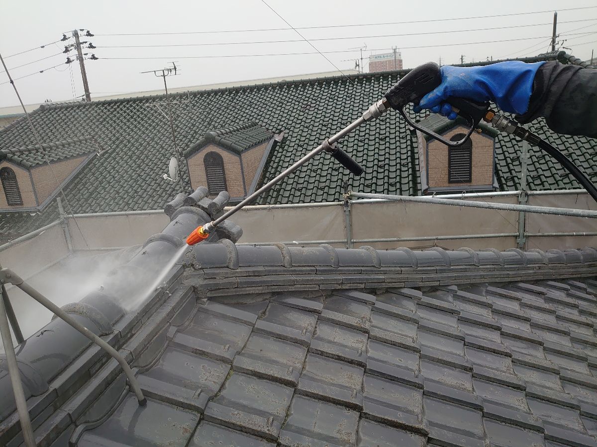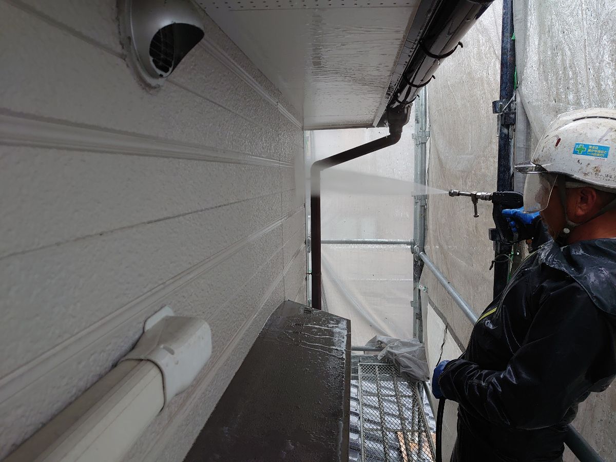 高圧洗浄作業中:古い塗膜や汚れ等を丁寧に落としていきます。