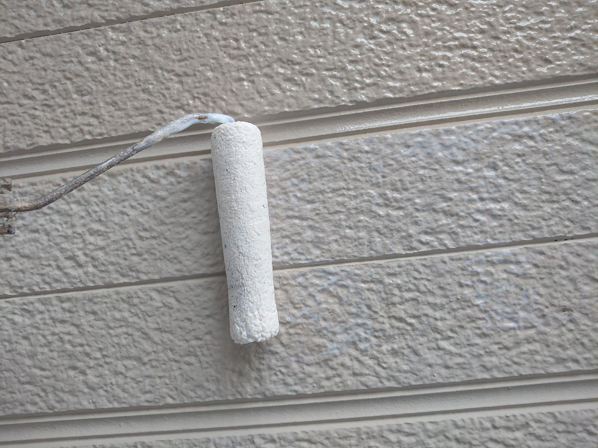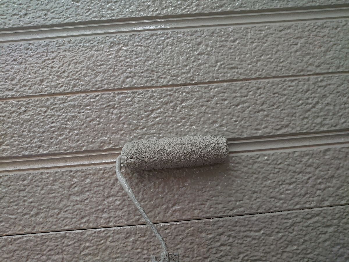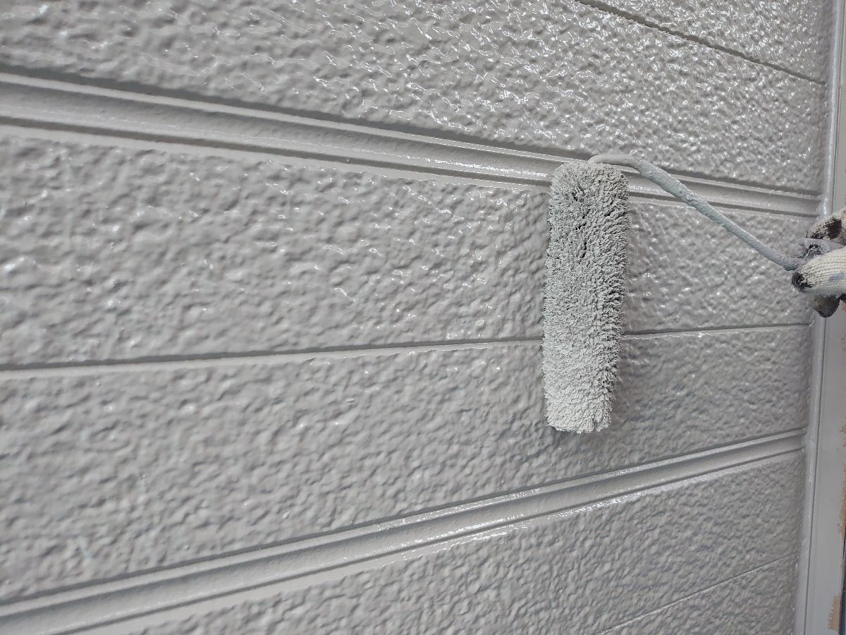 外壁:上塗り作業中。上塗り材はエスケー化研のクリーンマイルドシリコンを使用しました。