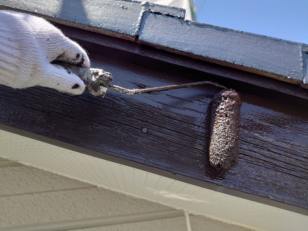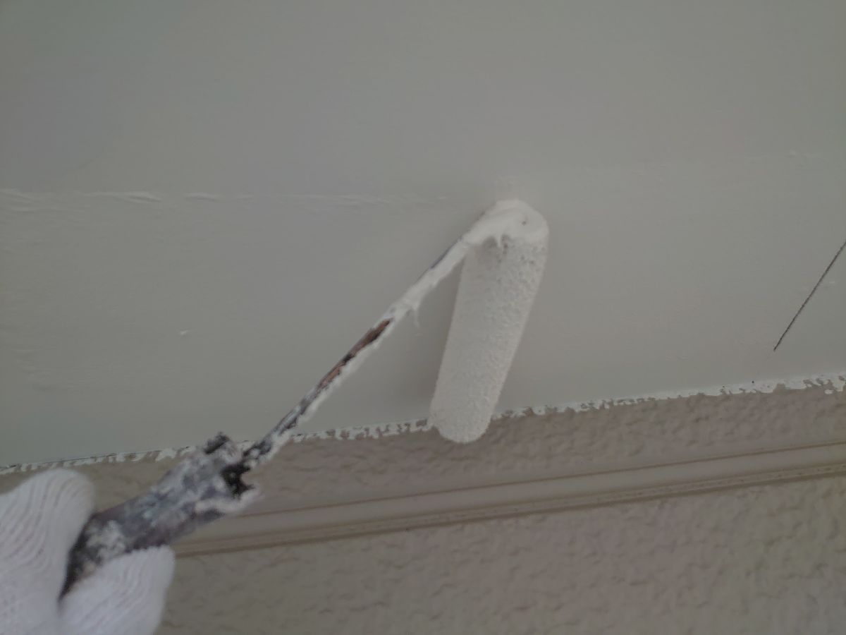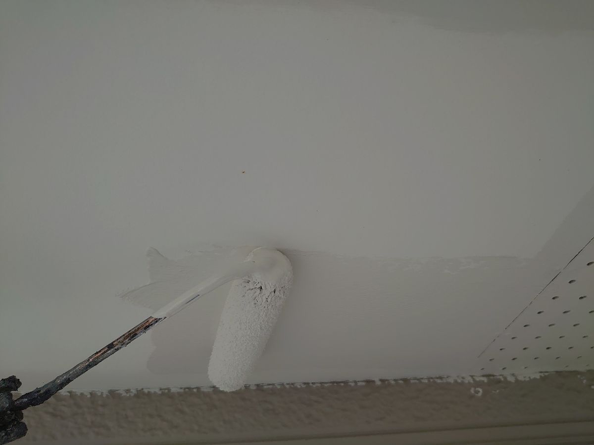 軒天:上塗り作業中