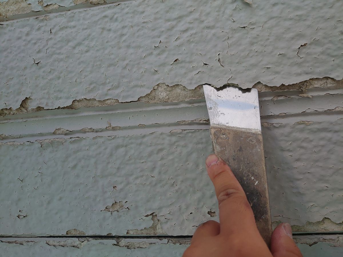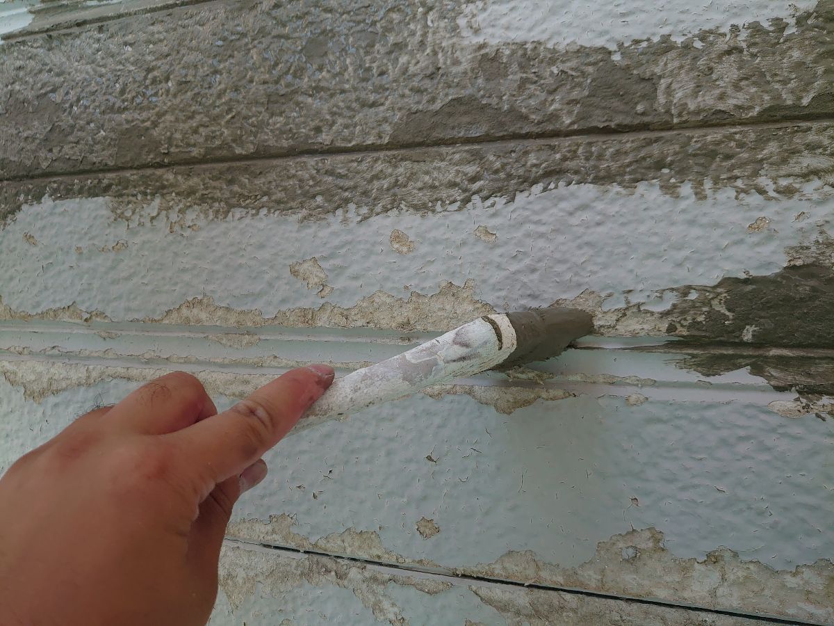 下地補修:外壁材の欠損部をカチオンという補修剤を使って形成しています。