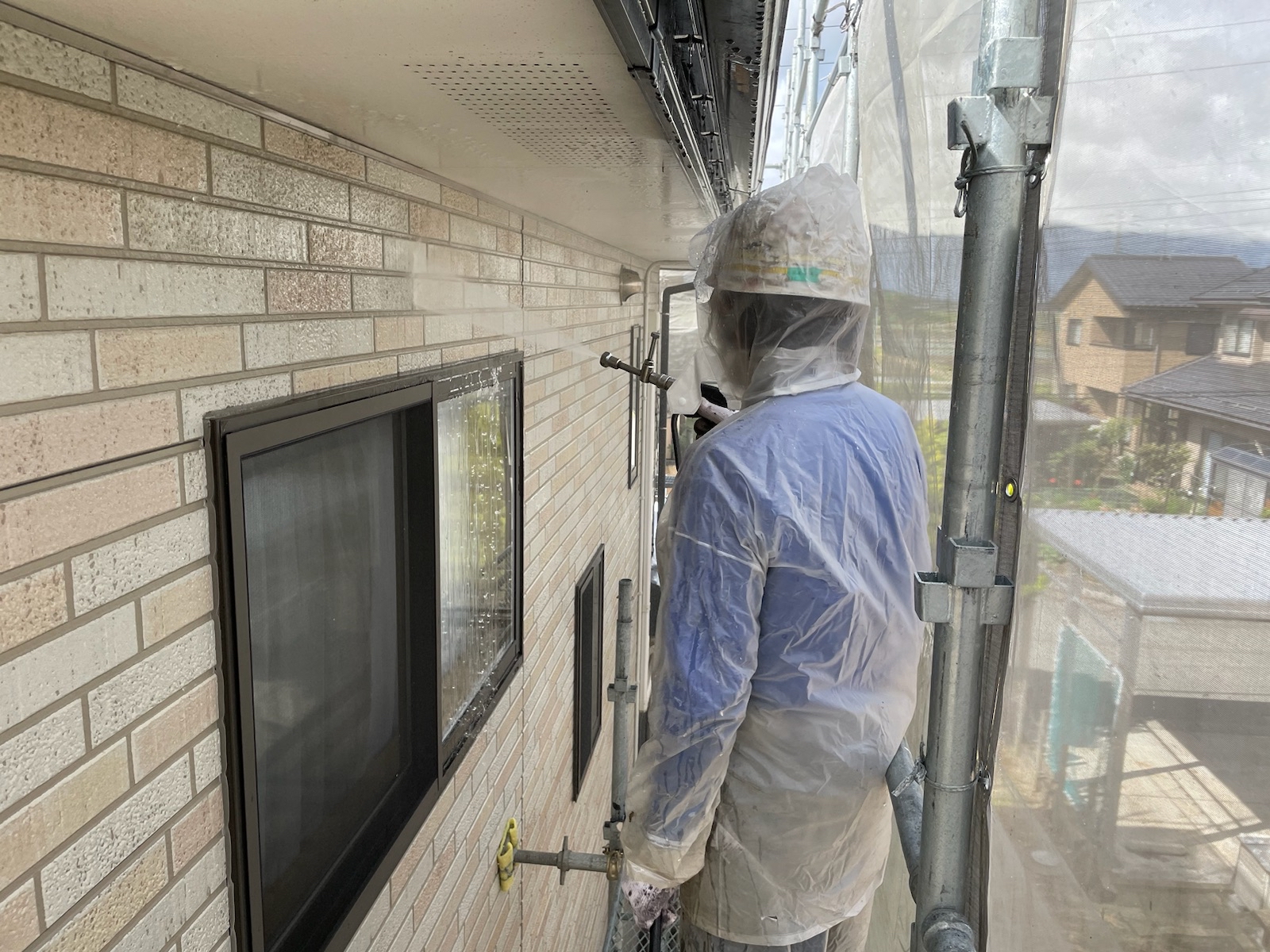 高圧洗浄作業中:古い塗膜や汚れ等を丁寧に落としていきます。