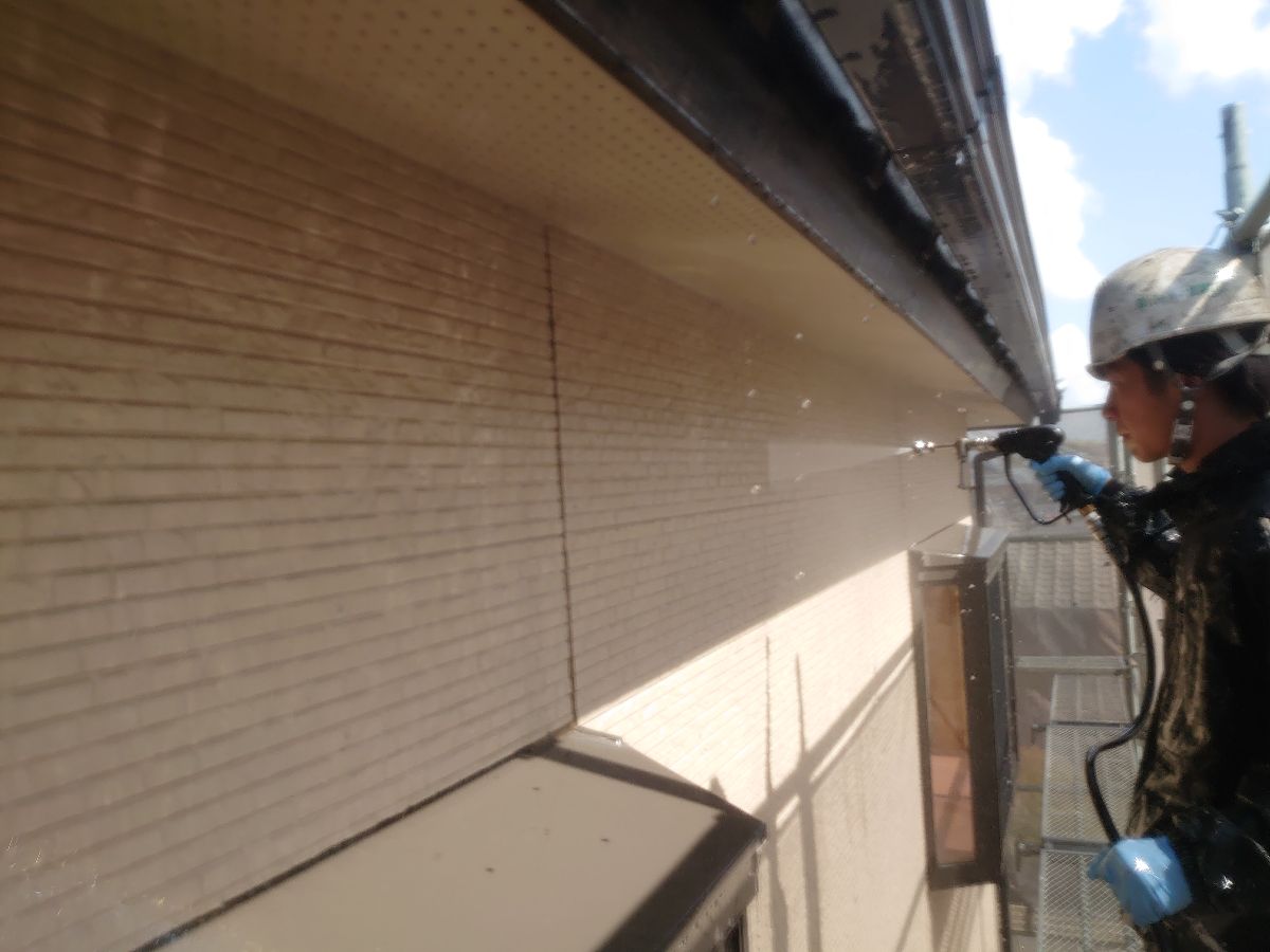 高圧洗浄作業中:古い塗膜や汚れなどを綺麗に洗います。