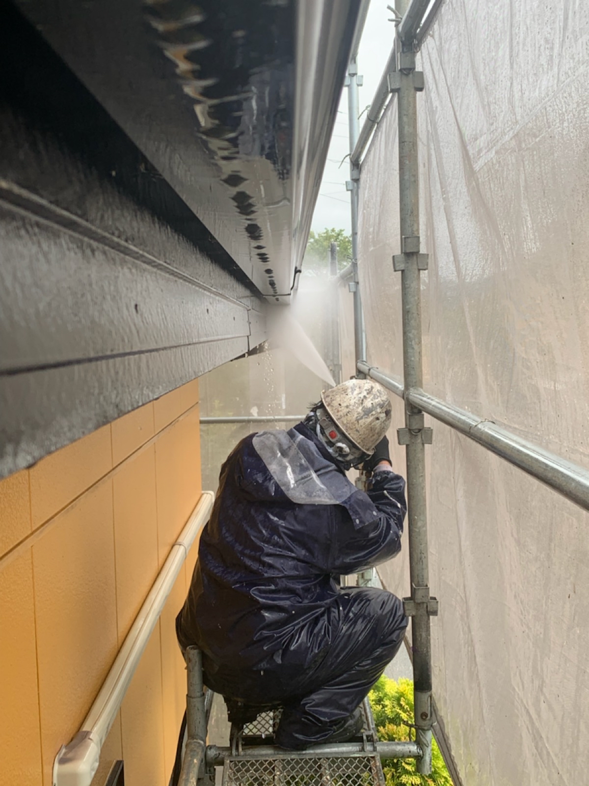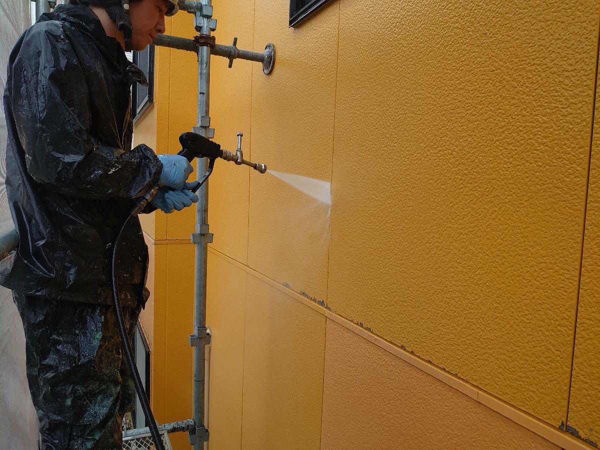 高圧洗浄作業中:古い塗膜や汚れなどを綺麗に洗います。