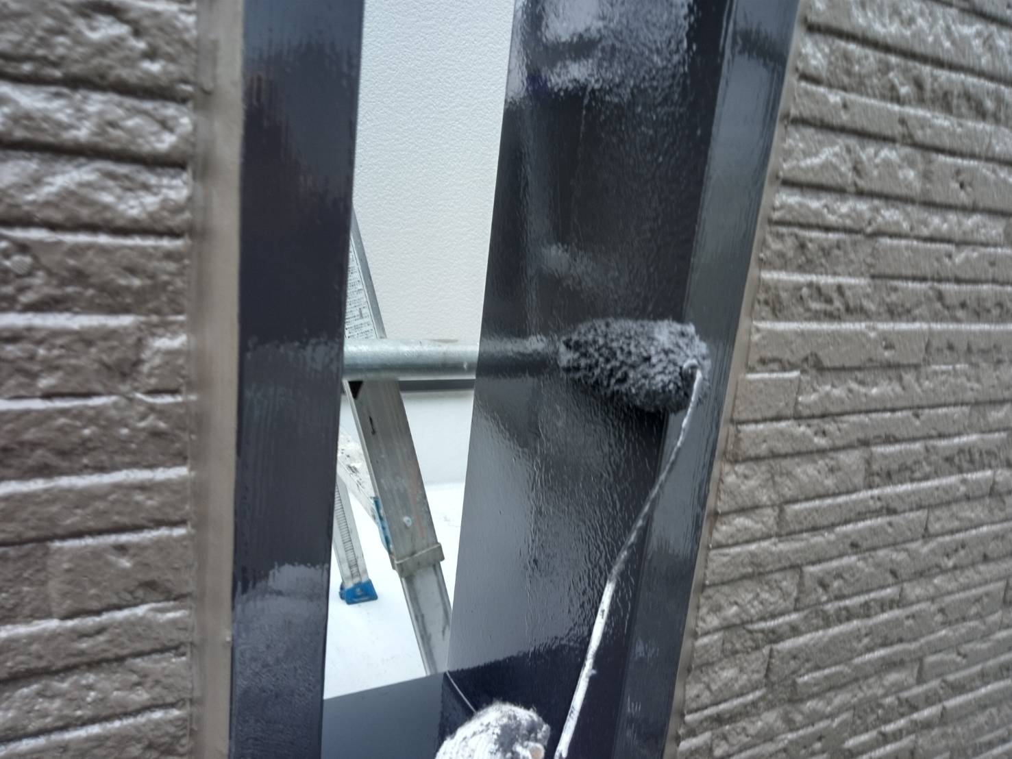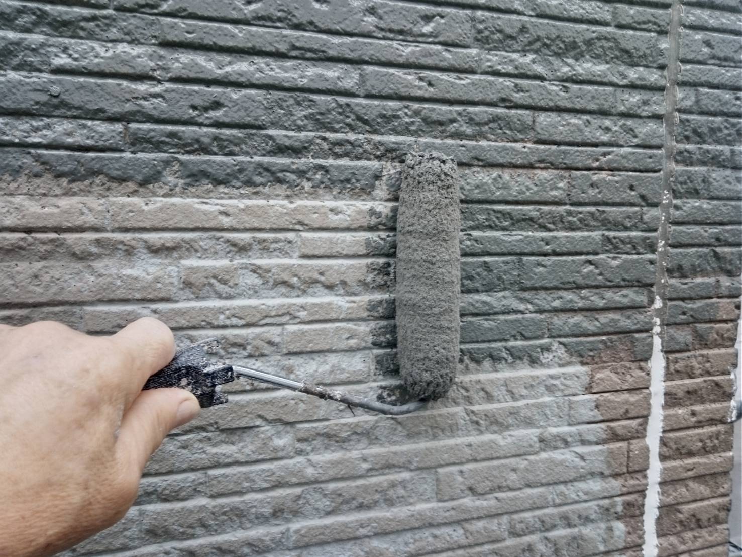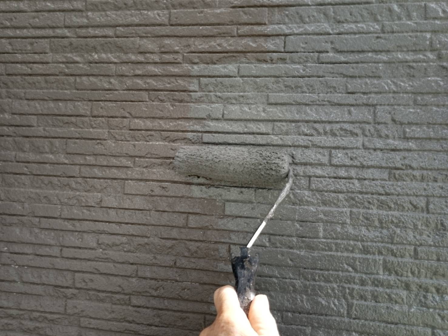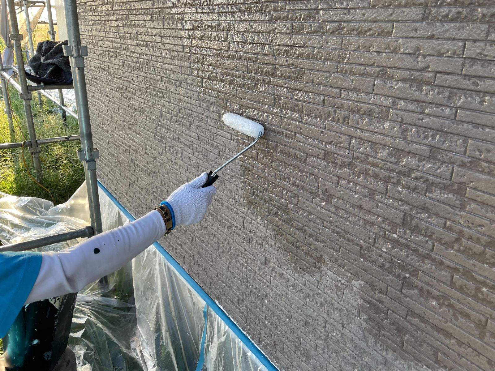 外壁:上塗り作業中。上塗り材は、アステックペイントの超低汚染プラチナリファイン2000MF-IRを使用しました。