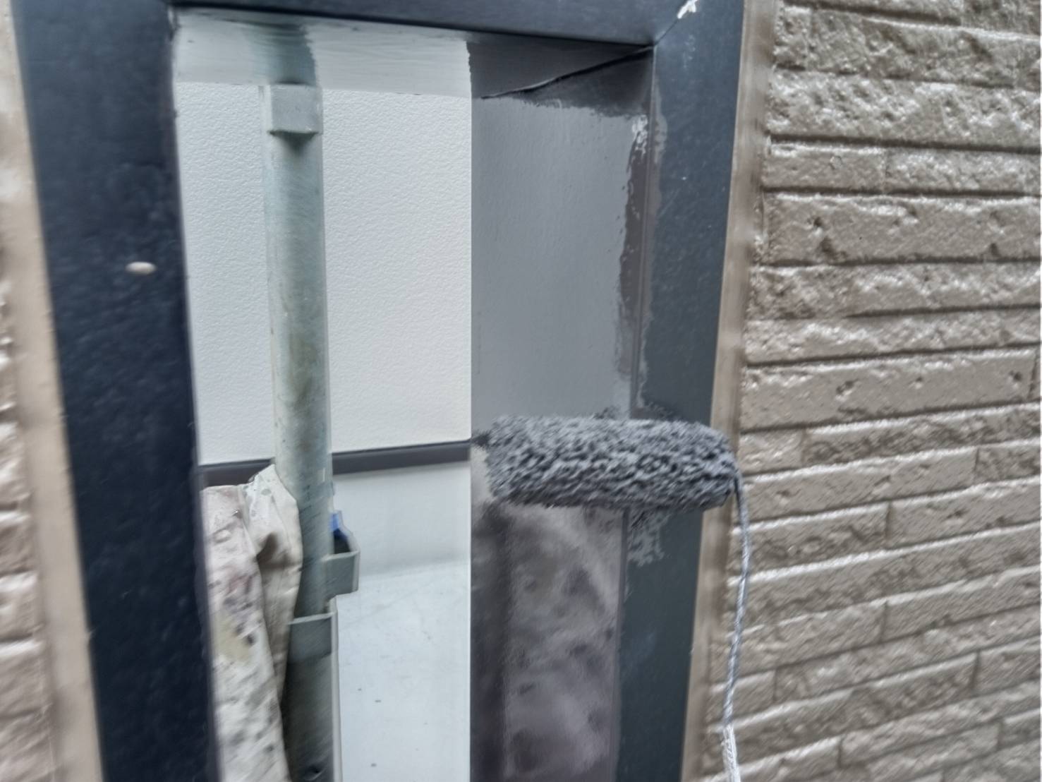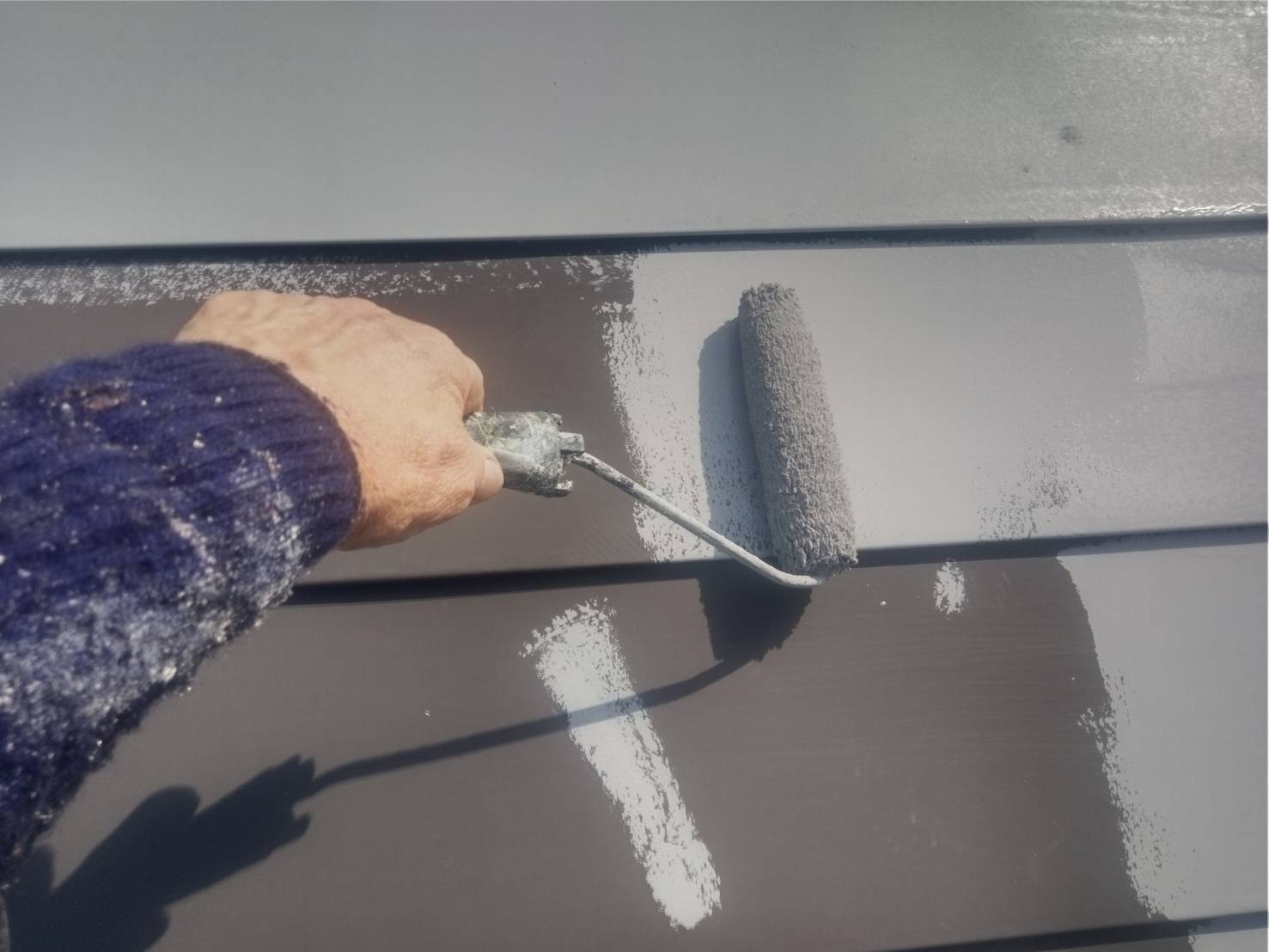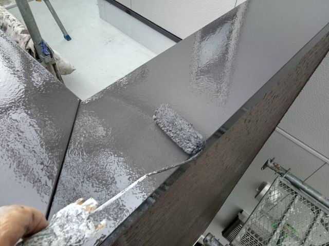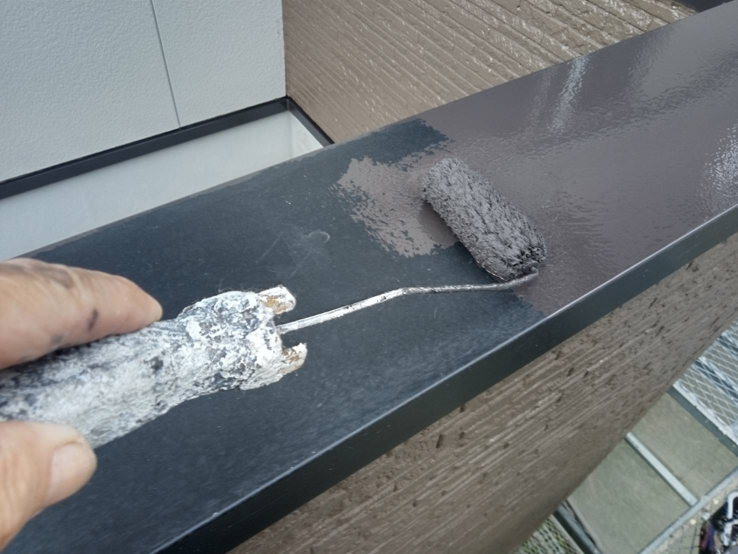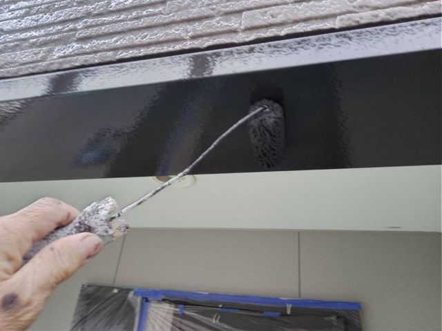 外壁:上塗り作業中。上塗り材は、アステックペイントの超低汚染プラチナリファイン2000MF-IRを使用しました。