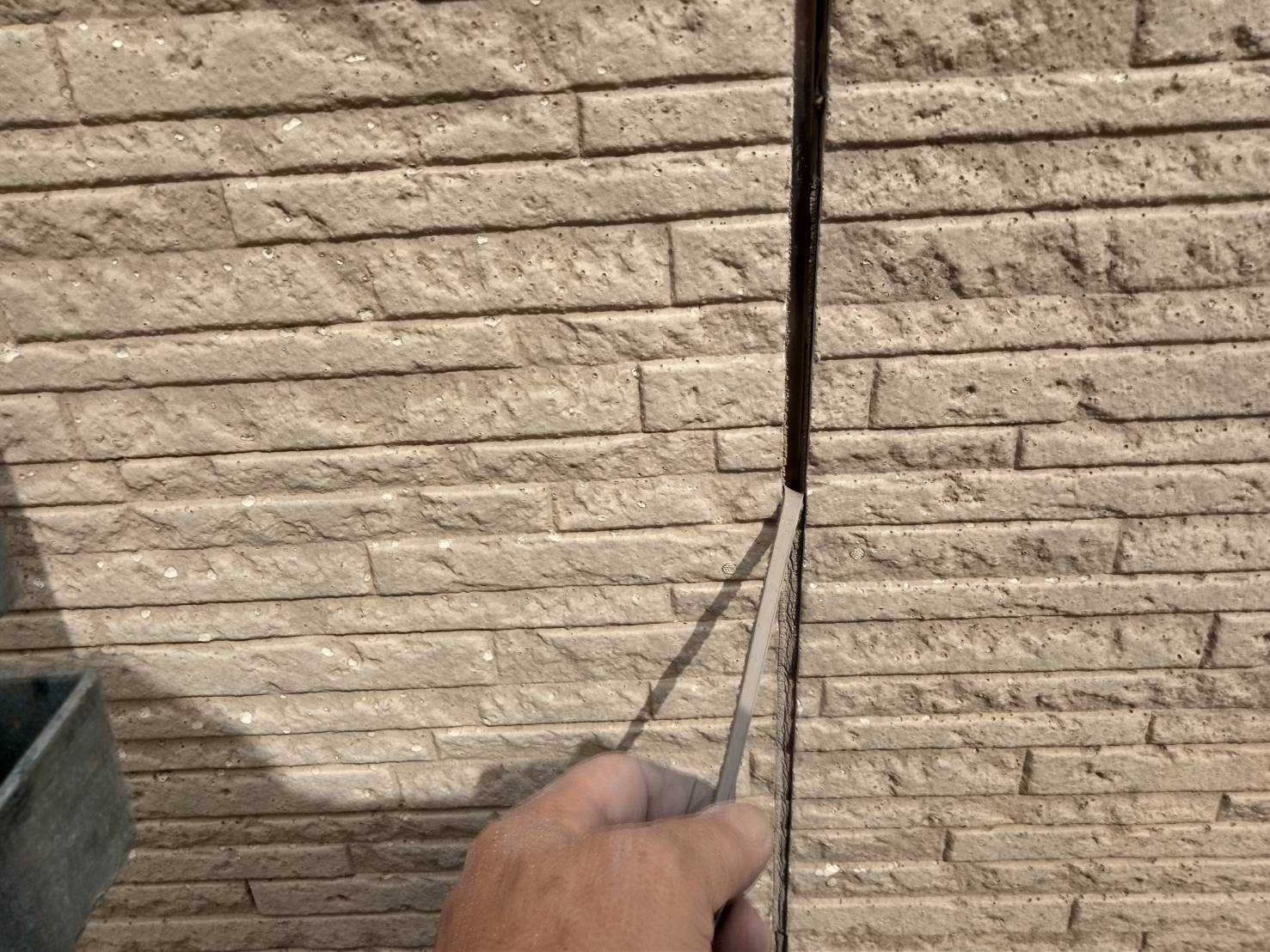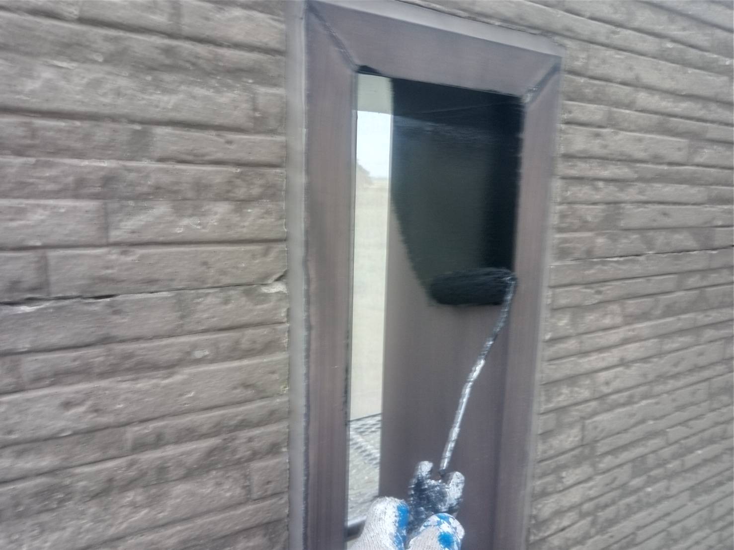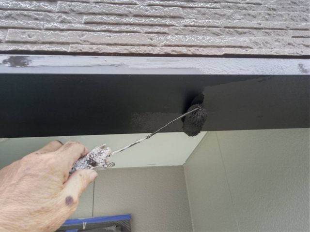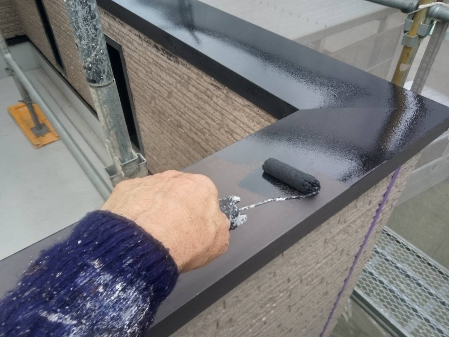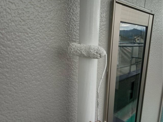 外壁:上塗り作業中。上塗り材は、アステックペイントの超低汚染プラチナリファイン2000MF-IRを使用しました。