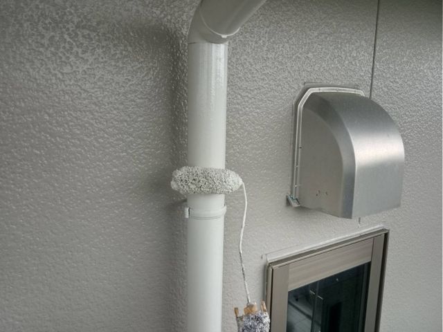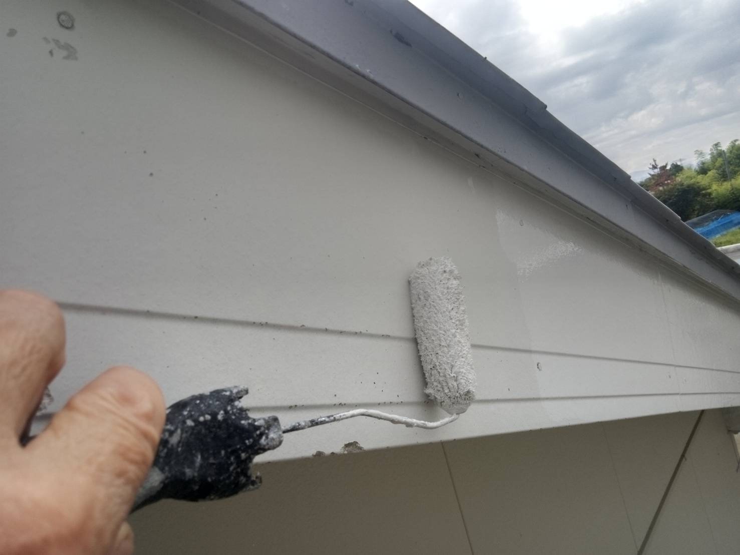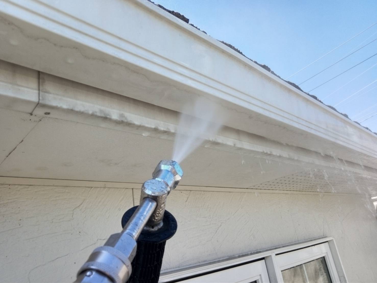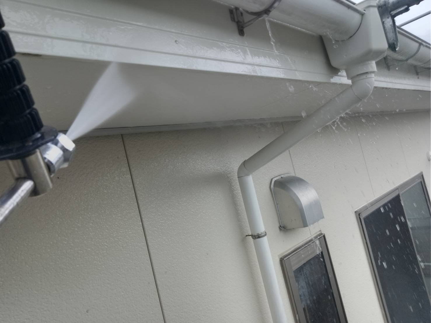 軒天:軒天の高圧洗浄作業中。古い塗膜や汚れ等を丁寧に落としていきます。