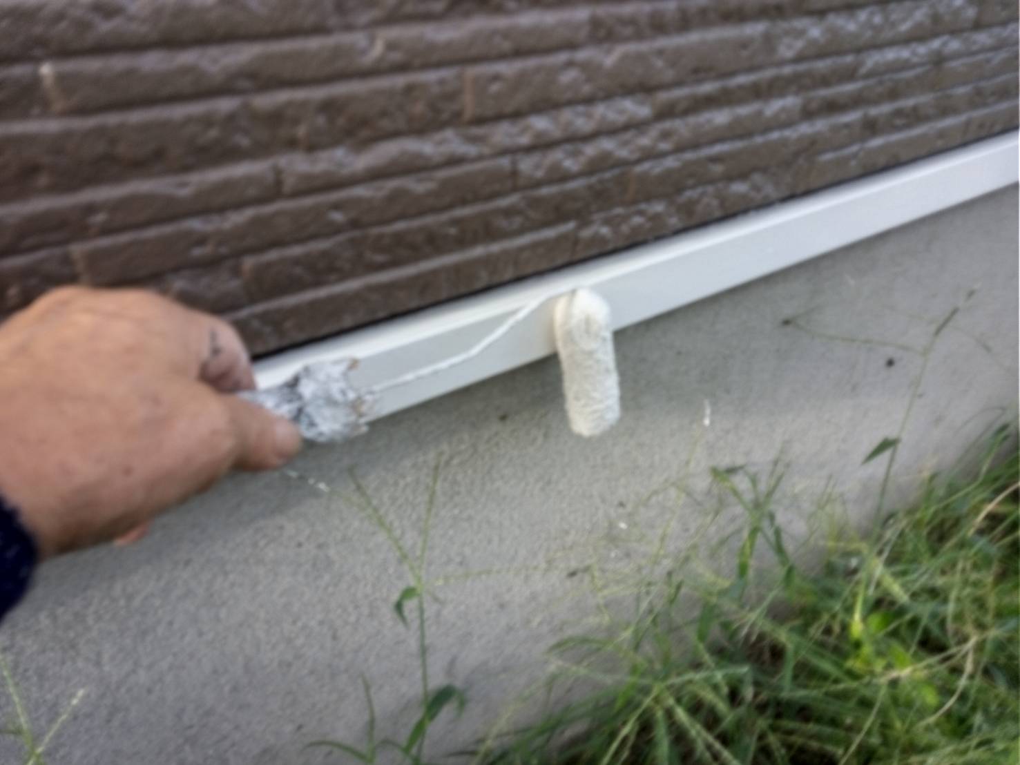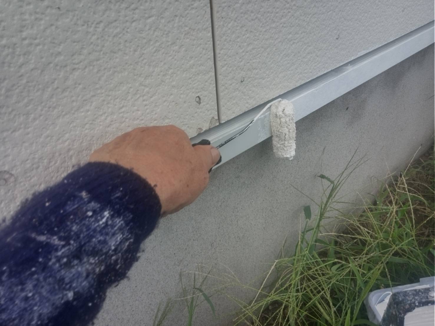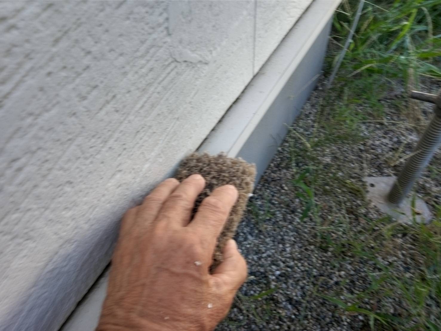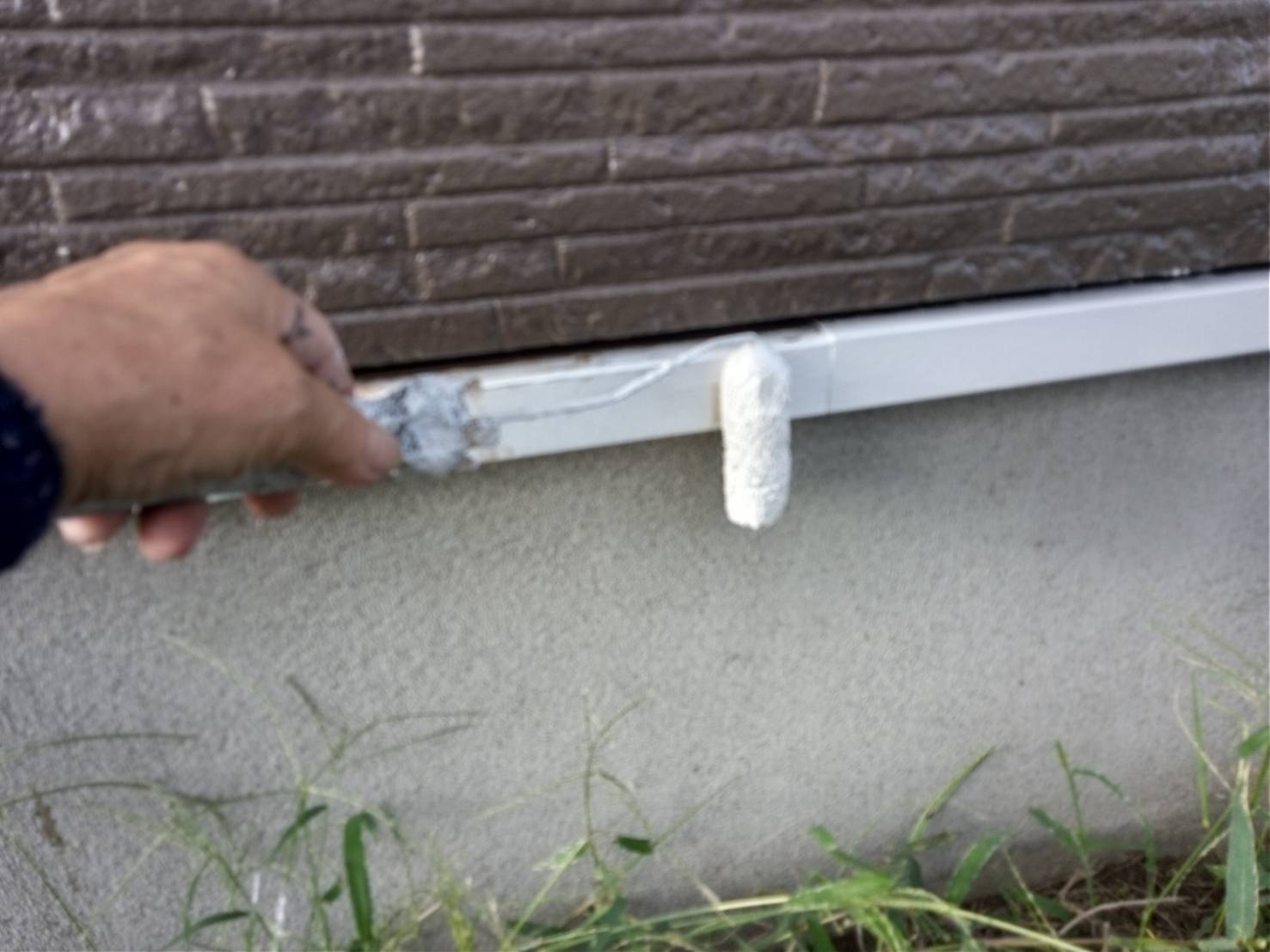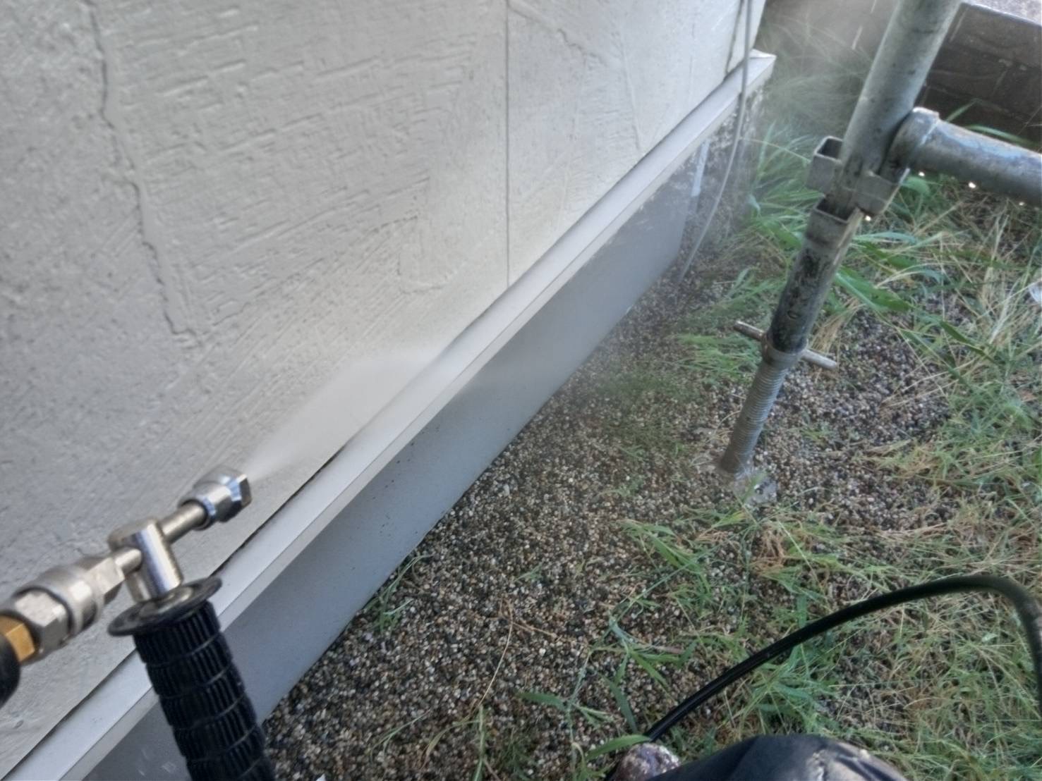 土台水切り:土台水切りの高圧洗浄作業中。古い塗膜や汚れ等を丁寧に落としていきます。