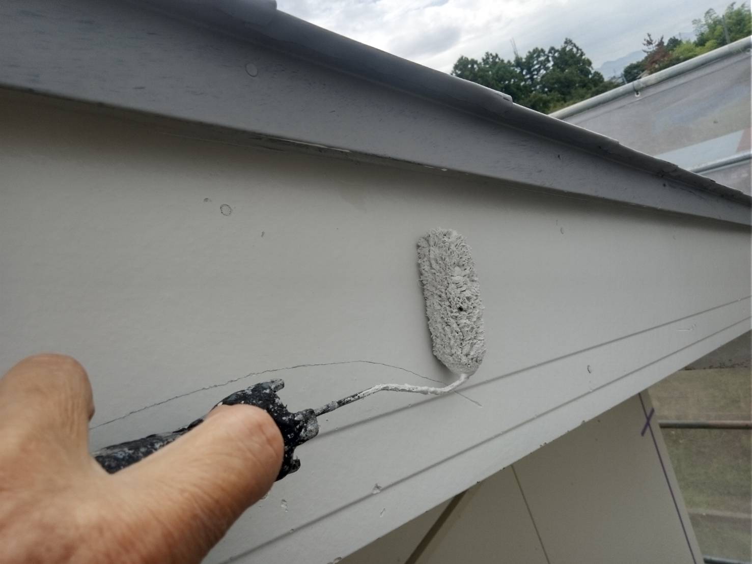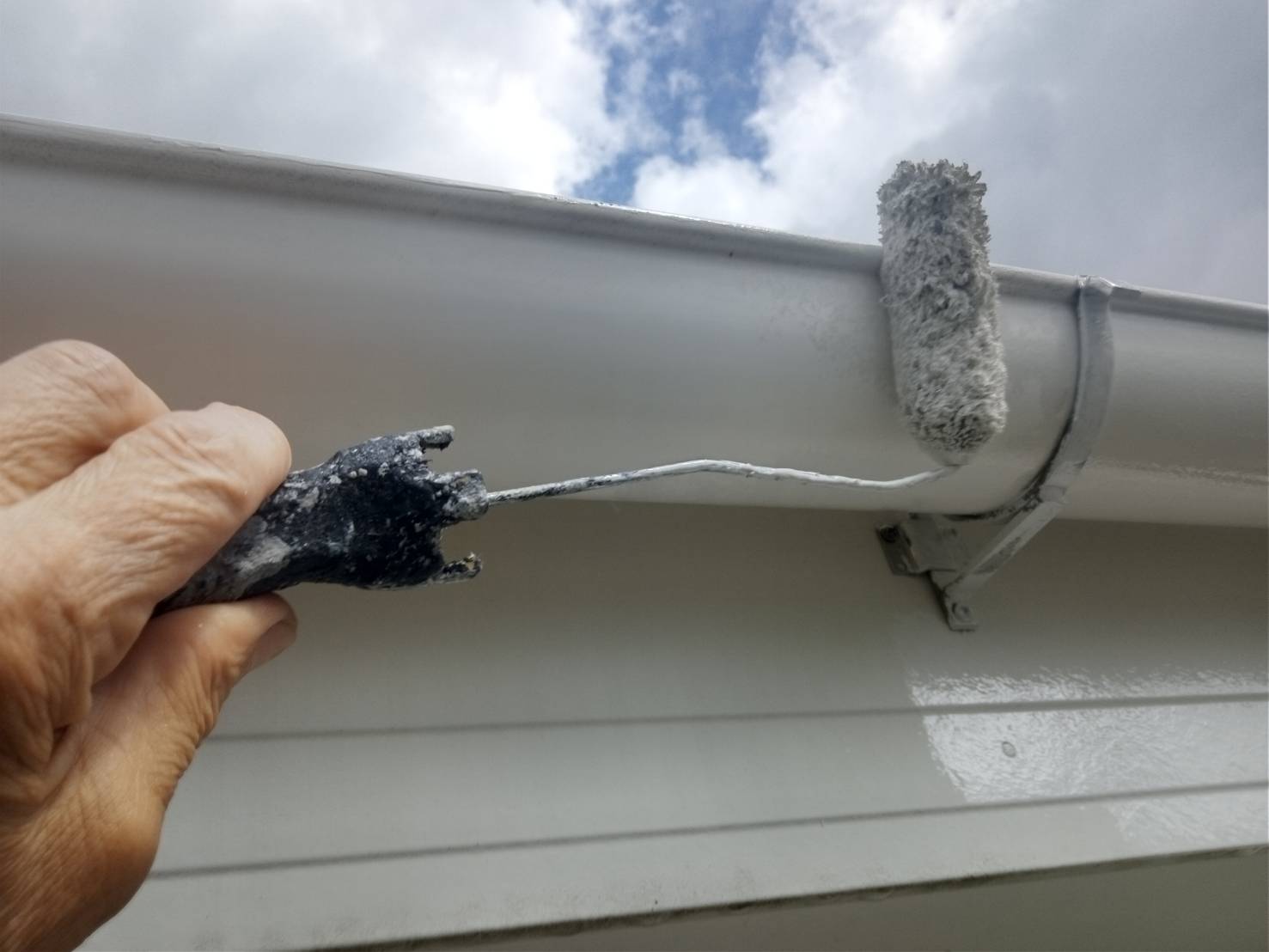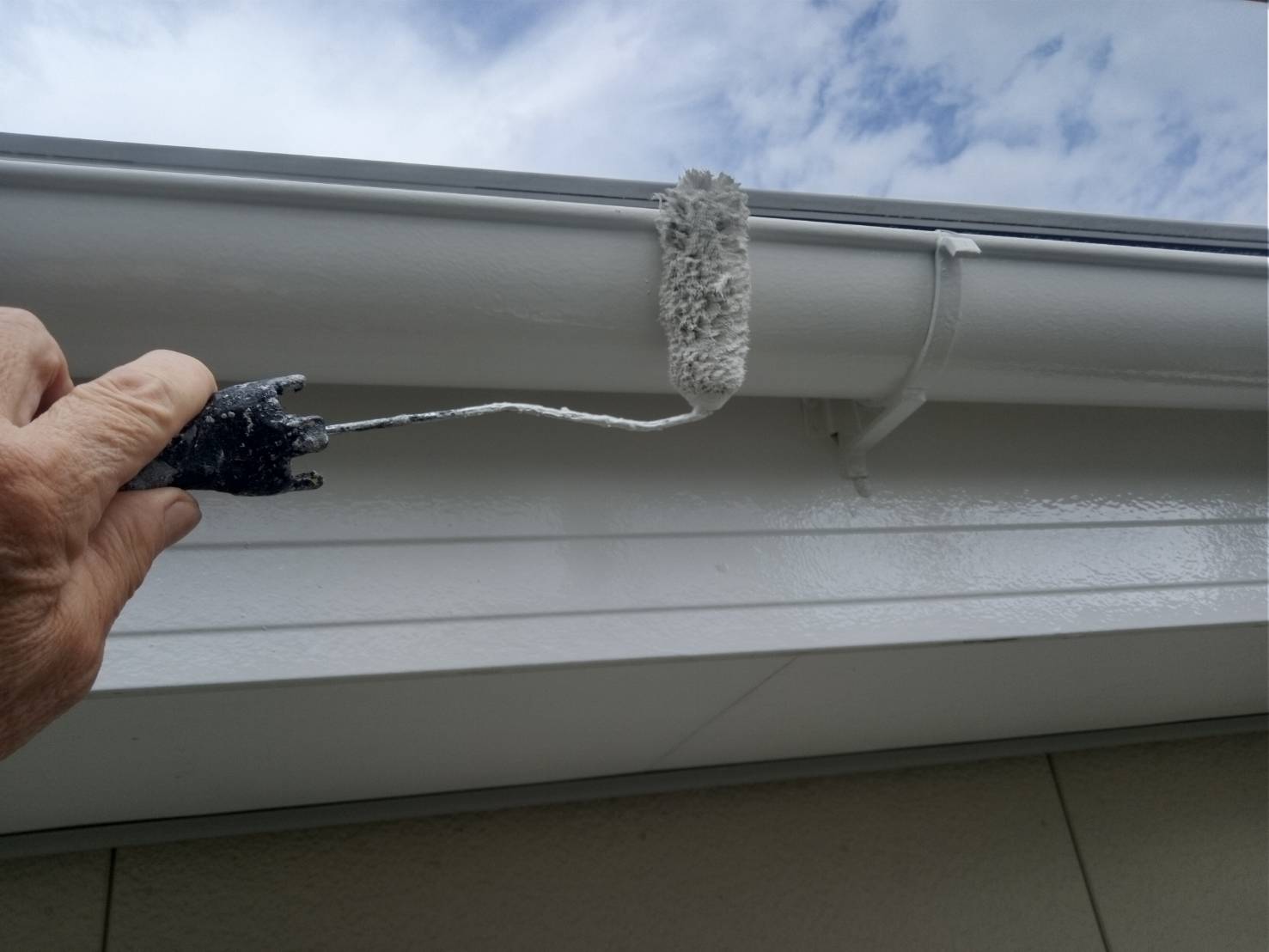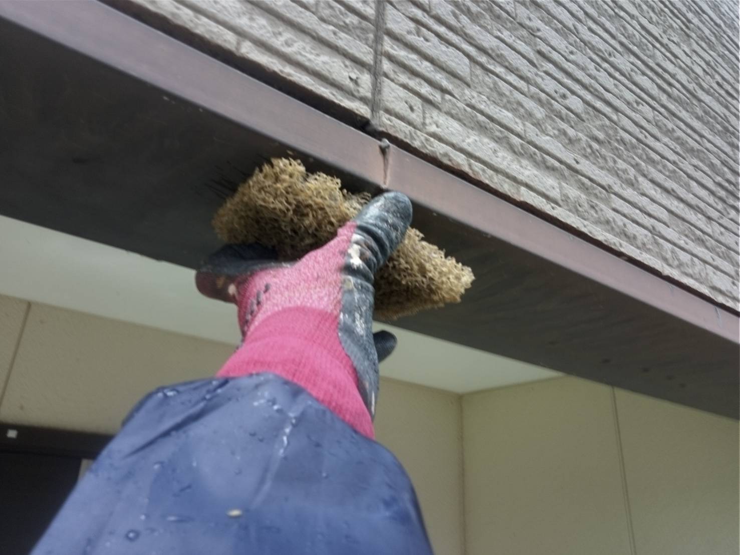 軒樋:軒樋の高圧洗浄作業中。古い塗膜や汚れ等を丁寧に落としていきます。