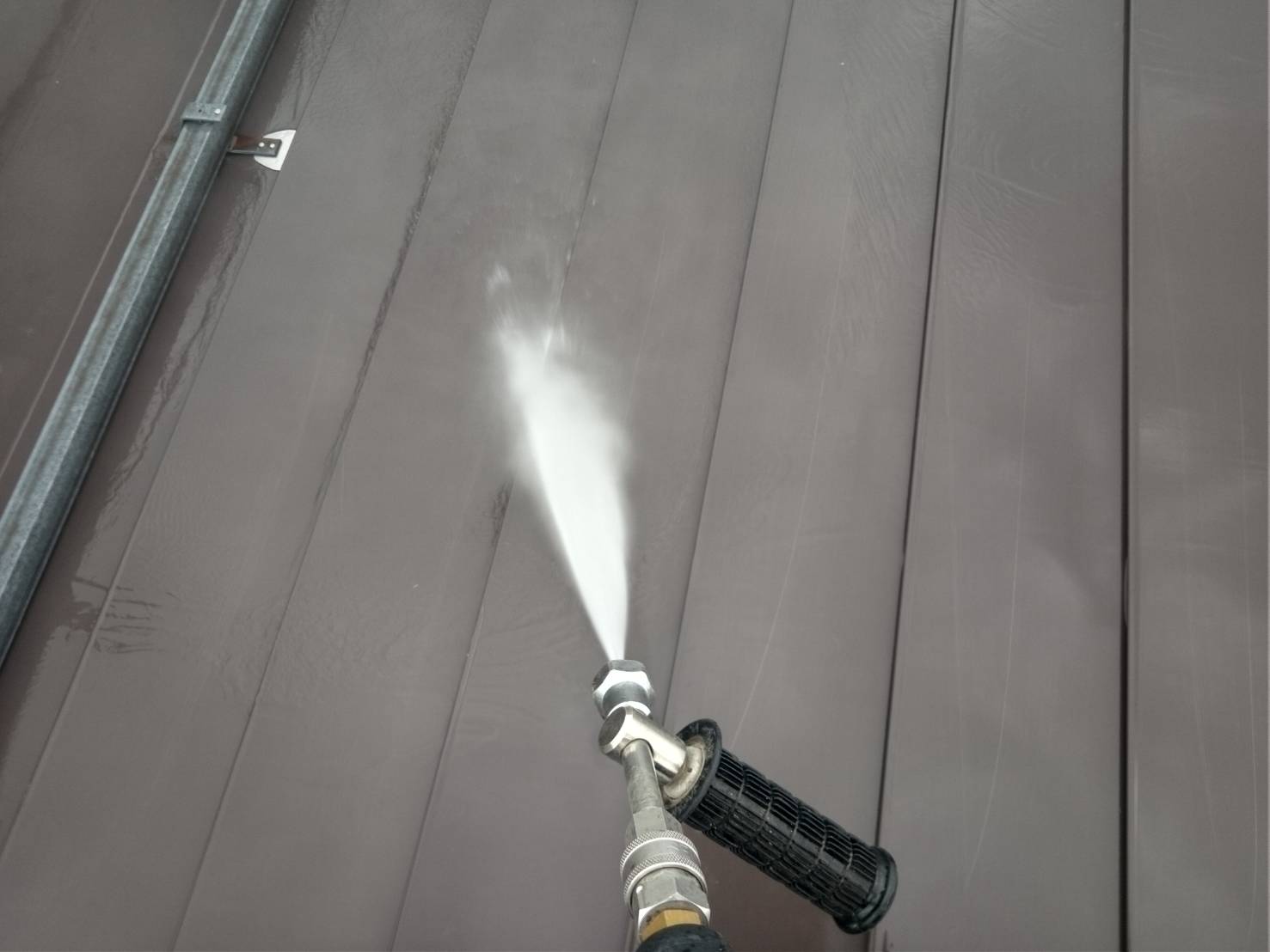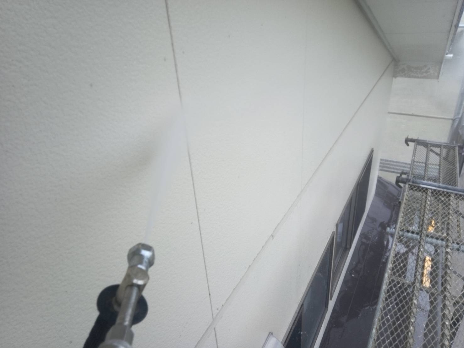 高圧洗浄作業中:古い塗膜や汚れ等を丁寧に落としていきます。