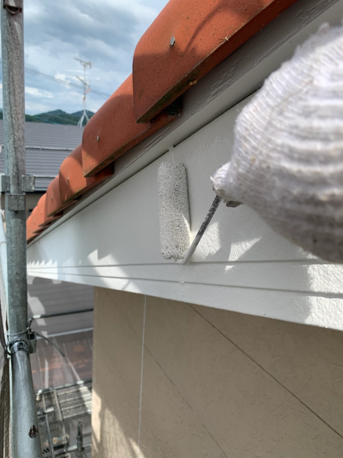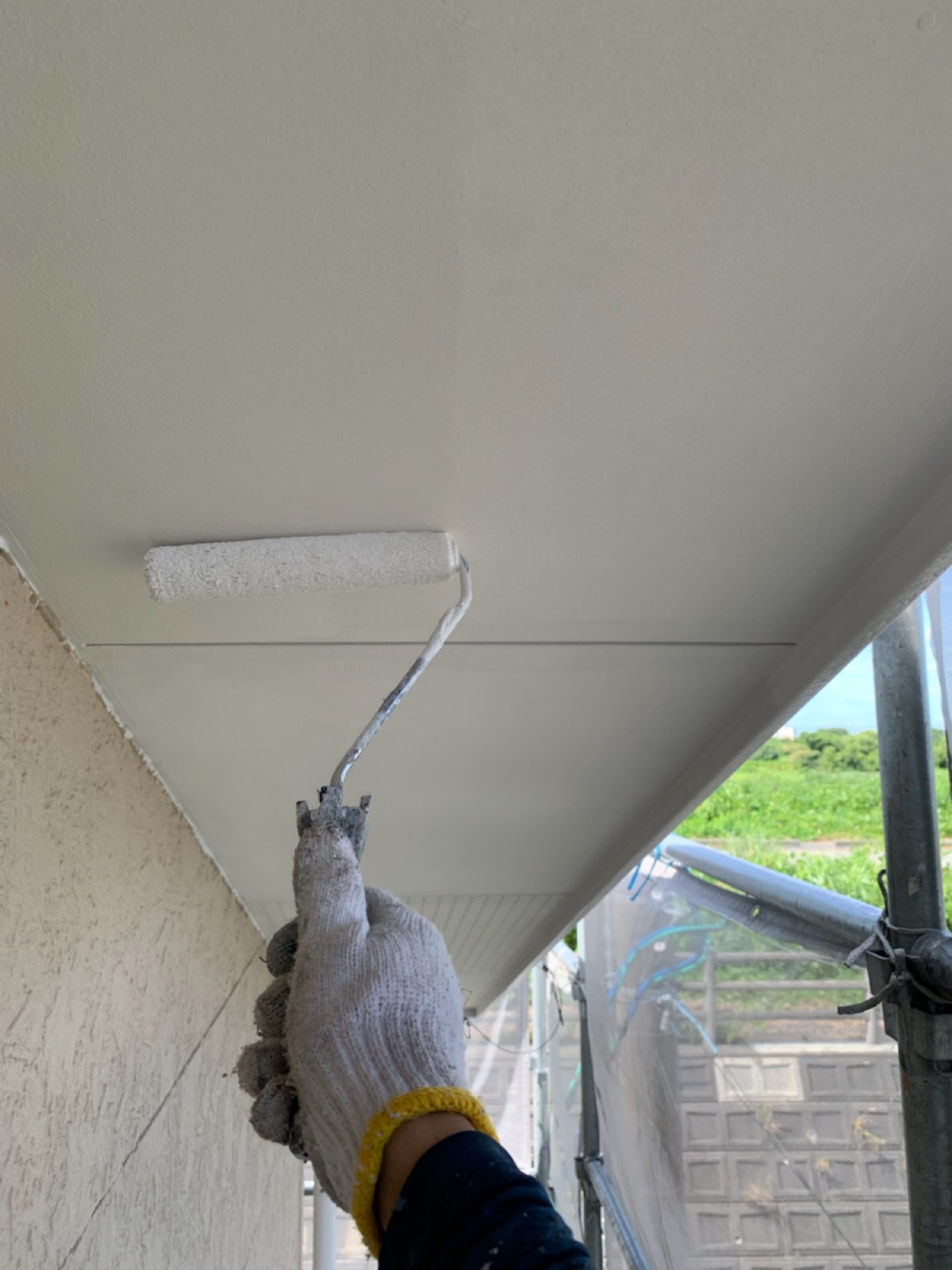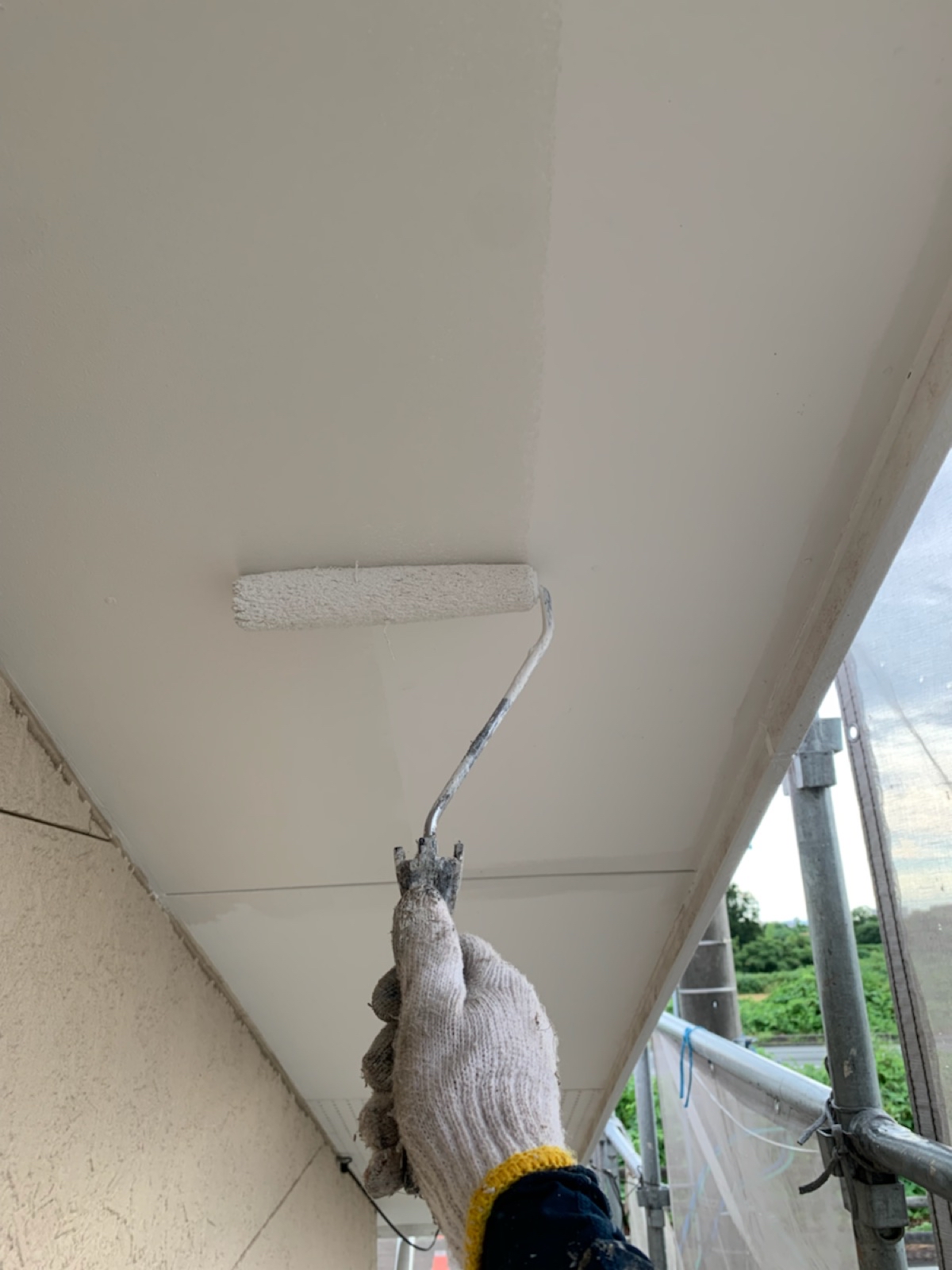 軒天:上塗り作業中
